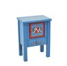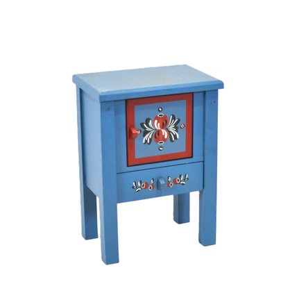 Charming small wooden cabinet in blue with a red door and traditional Scandinavian-style floral motifs. Features one hinged door and a lower faux drawer for decorative appeal.