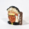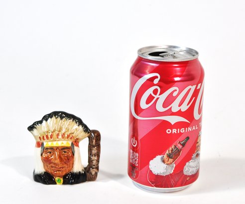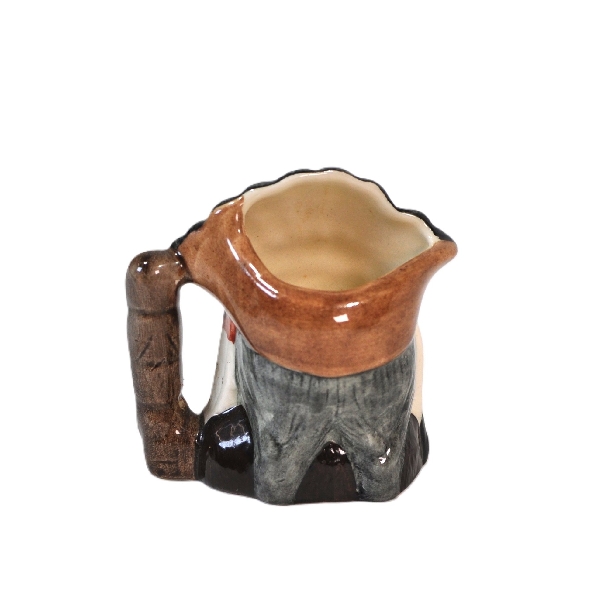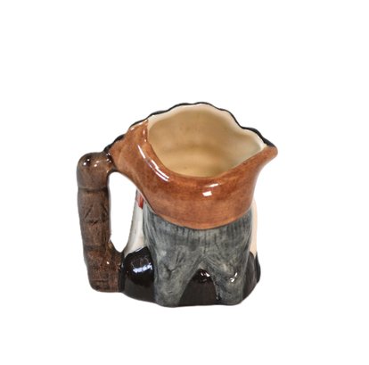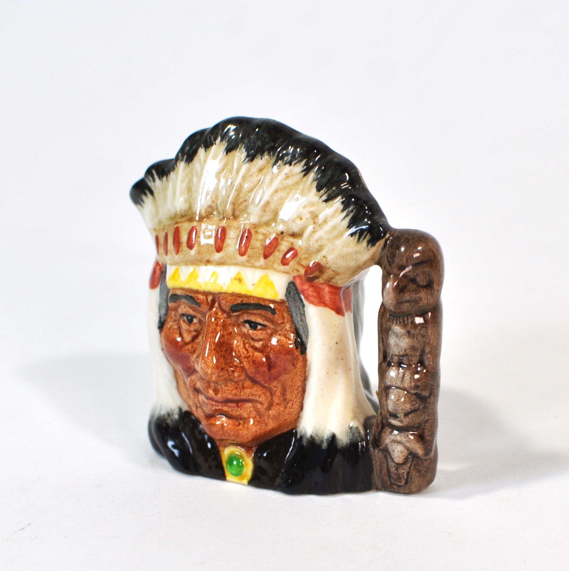 Vintage ceramic character creamer jug by Royal Doulton, depicting a stylized “North American Indian” figure, as titled by the maker. Features molded facial details, feathered headdress spout, and branch-form handle.