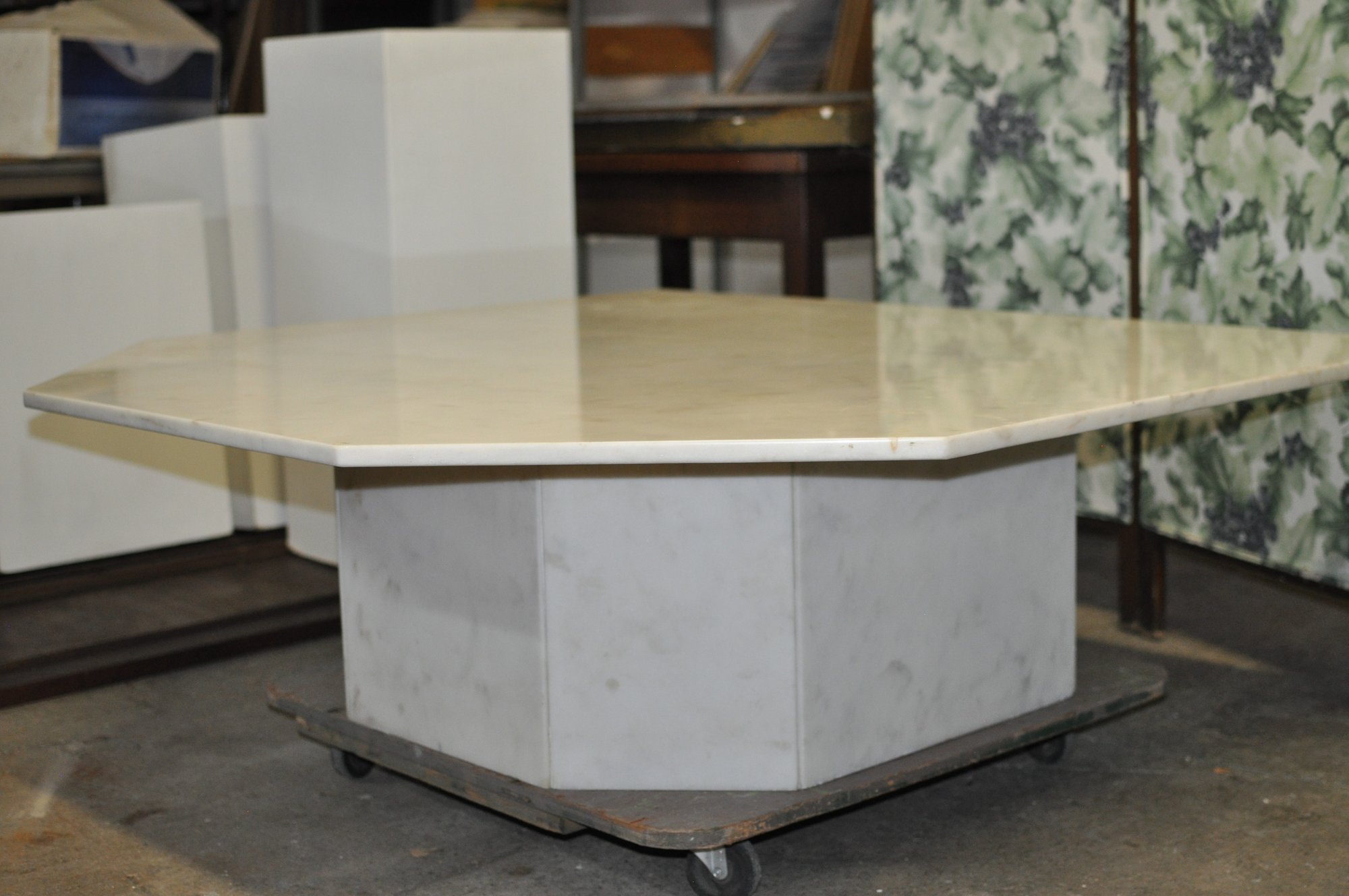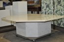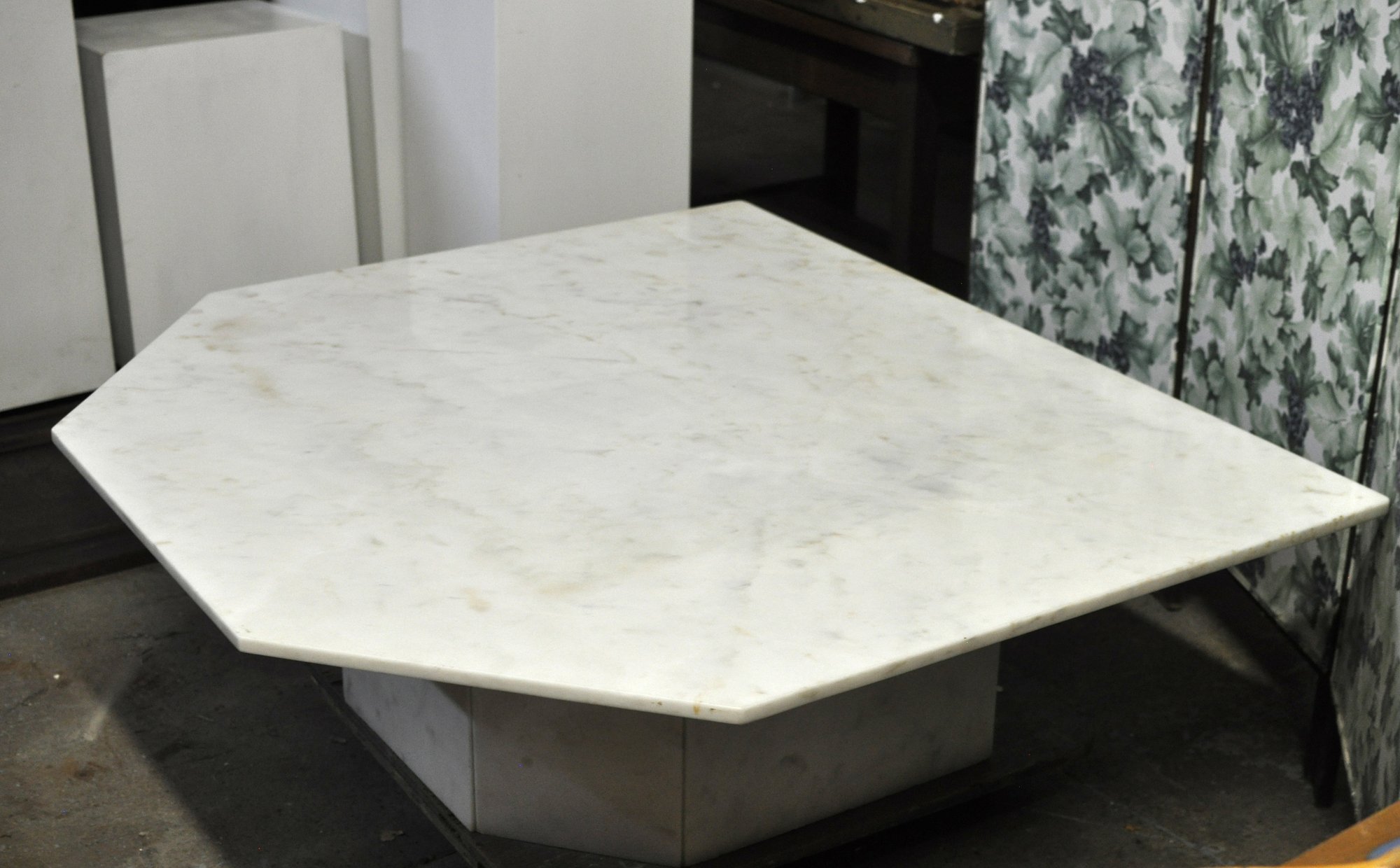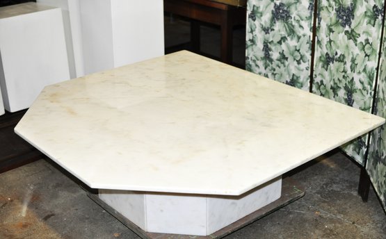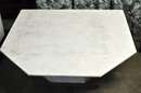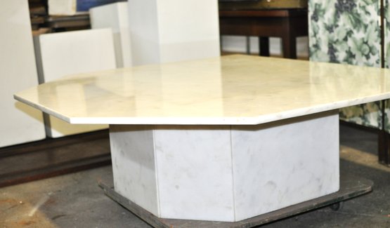 Impressive vintage coffee table featuring a thick octagonal white marble top with soft natural veining, set on a substantial matching marble pedestal base. The clean geometric form and solid stone construction give the piece a timeless modern look that works well in mid-century, contemporary, or classic interiors.