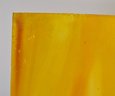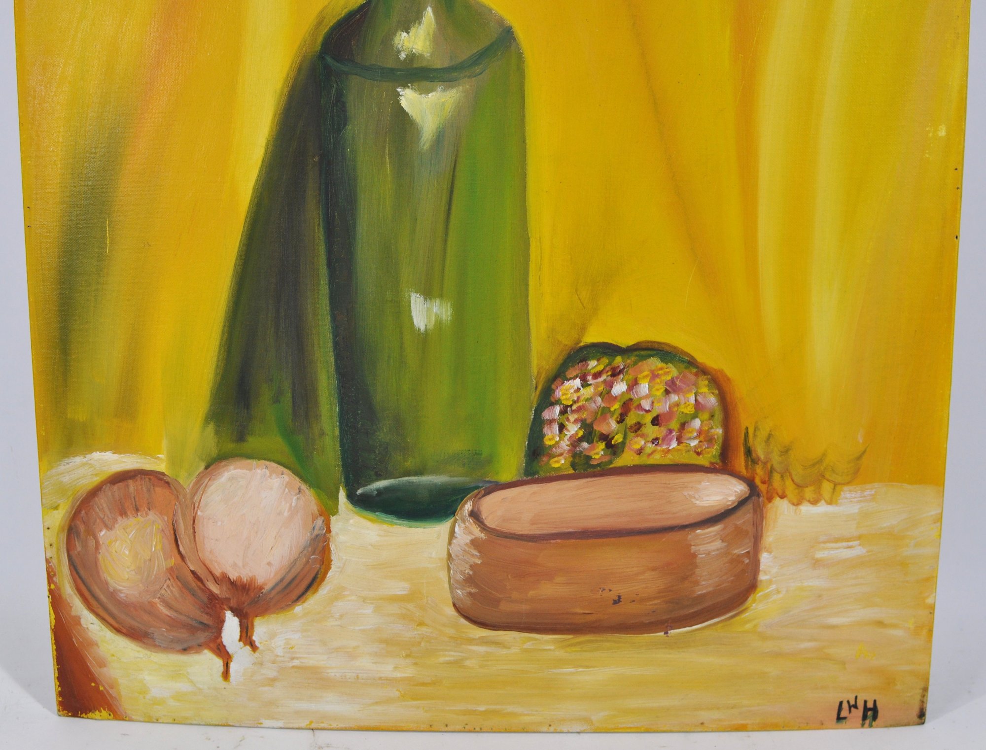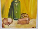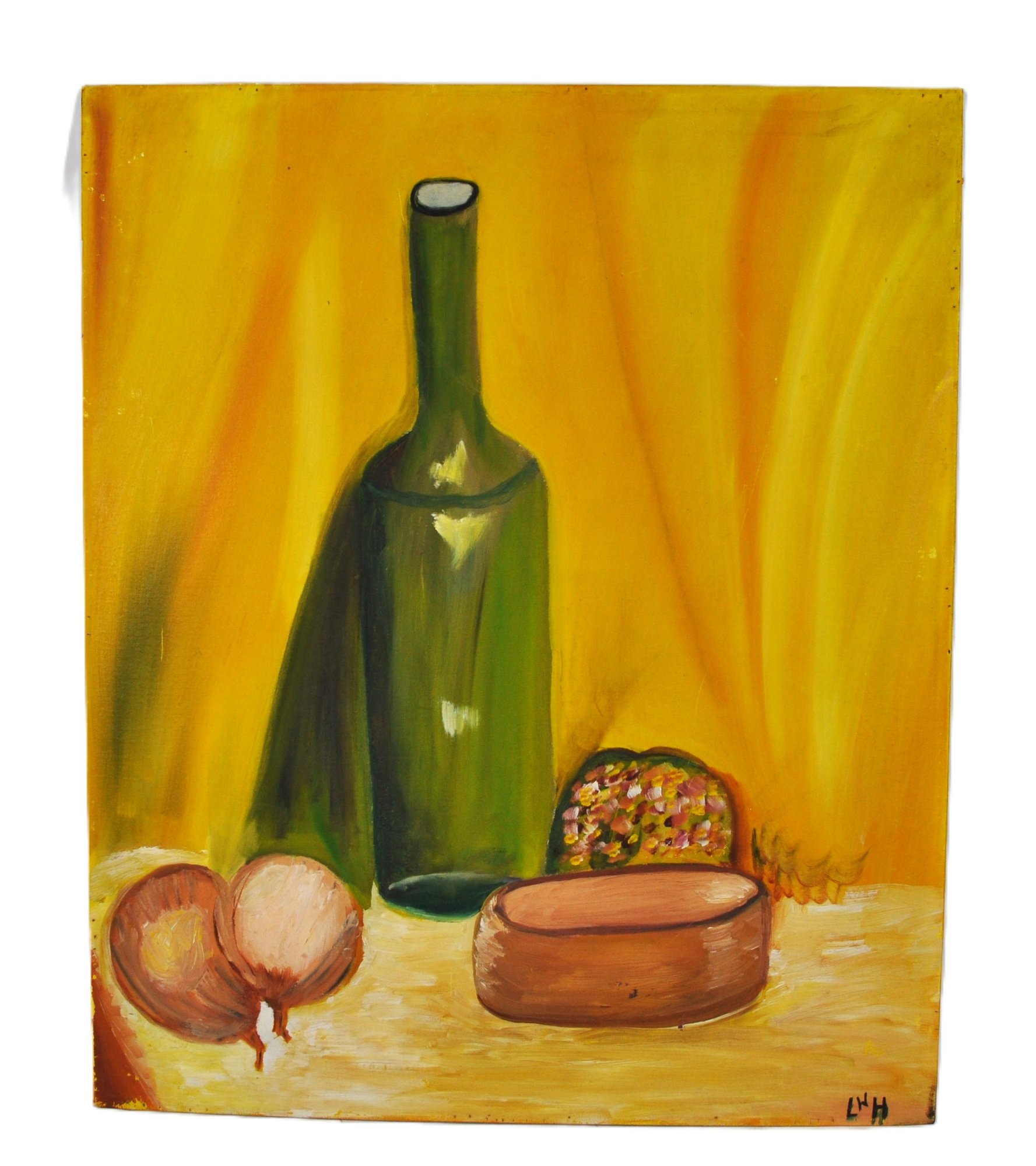 Expressive modern still life painting depicting a green bottle, cheese wheel, sliced pomegranate, and fruit arranged on a tabletop. The composition is set against a warm yellow and orange background with loose, painterly brushwork that gives the piece a bold, decorative presence.