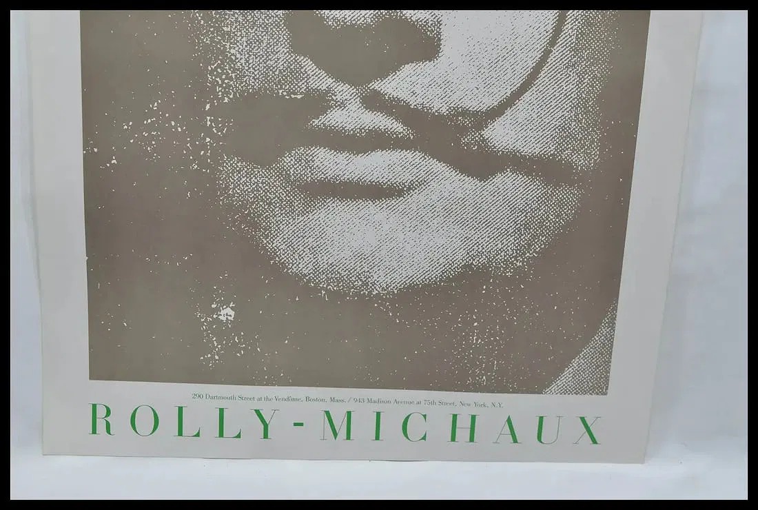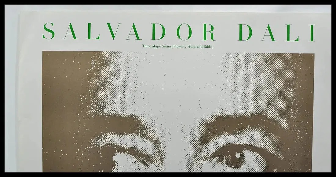 Original vintage Salvador Dali art exhibition poster. The top reads "SALVADOR DALI," and below the portrait it says "ROLLY-MICHAUX" — a gallery known for handling high-profile exhibitions in Boston and New York in the 1970s and 1980s.It also mentions "Three Major Series: Flowers, Fruits, and Bibles," which were themes in Dalí's later works.