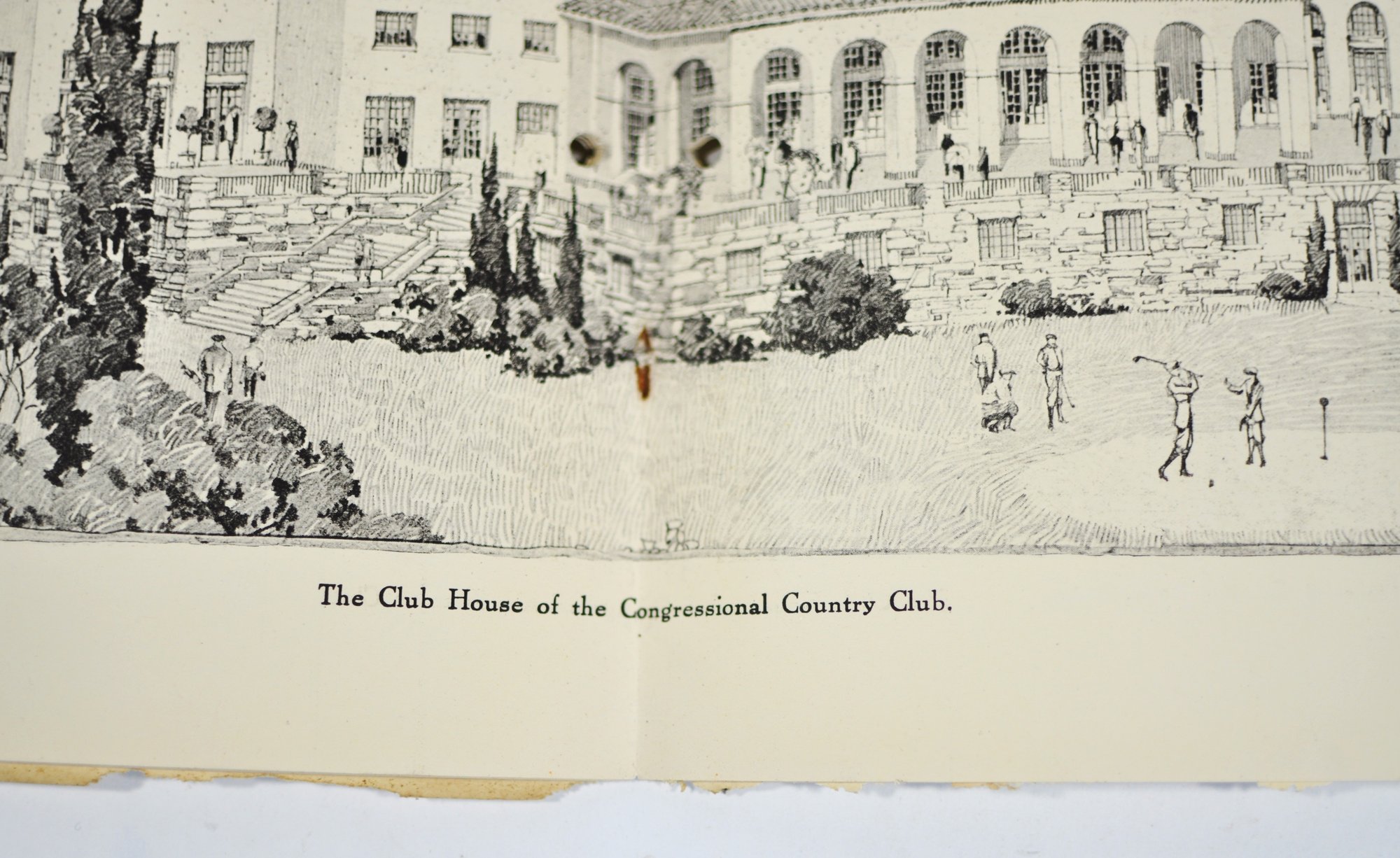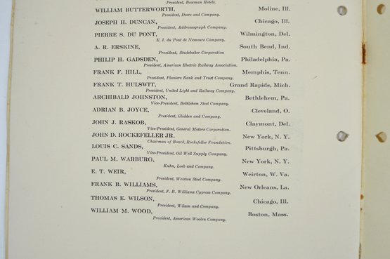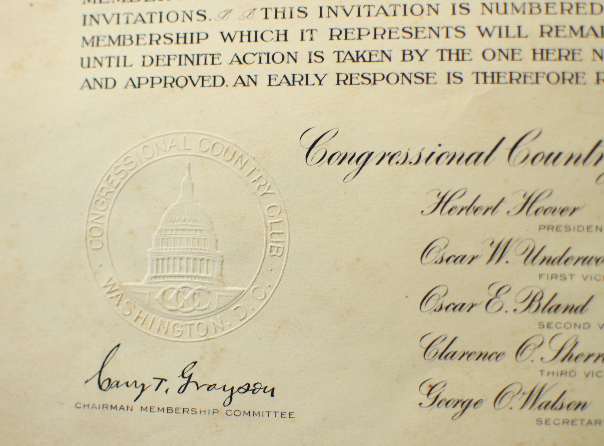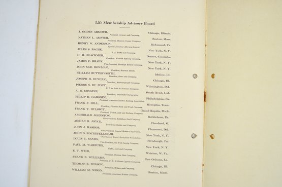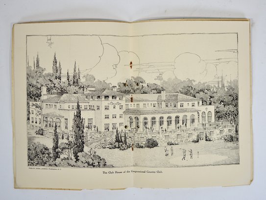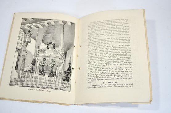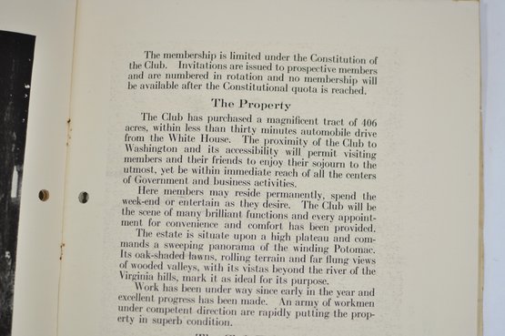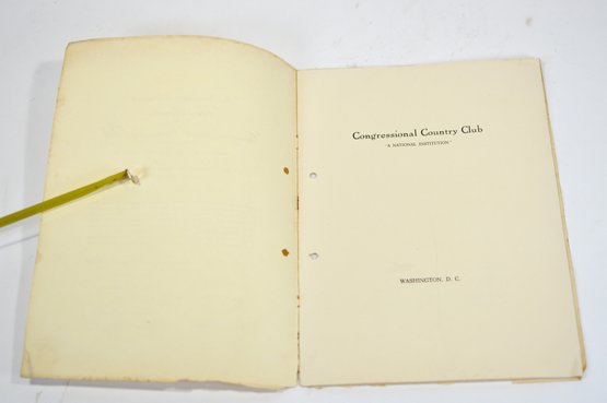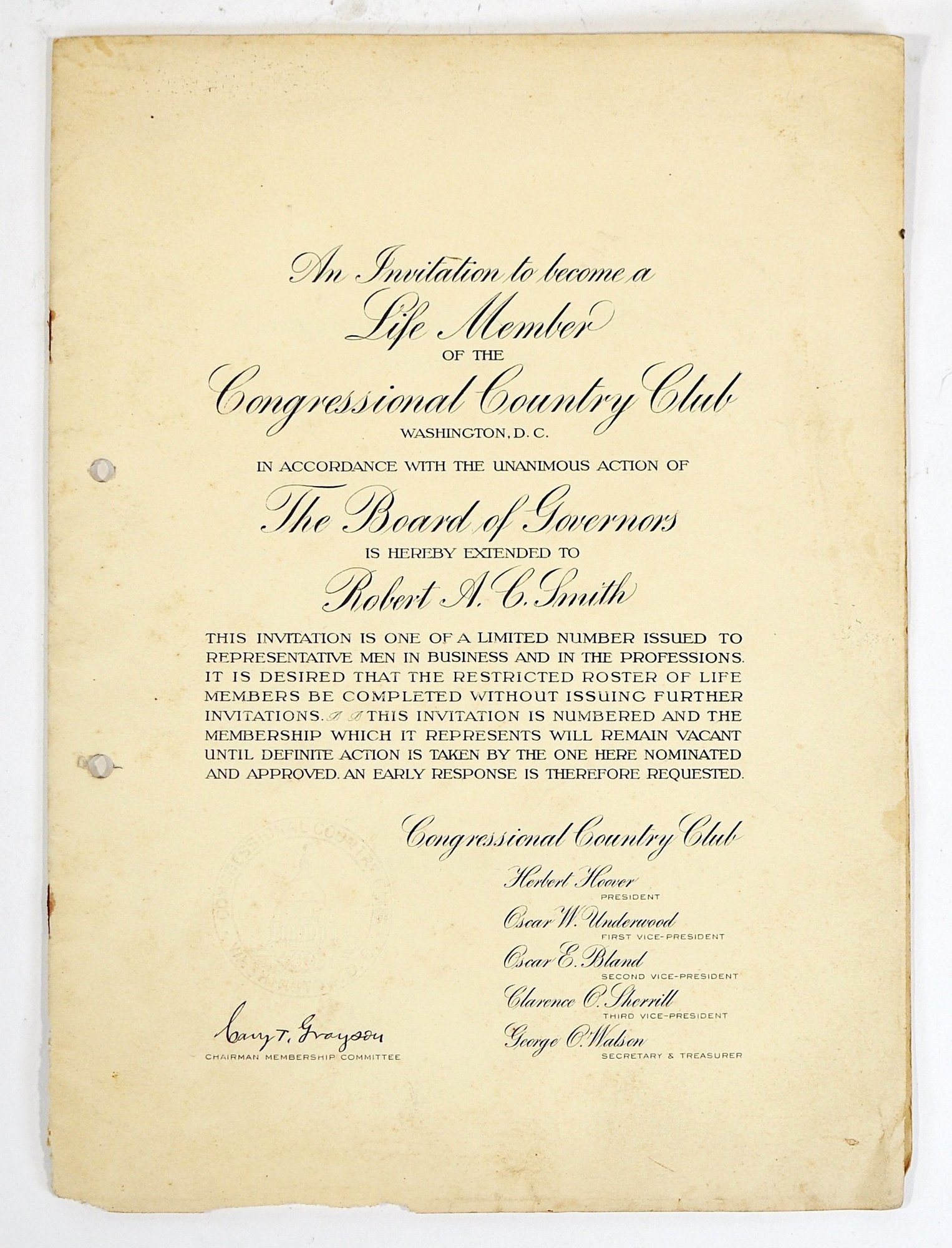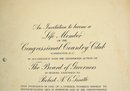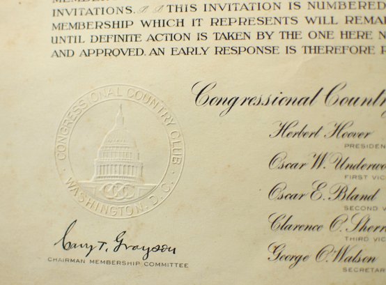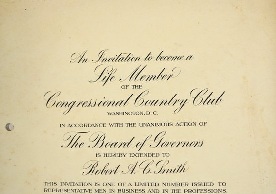 Offered is an original vintage invitation to become a Life Member of the Congressional Country Club, Washington, D.C., issued in accordance with the unanimous action of the Board of Governors. The invitation is personalized to Robert A. C. Smith and notes that it was part of a limited, numbered issue extended to prominent figures in business and the professions.Notably, the club president listed is Herbert Hoover, who would later become the 31st President of the United States, adding significant historical interest to the piece. The membership and advisory board rosters also include nationally prominent individuals, among them John D. Rockefeller Jr., one of the most influential American industrialists and philanthropists of the era. The invitation features elegant script and serif typography, along with an embossed seal of the Congressional Country Club. Interior pages list officers, governors, and advisory board members and include descriptive text and illustrations detailing the club’s facilities and its role as a national institution in Washington, D.C.Loose-leaf format with original punched holes, likely once housed in a presentation binder or folder. Size 11" x 8".