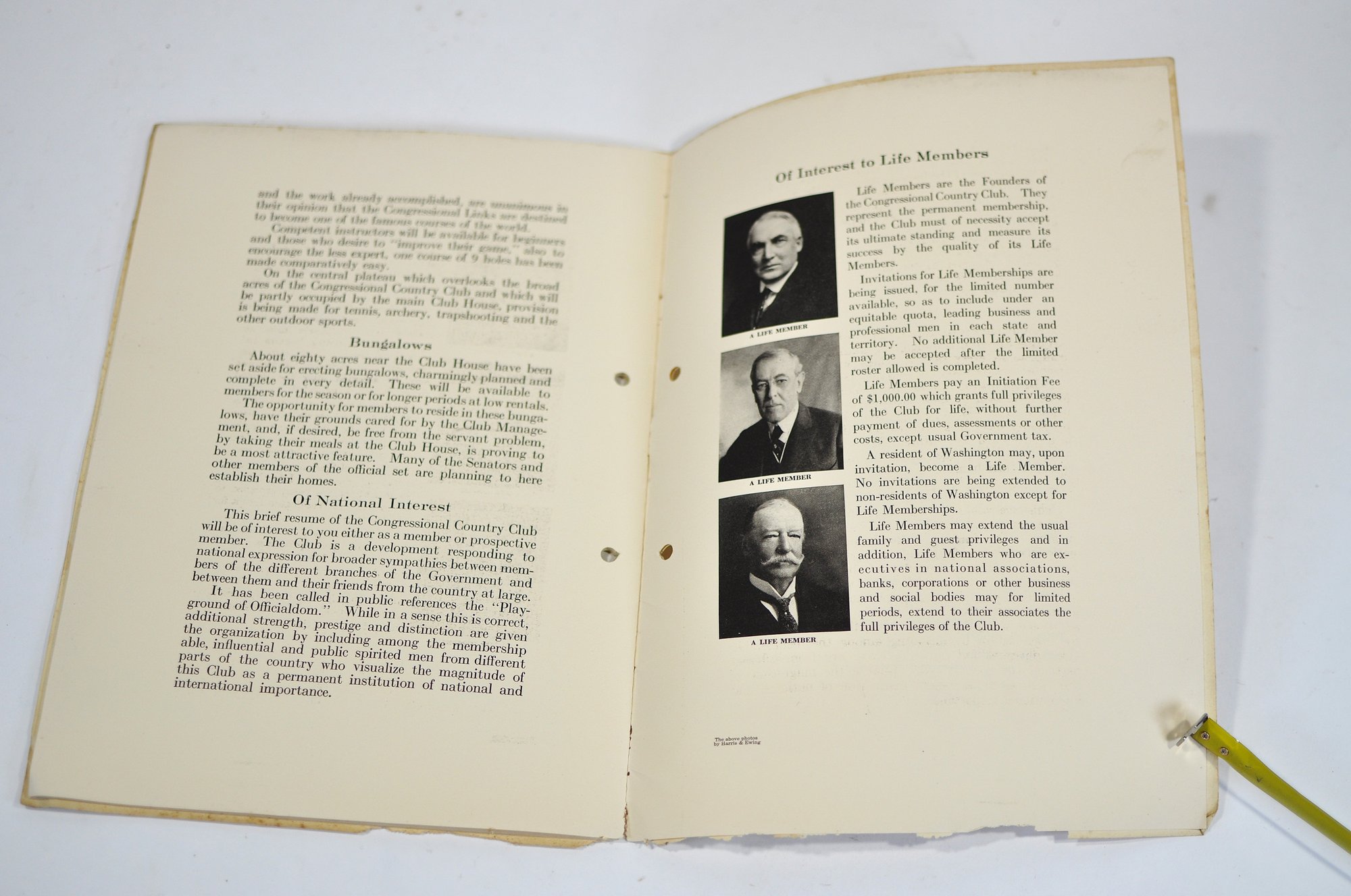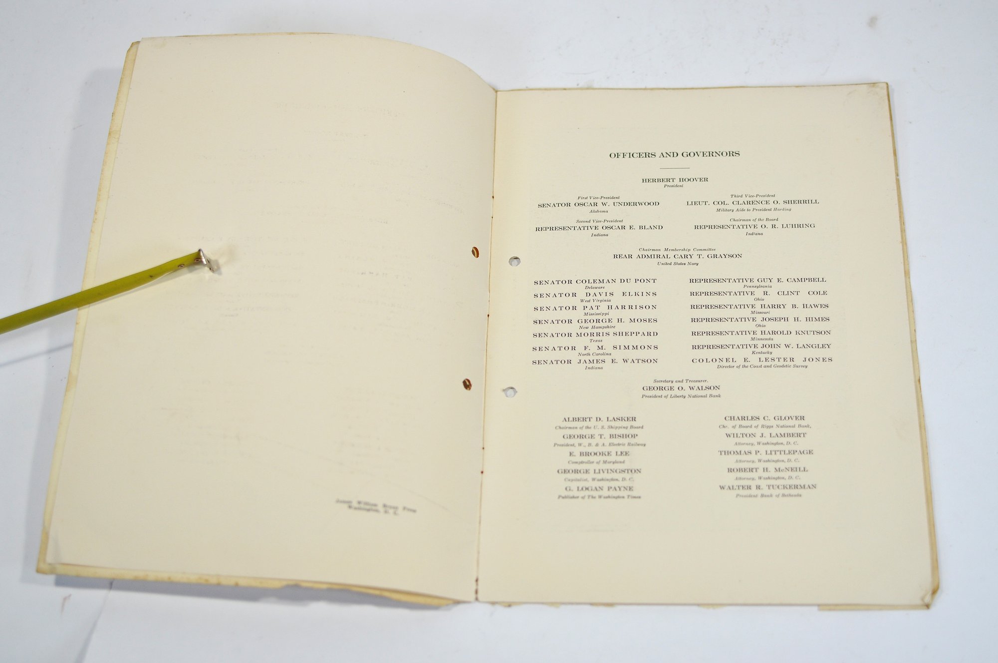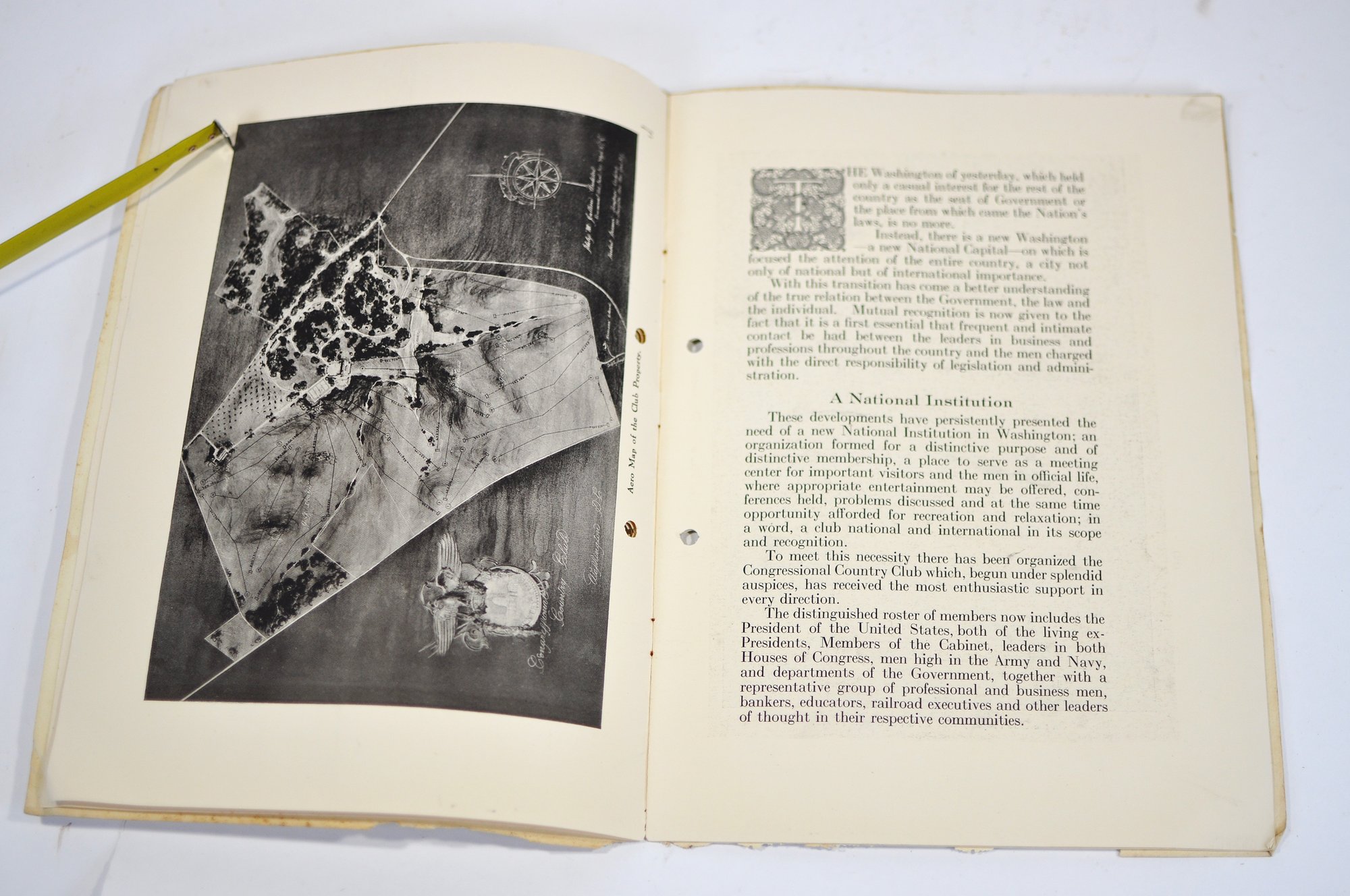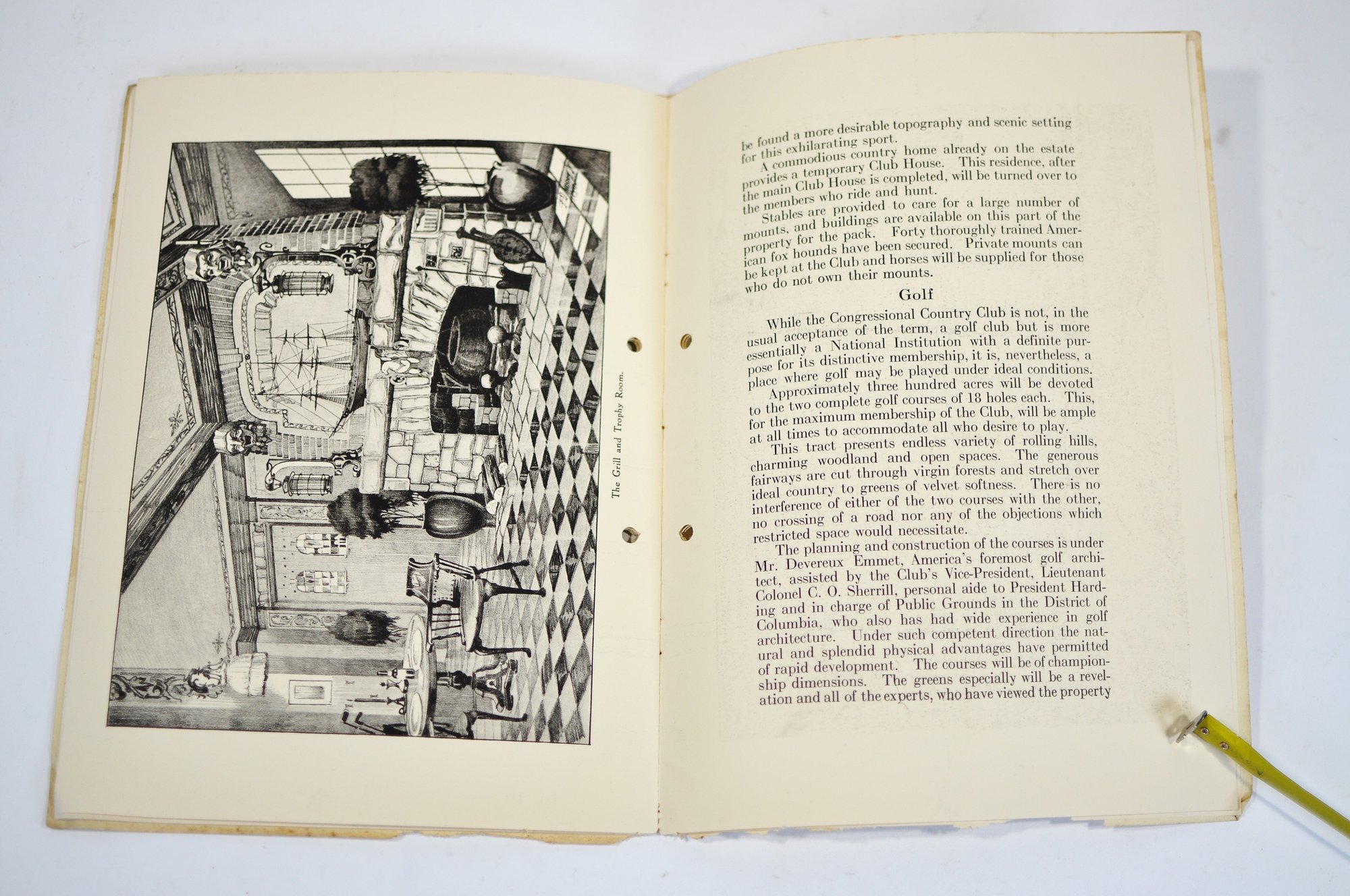 Offered is an original vintage invitation to become a Life Member of the Congressional Country Club, Washington, D.C., issued in accordance with the unanimous action of the Board of Governors. The invitation is personalized to Robert A. C. Smith and notes that it was part of a limited, numbered issue extended to prominent figures in business and the professions.Notably, the club president listed is Herbert Hoover, who would later become the 31st President of the United States, adding significant historical interest to the piece. The membership and advisory board rosters also include nationally prominent individuals, among them John D. Rockefeller Jr., one of the most influential American industrialists and philanthropists of the era. The invitation features elegant script and serif typography, along with an embossed seal of the Congressional Country Club. Interior pages list officers, governors, and advisory board members and include descriptive text and illustrations detailing the club’s facilities and its role as a national institution in Washington, D.C.Loose-leaf format with original punched holes, likely once housed in a presentation binder or folder. Size 11" x 8".