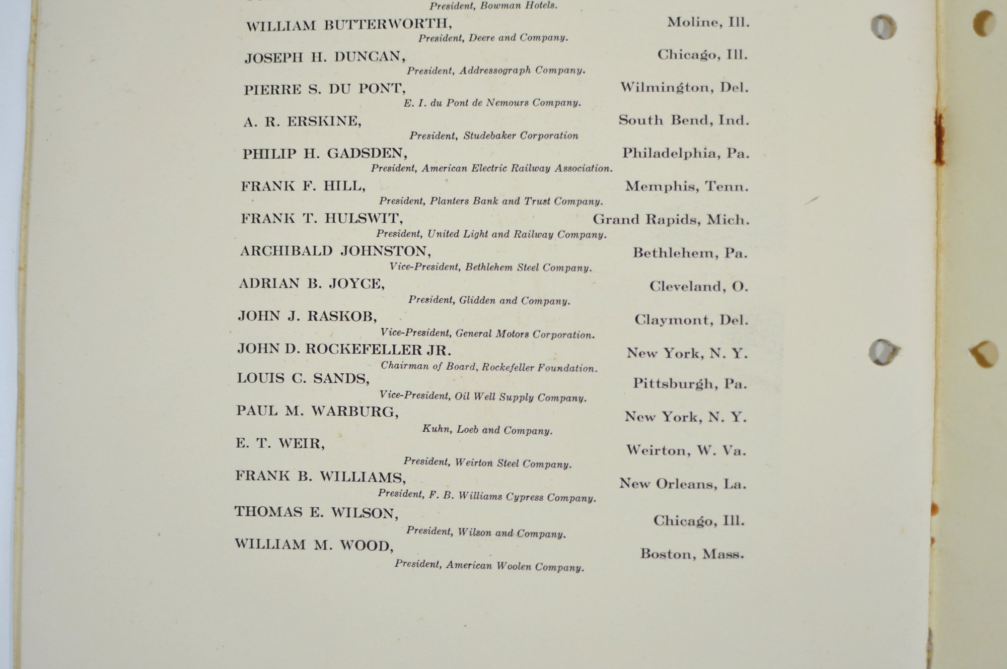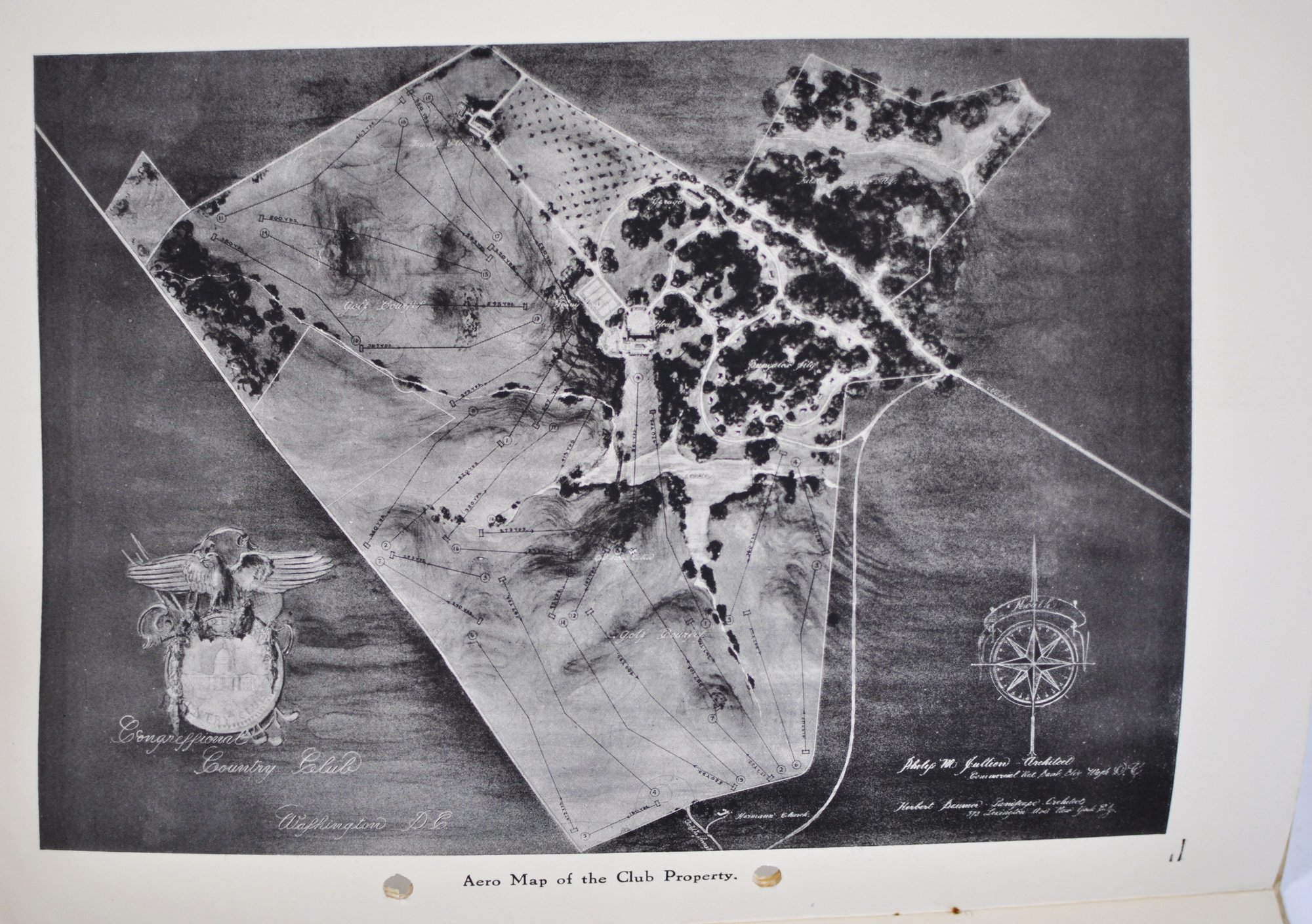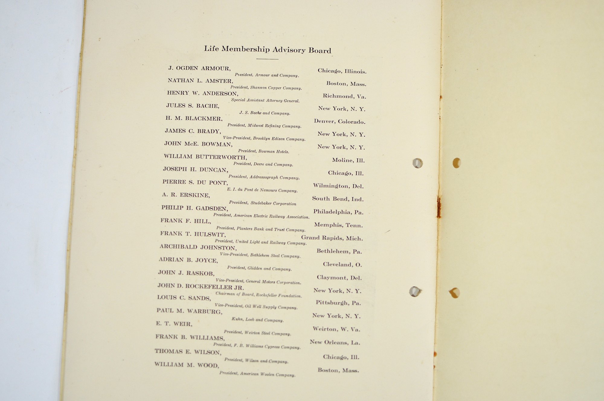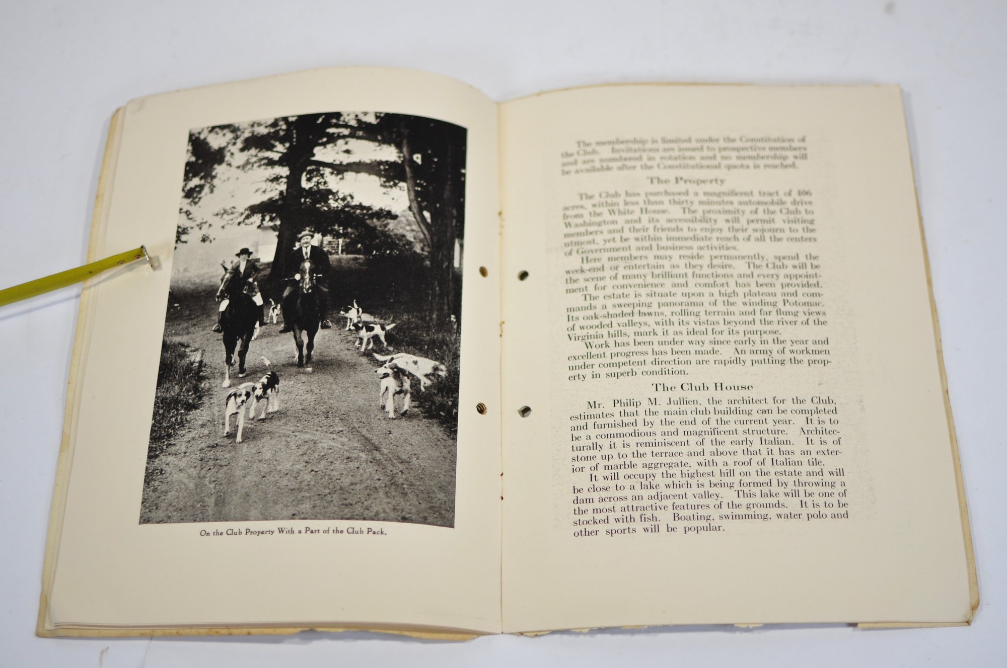 Offered is an original vintage invitation to become a Life Member of the Congressional Country Club, Washington, D.C., issued in accordance with the unanimous action of the Board of Governors. The invitation is personalized to Robert A. C. Smith and notes that it was part of a limited, numbered issue extended to prominent figures in business and the professions.Notably, the club president listed is Herbert Hoover, who would later become the 31st President of the United States, adding significant historical interest to the piece. The membership and advisory board rosters also include nationally prominent individuals, among them John D. Rockefeller Jr., one of the most influential American industrialists and philanthropists of the era. The invitation features elegant script and serif typography, along with an embossed seal of the Congressional Country Club. Interior pages list officers, governors, and advisory board members and include descriptive text and illustrations detailing the club’s facilities and its role as a national institution in Washington, D.C.Loose-leaf format with original punched holes, likely once housed in a presentation binder or folder. Size 11" x 8".
