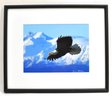Striking color photographic print depicting a bald eagle in flight against a dramatic snow-covered mountain backdrop. The image captures the power and grace of the bird mid-glide, with crisp detail and rich natural tones.