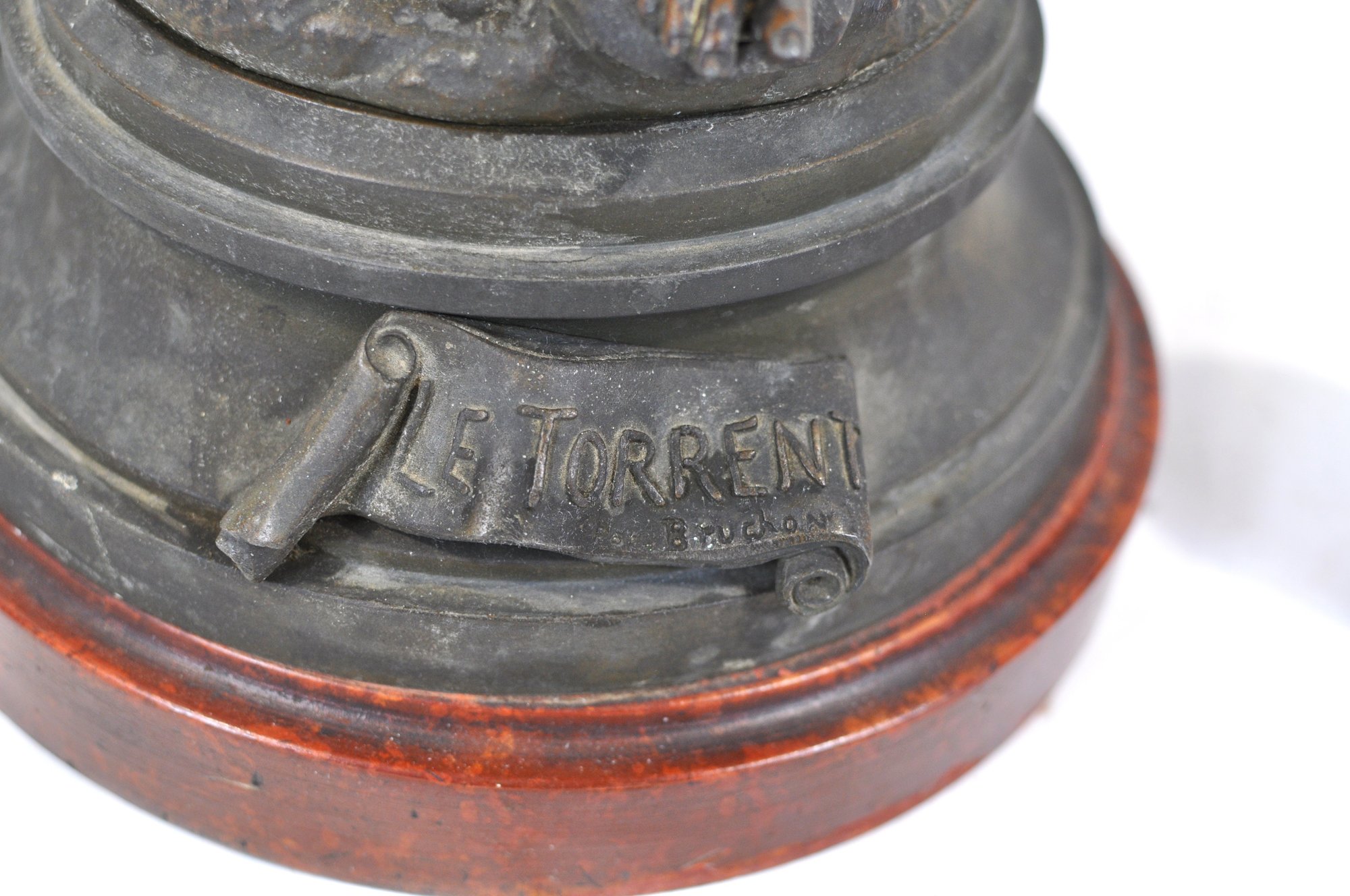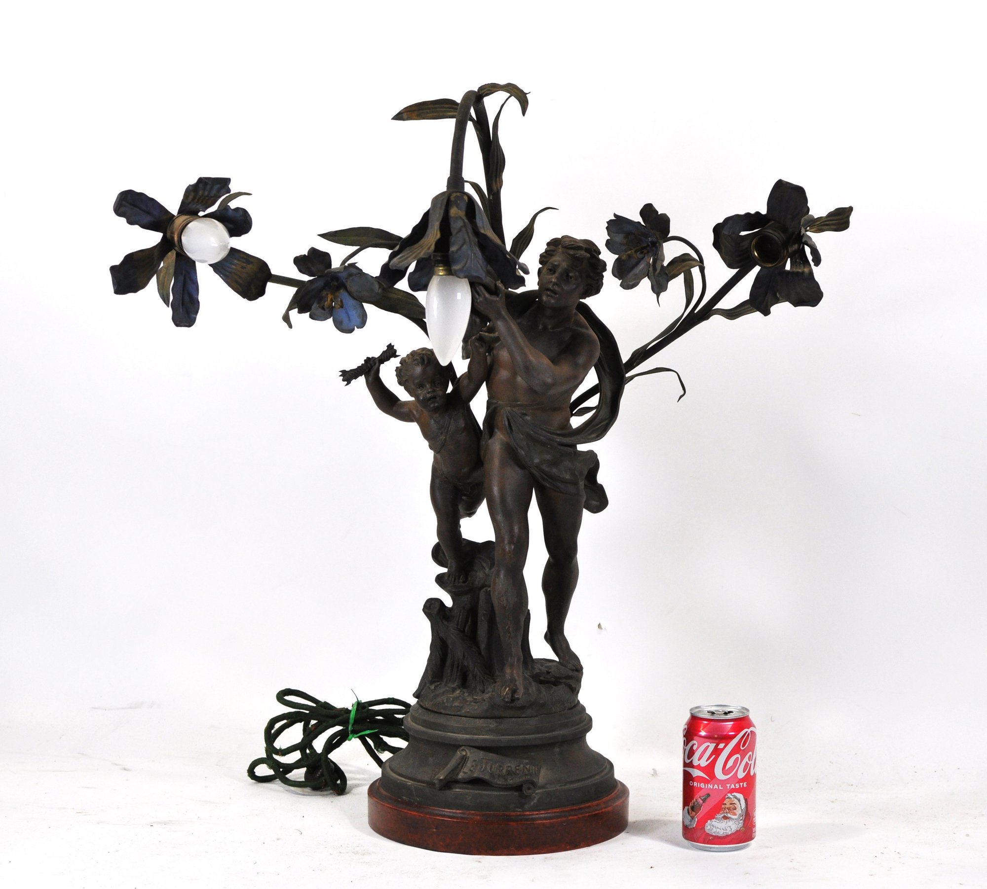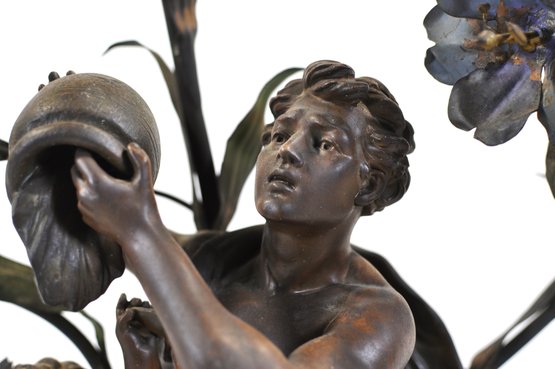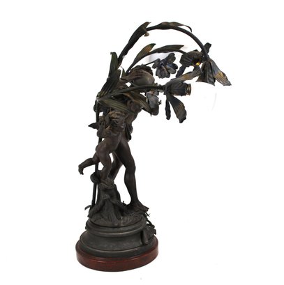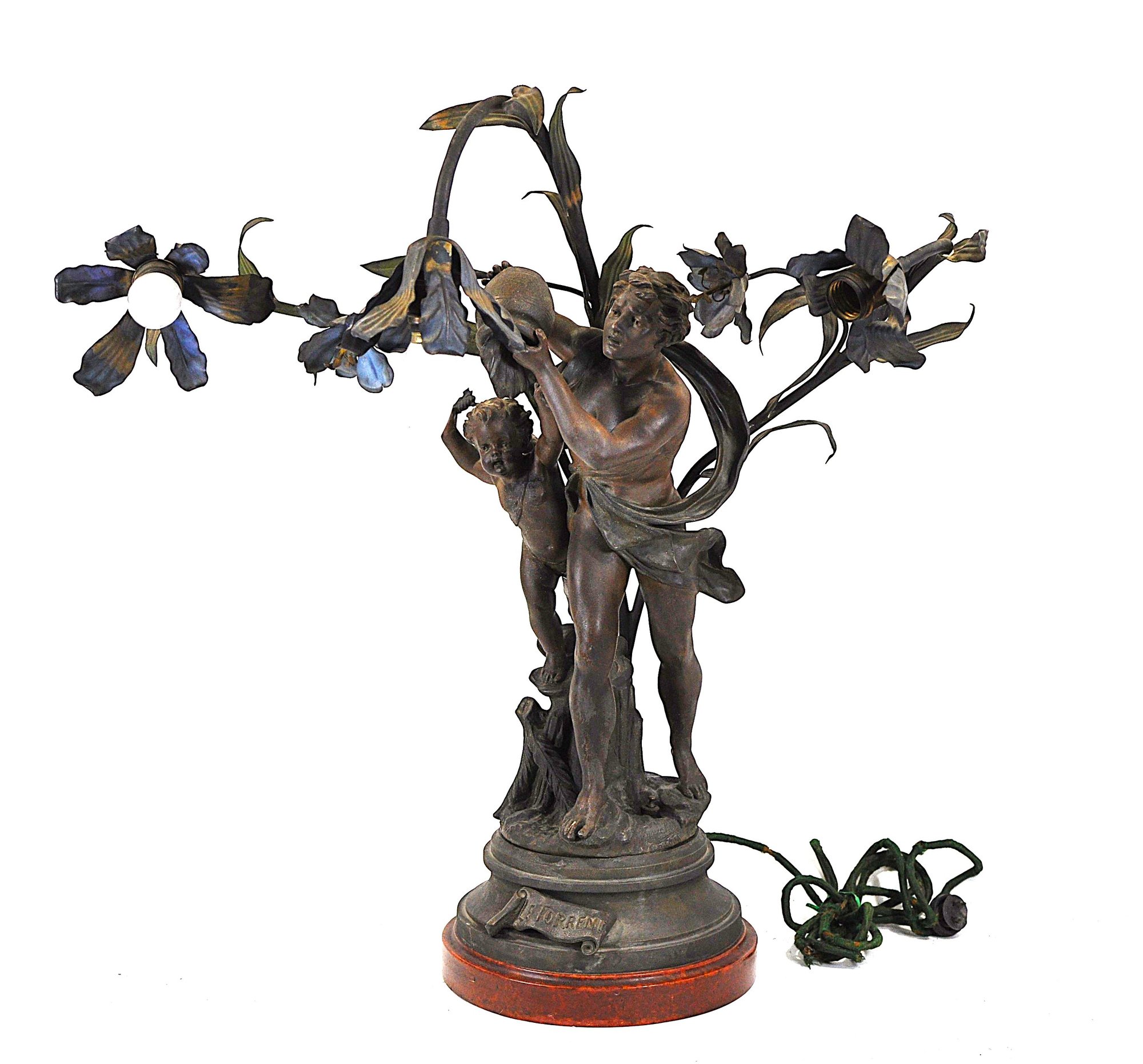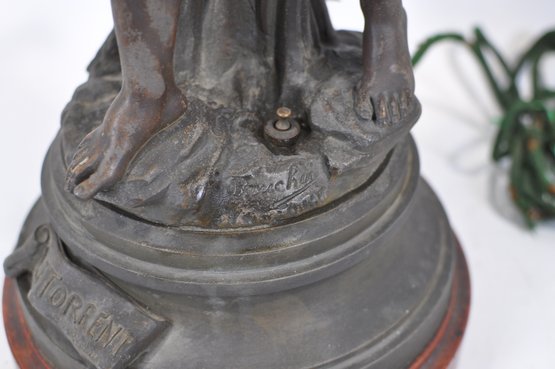Attractive Art Nouveau style figural table lamp featuring a classical igure accompanied by a cherub standing beneath flowing floral branches that form multiple light arms. The sculptural composition is inspired by the work of French sculptor Auguste Moreau and bears the title “Le Torrent.” The base is marked “E. Torrenti – Bruchon,” a foundry or decorative arts maker known for producing bronzed metal sculptures and lighting in the late 19th–early 20th century.