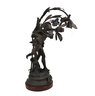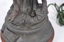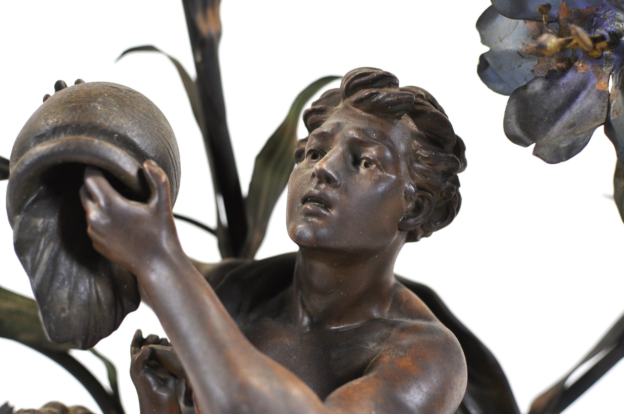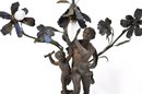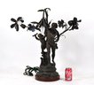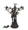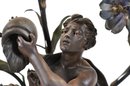 The lamp is cast in dark patinated metal (spelter) with detailed modeling of the figures and stylized flowers typical of the Art Nouveau period. Multiple flower-form sockets extend from naturalistic stems, creating a dramatic sculptural lighting piece. Mounted on a round base.