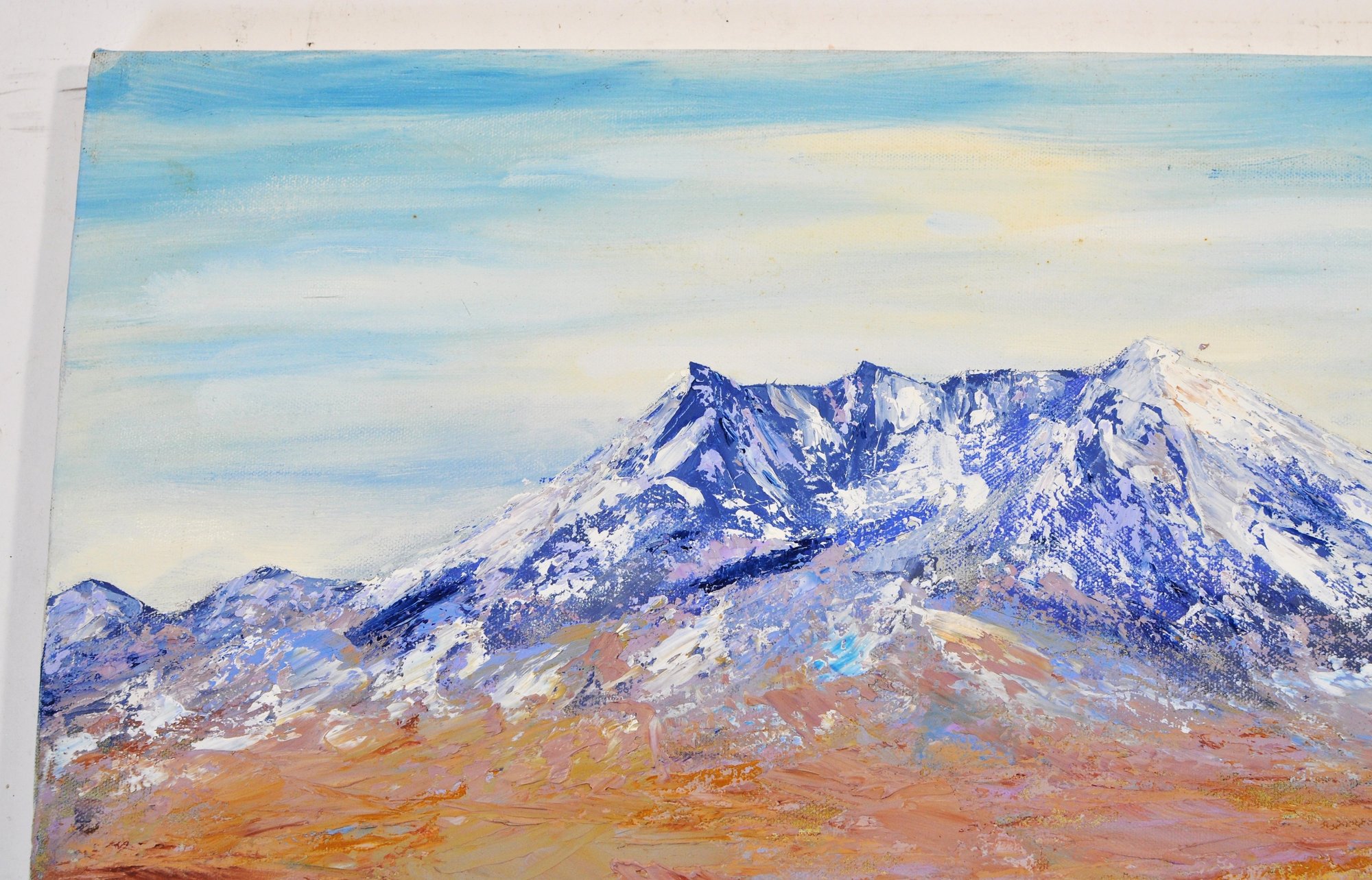 Oil on canvas, with visible textured brushstrokes throughout the mountain and foreground areas.