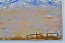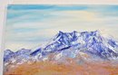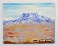Impressionistic mountain landscape depicting a rugged, snow-capped peak rising above a broad, open foreground. The scene is executed in expressive brushwork with a harmonious palette of cool blues and whites contrasted against warm earth tones, suggesting an expansive highland or western landscape under an open sky.