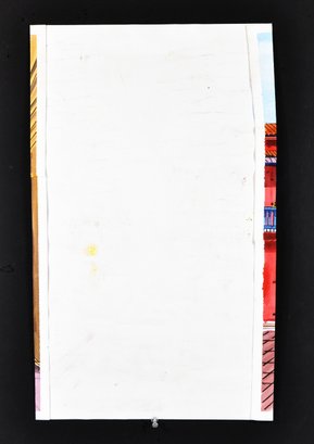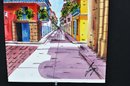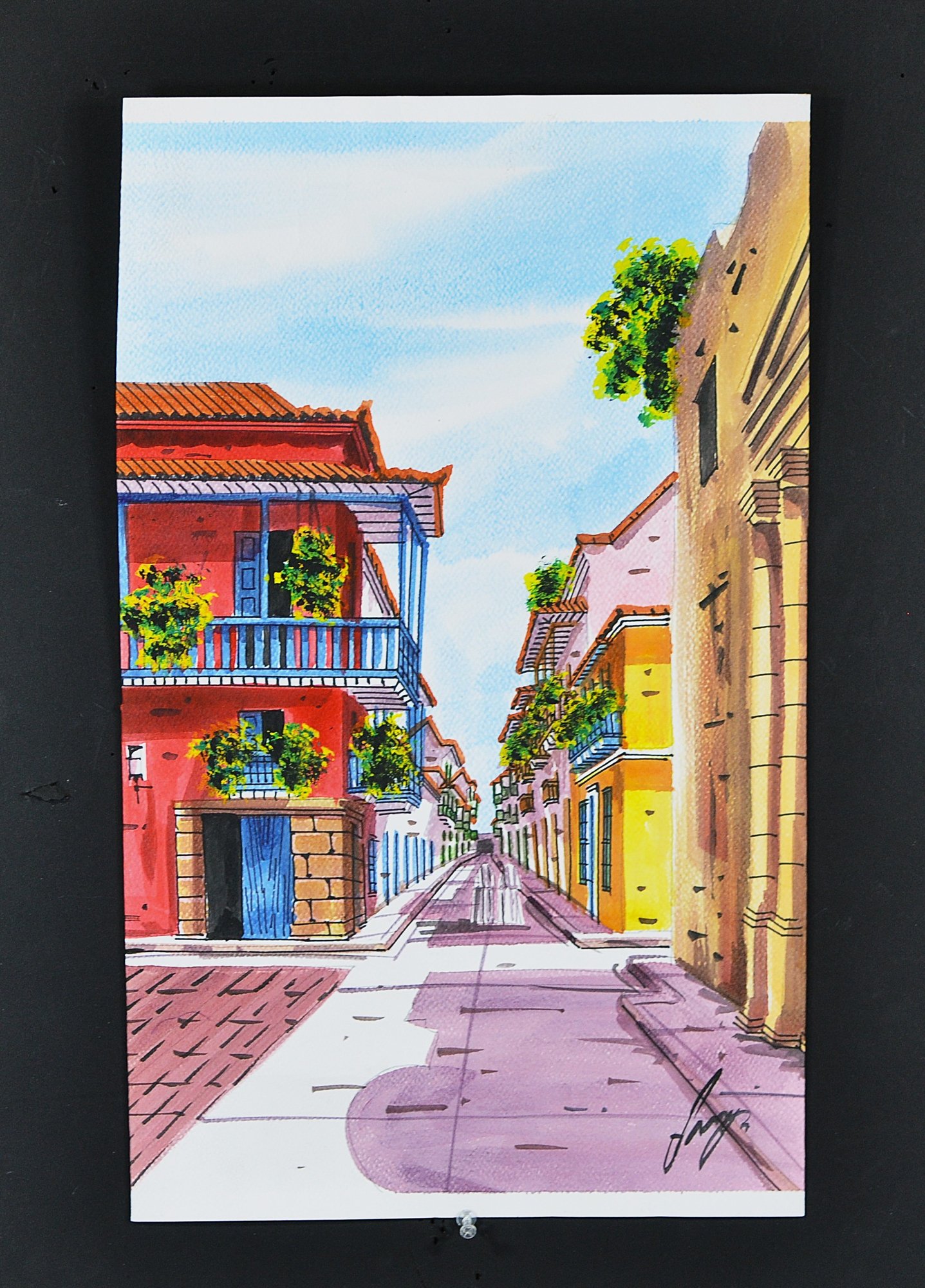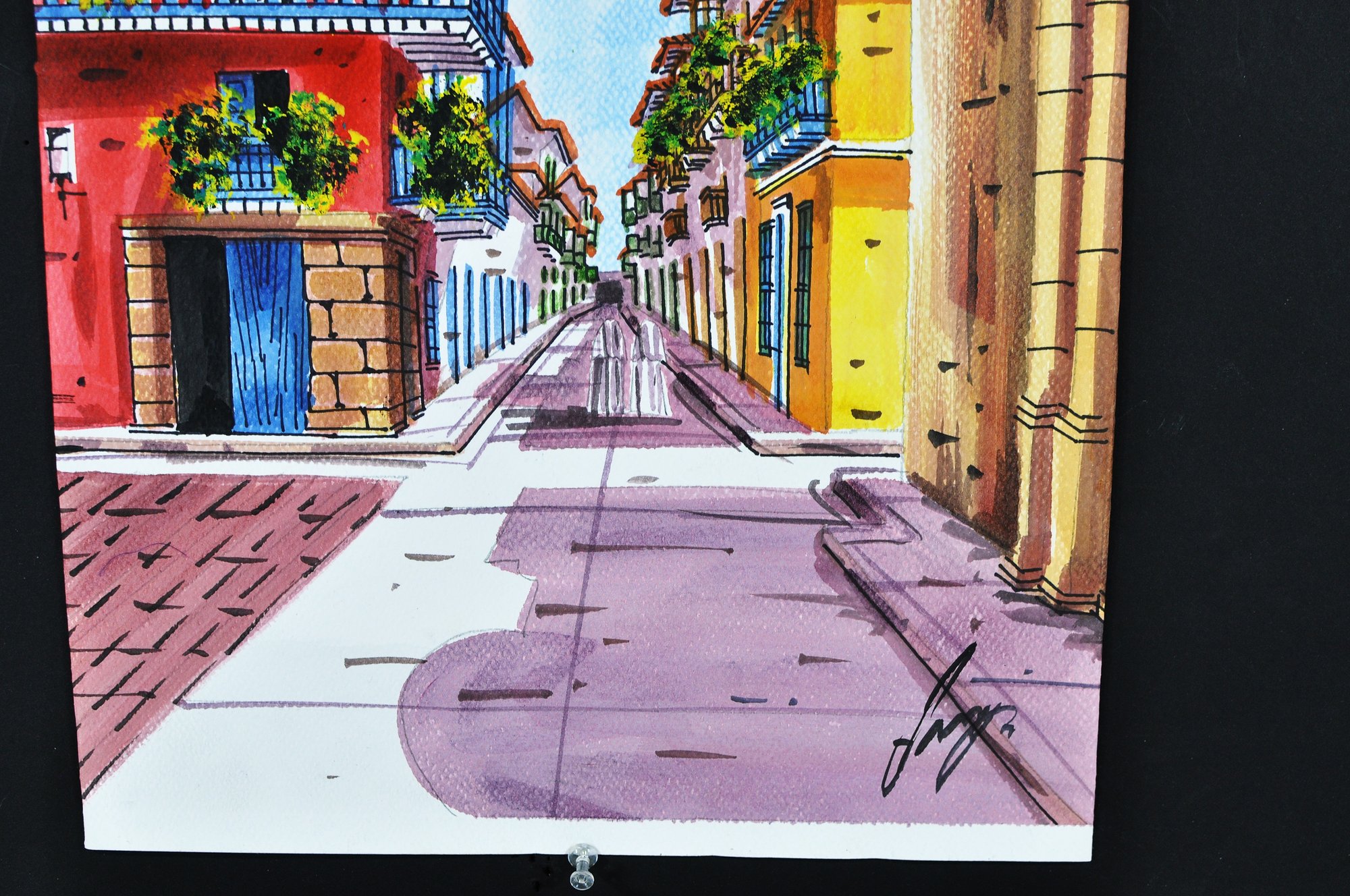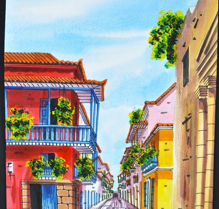 Colorful contemporary watercolor and marker painting depicting a bright architectural street scene with balconies and flowering plants. Signed lower right (artist unidentified). Executed on textured watercolor paper.