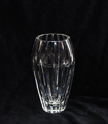 Elegant clear crystal vase by Marquis by Waterford, featuring vertical fluted cuts for brilliant light refraction. Signed on base. Approx. 7" tall.