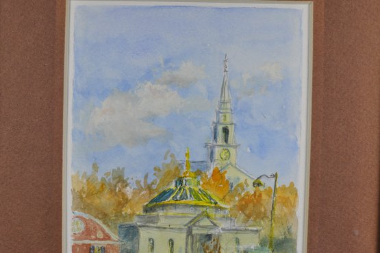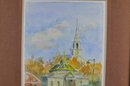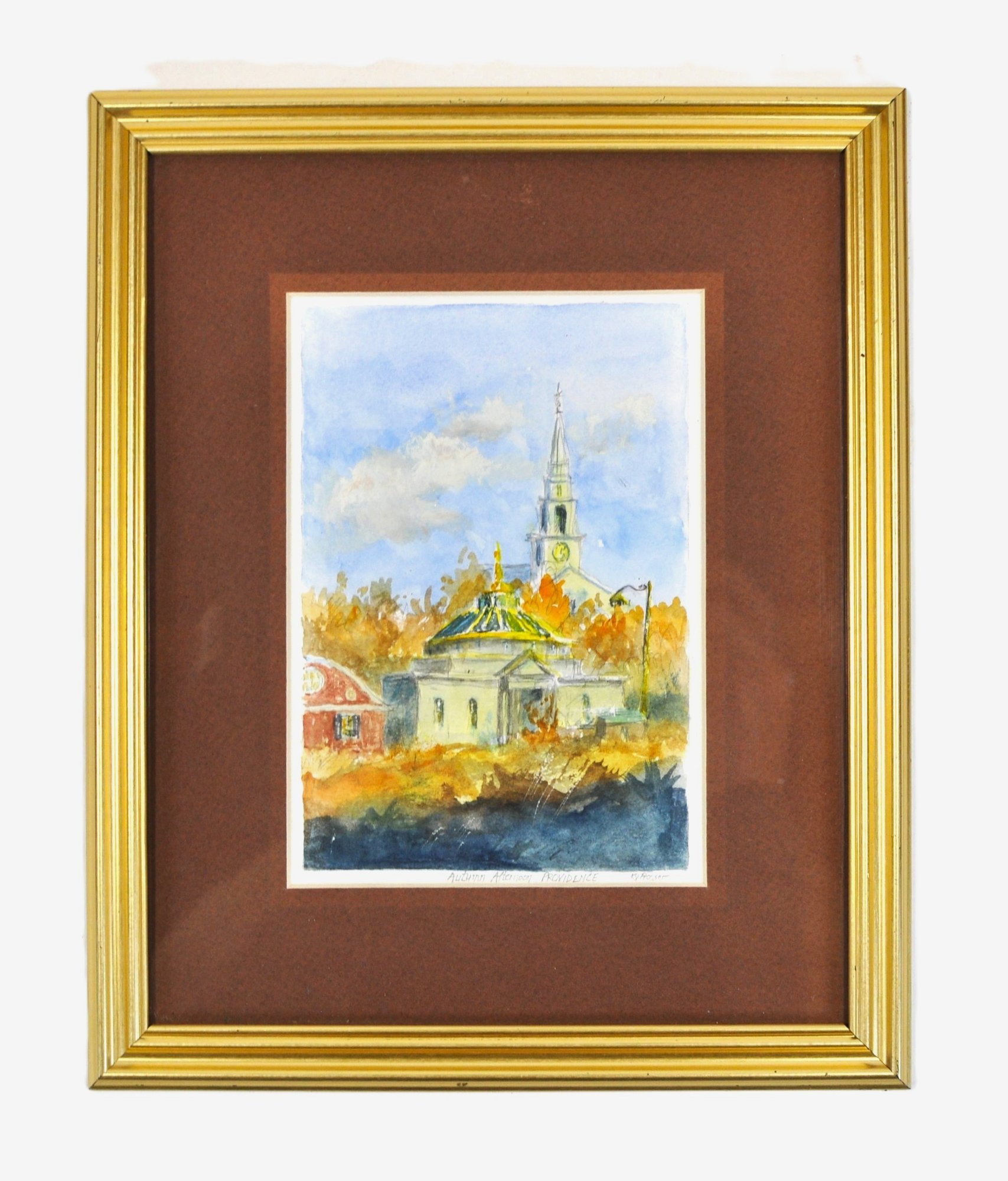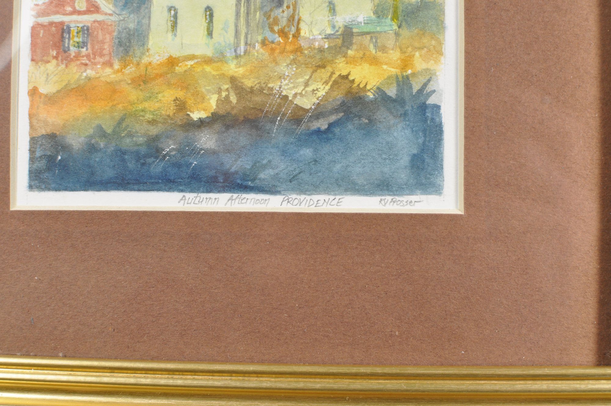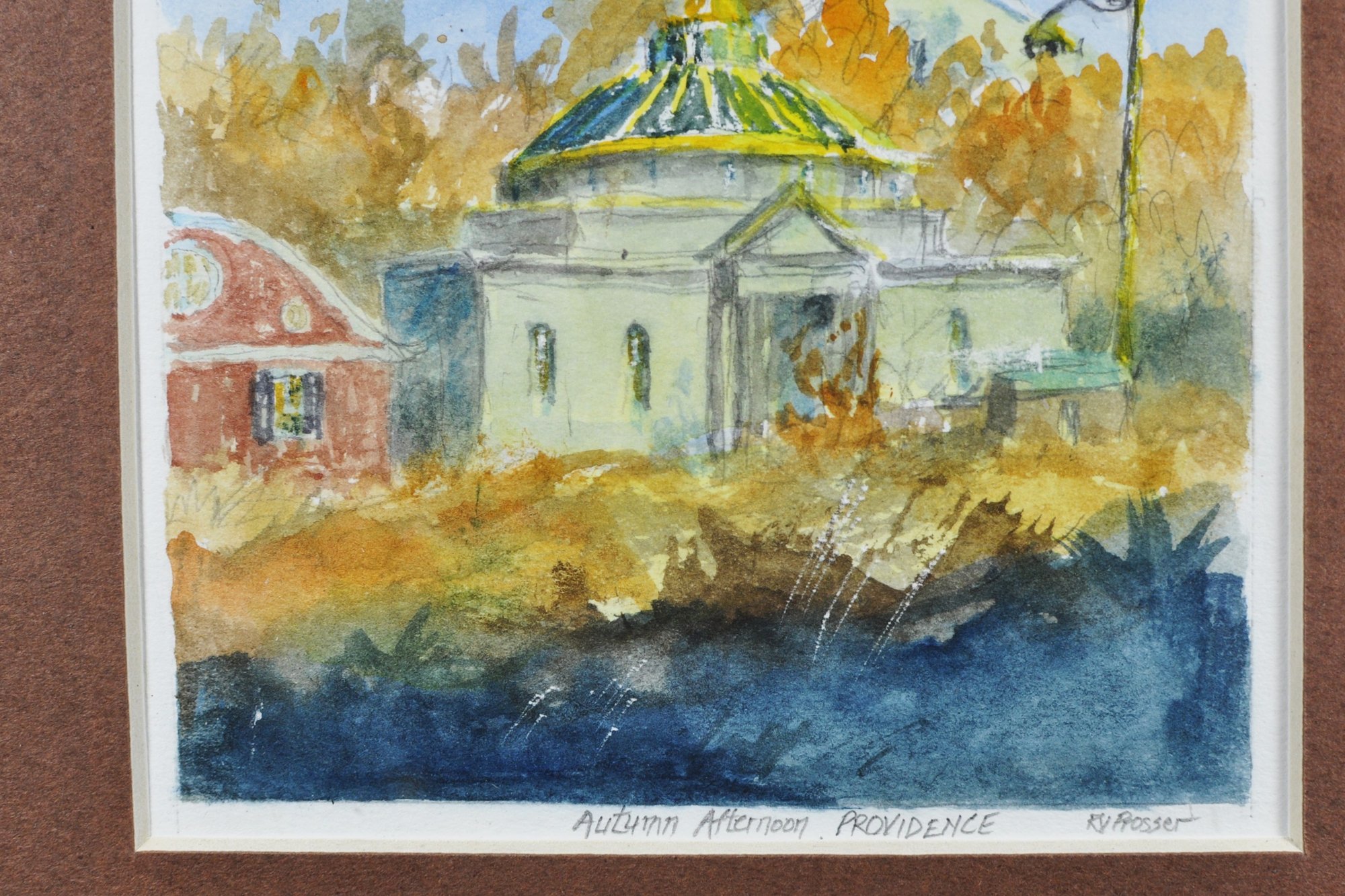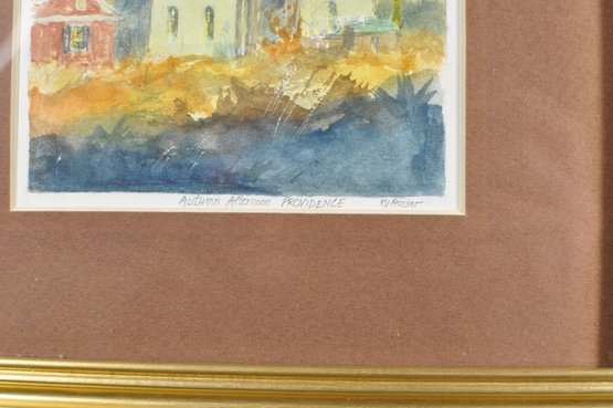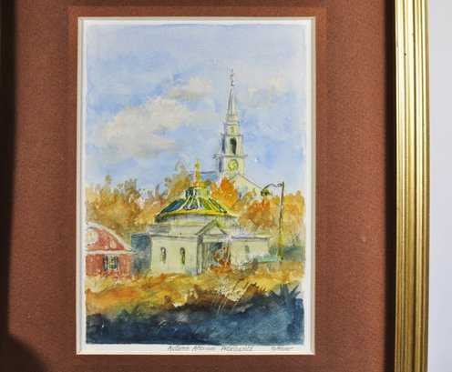 Charming watercolor scene titled Autumn Afternoon, Providence by RV Prosser, depicting a church steeple and surrounding buildings framed by fall foliage.