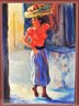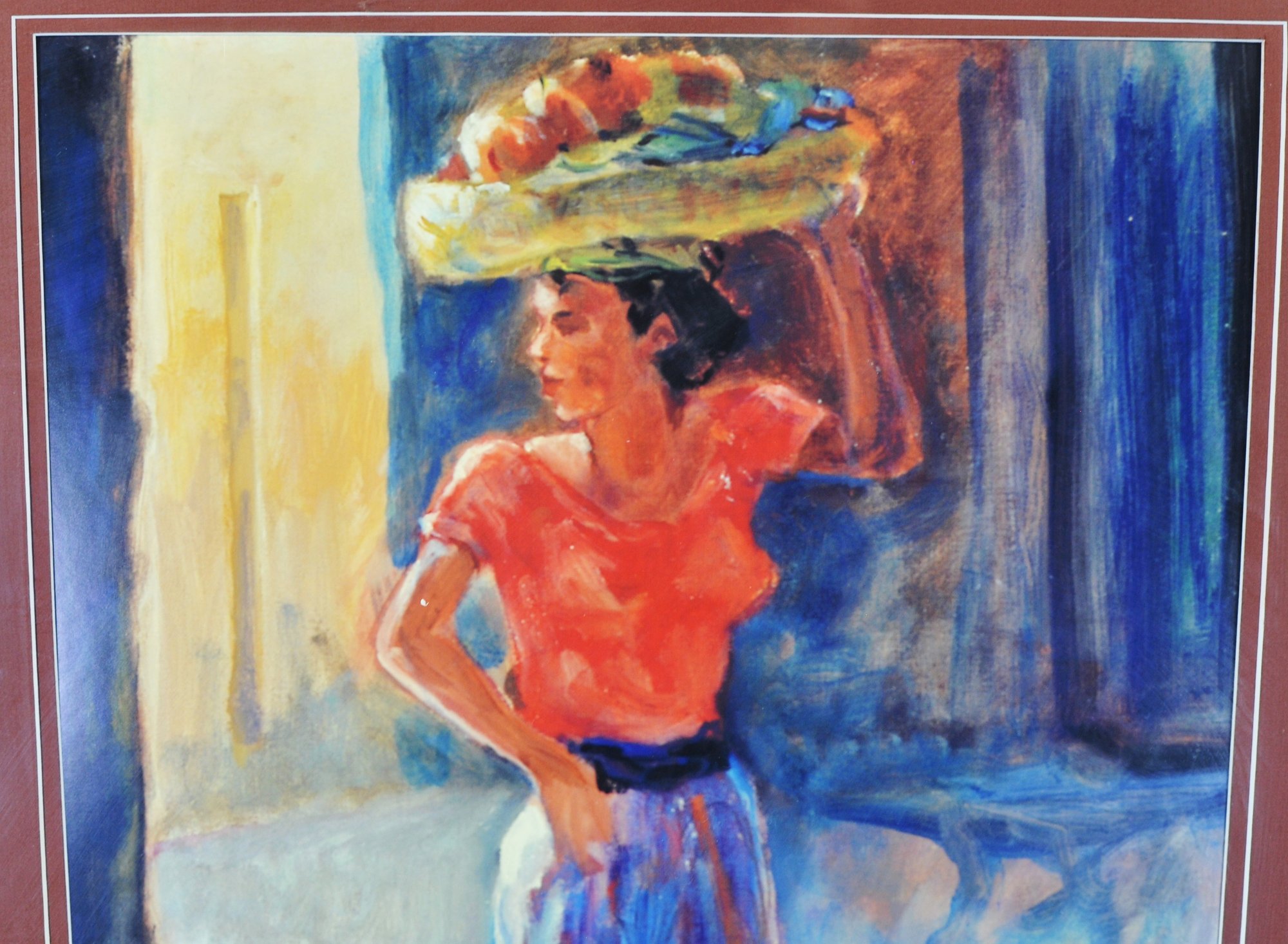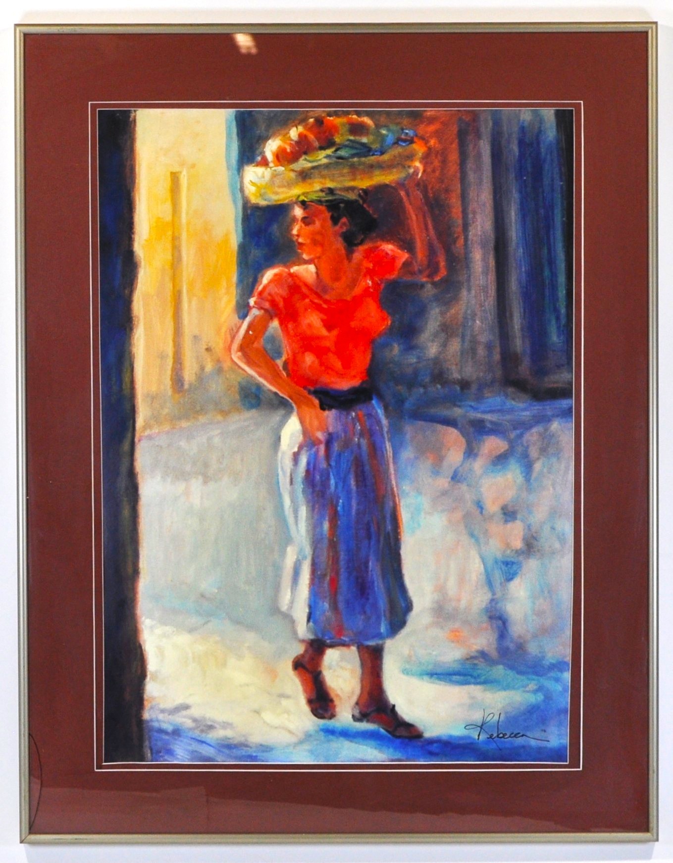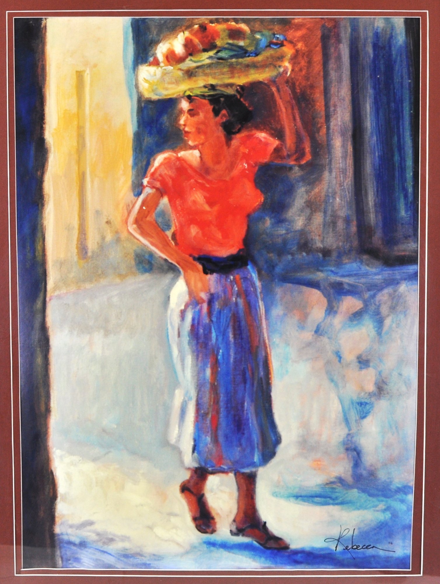 The piece depicts a woman in a red shirt and blue skirt carrying a basket on her head. Flores is an artist whose work explores various themes through an impressionistic lens.
