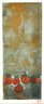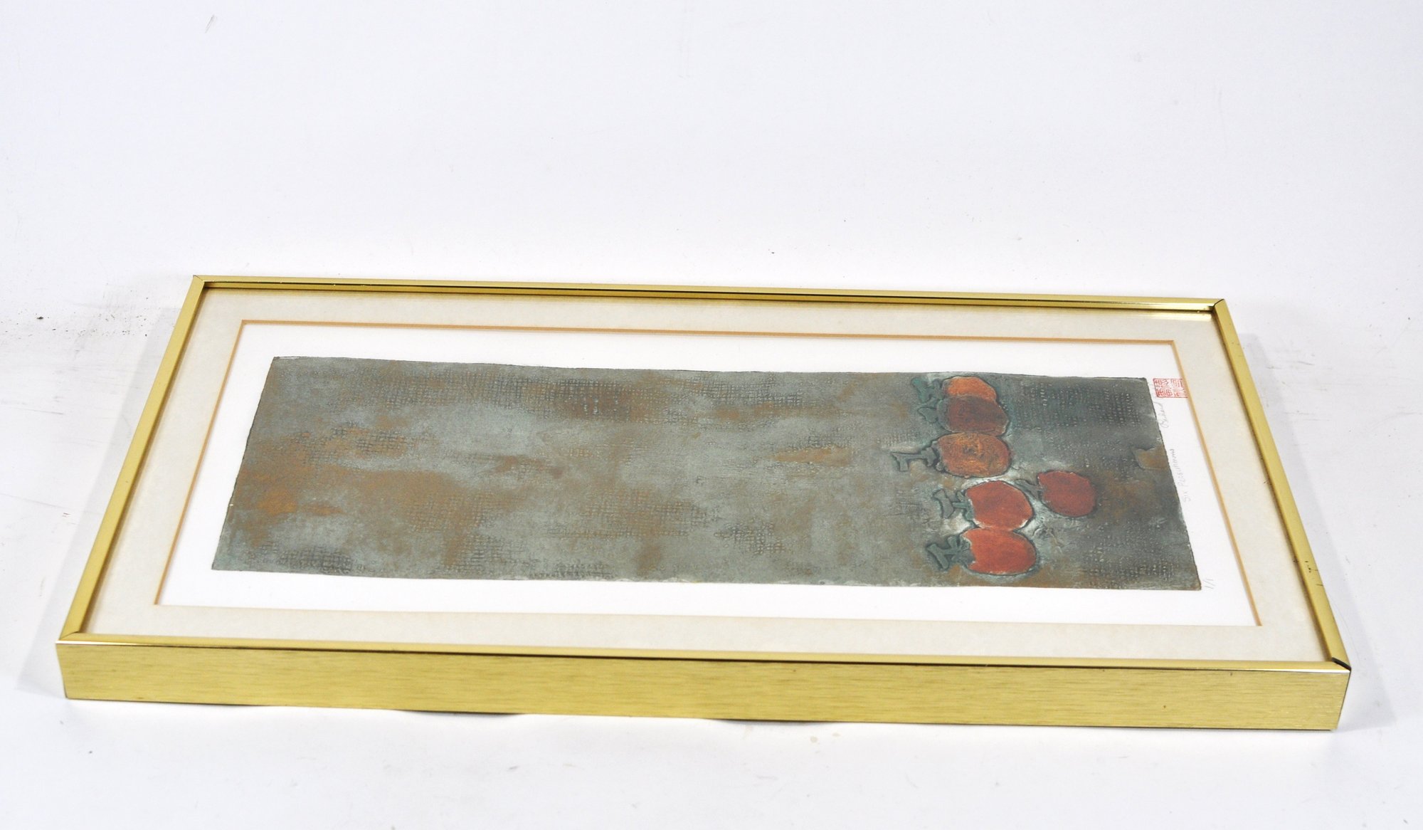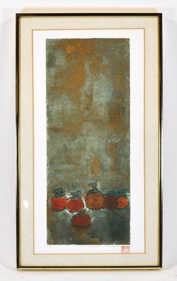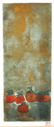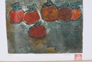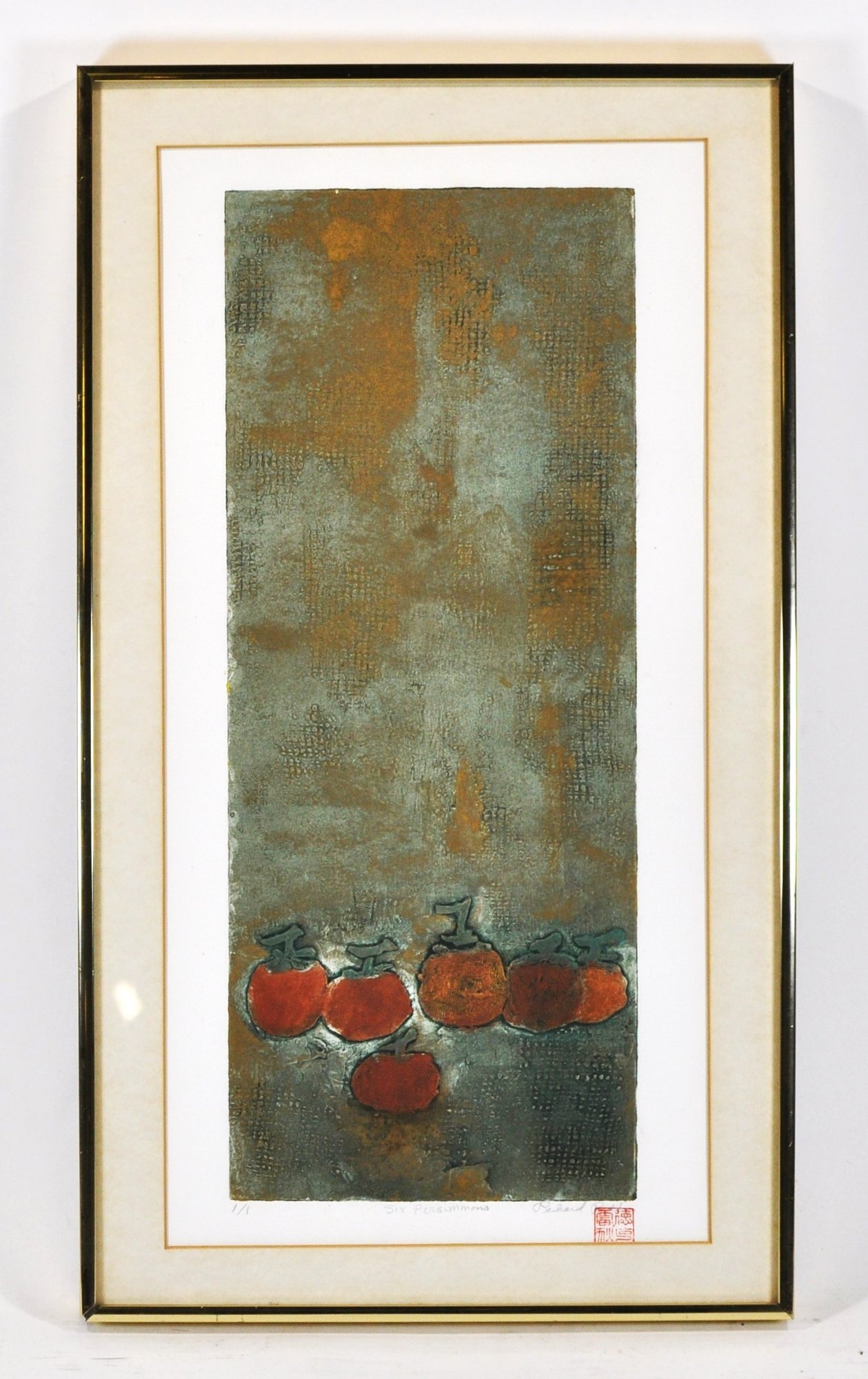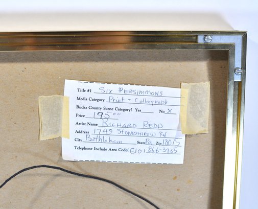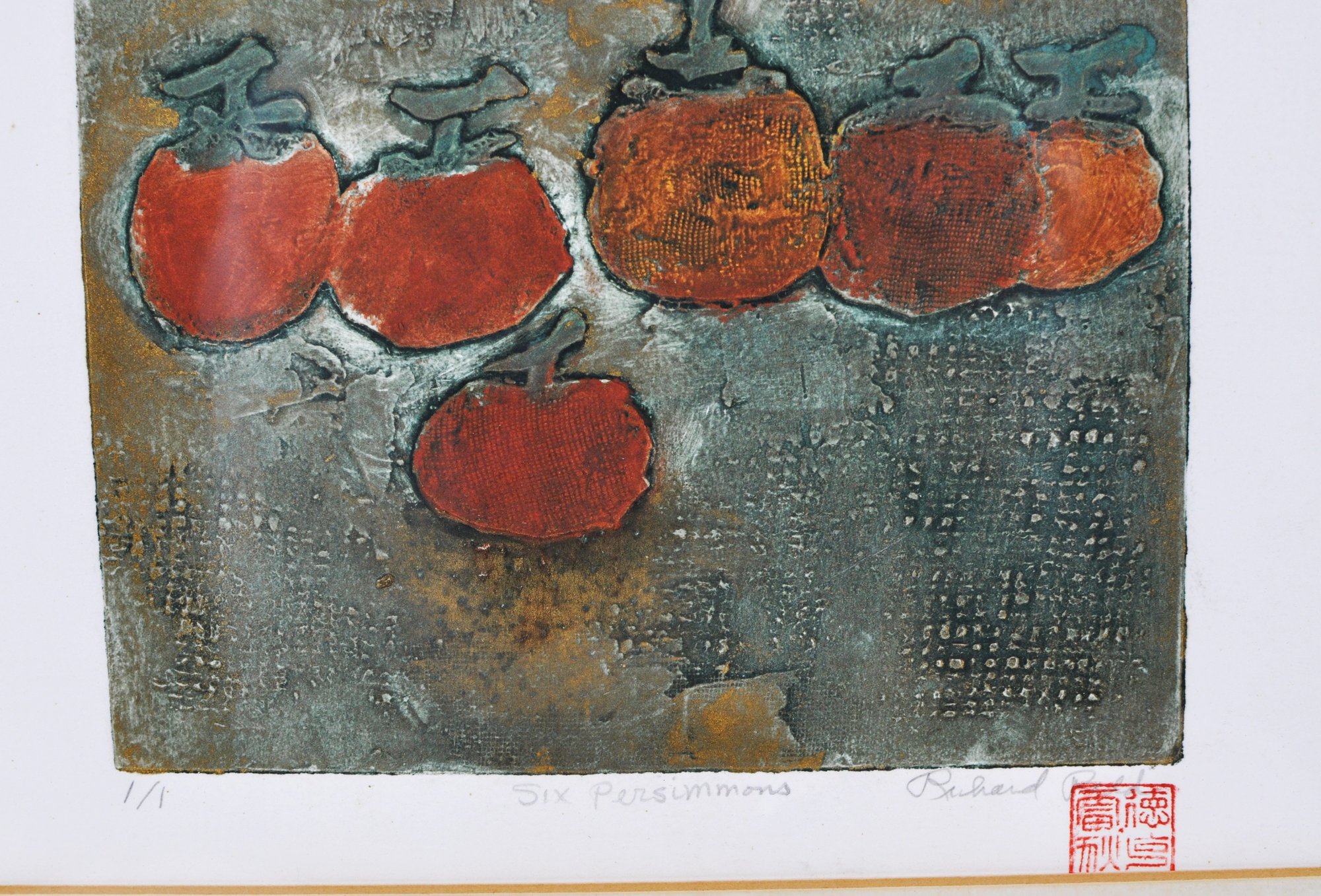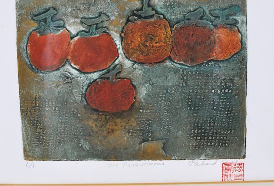 Collagraph print titled “Six Persimmons” by Richard Redd. Abstract still life depicting six persimmons in warm red and rust tones against a textured ground.