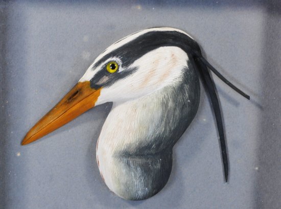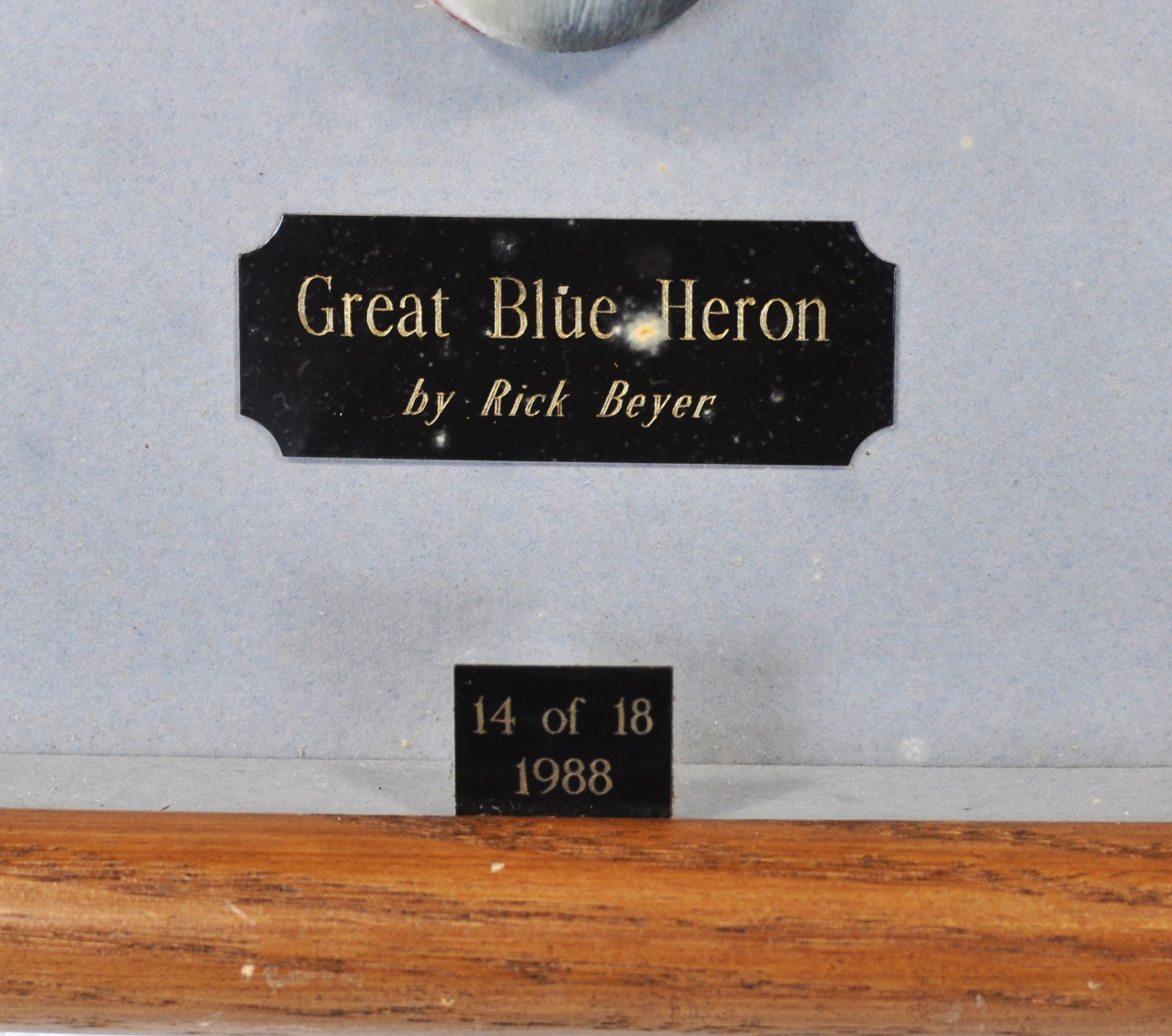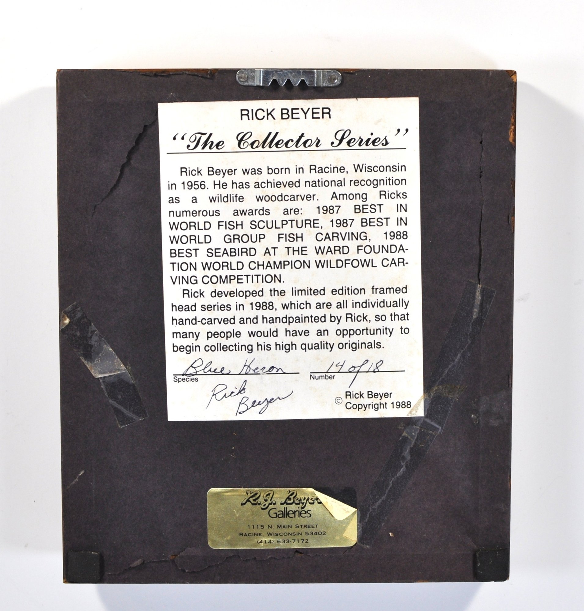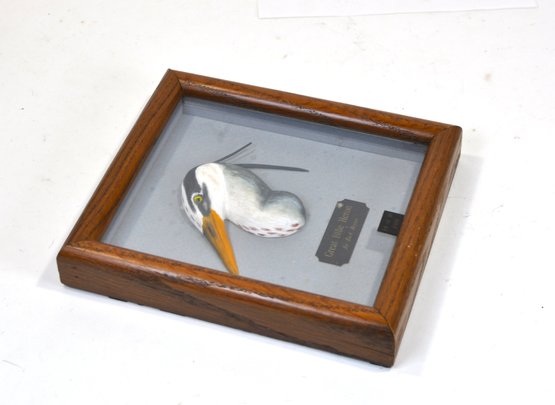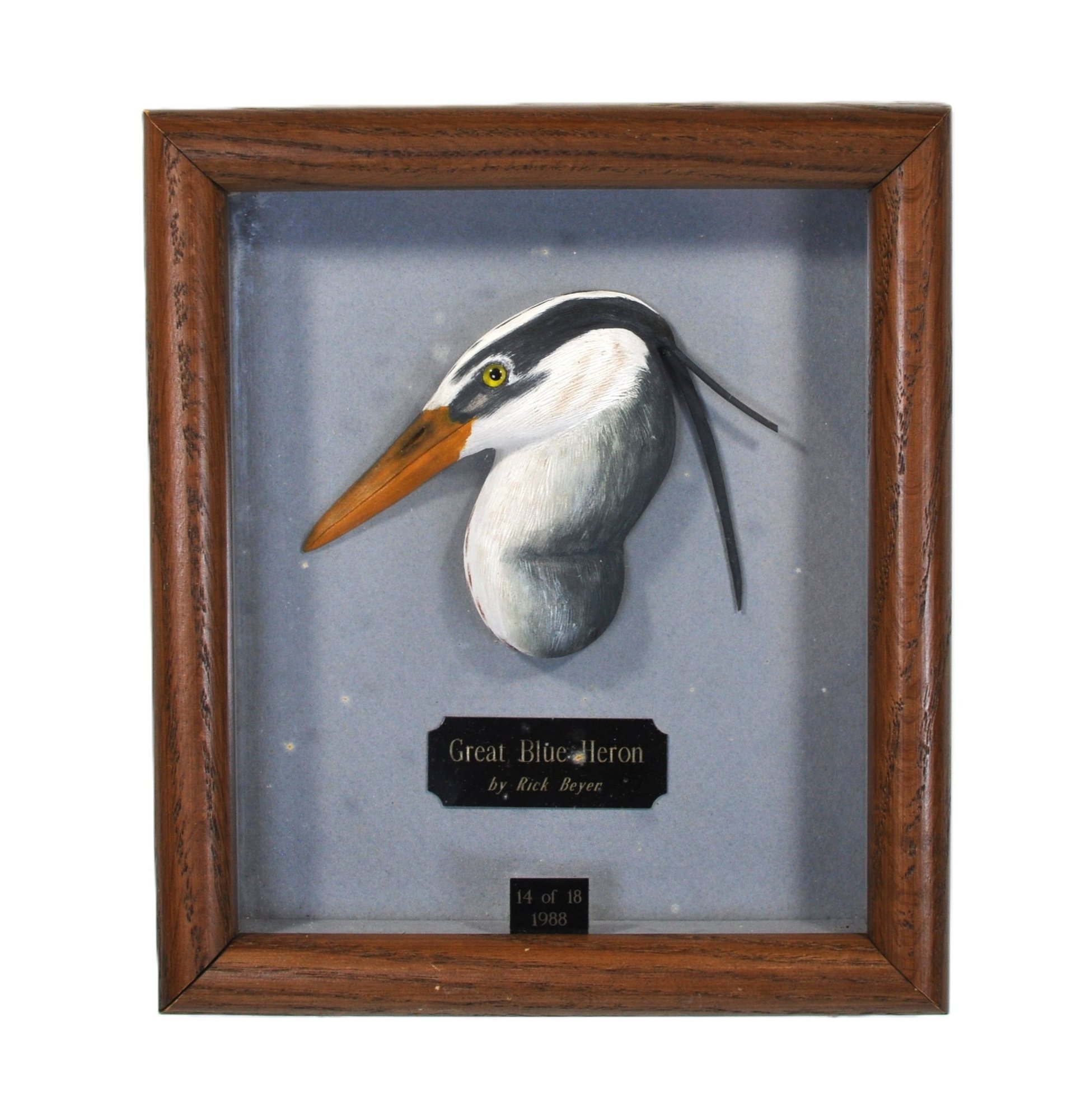 This work features a finely detailed Golden Eagle head in profile, carved in high relief with expressive feather texture and lifelike painted surface. The carving is presented in its original deep shadowbox frame with artist plaque and edition plate reading “14 of 18 – 1988.”