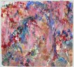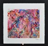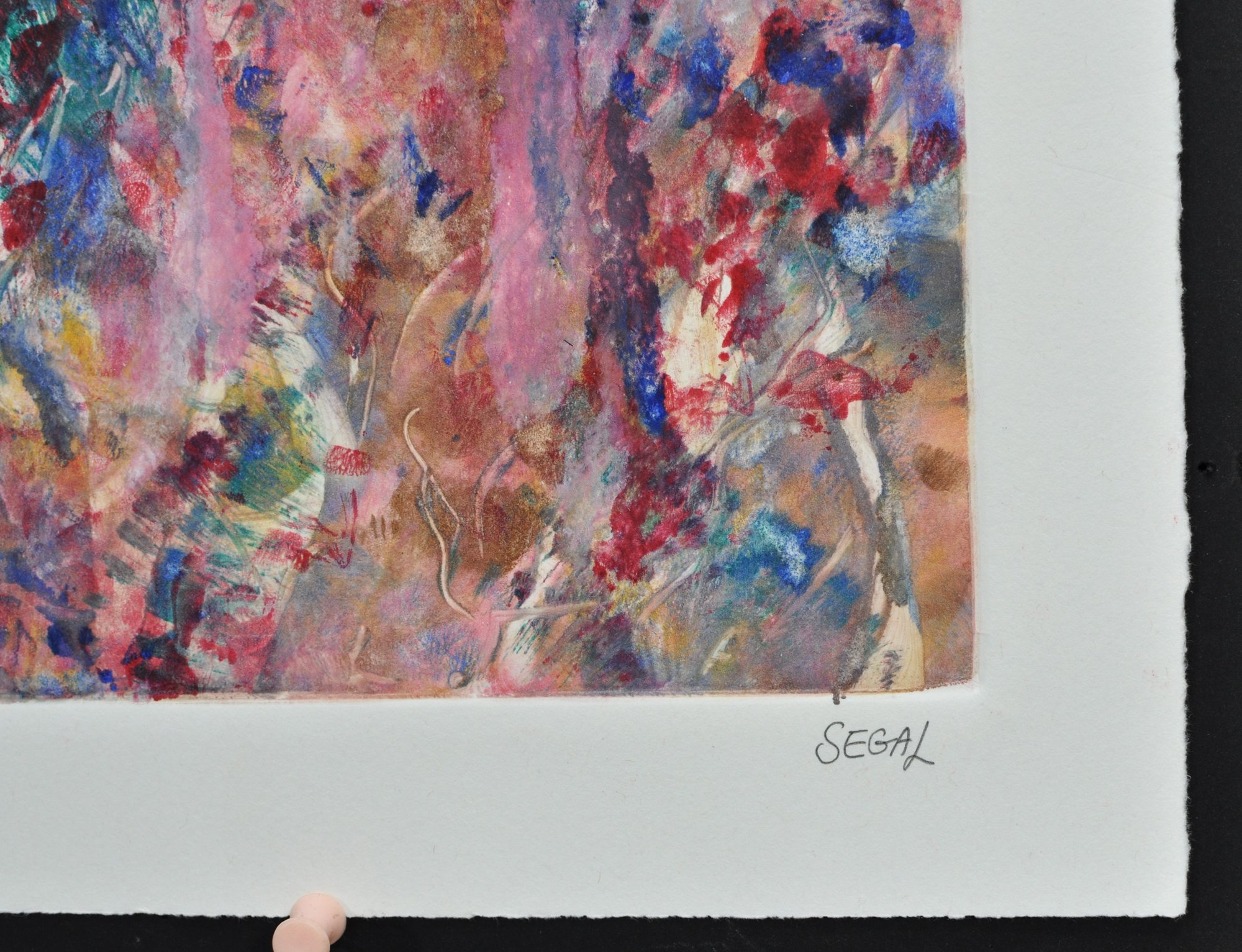 Vibrant abstract mixed media print by artist Roberta Segal, featuring an energetic composition of layered color washes in pink, red, blue, and green with expressive gestural marks. The work presents a richly textured, painterly surface with a dynamic, almost floral or landscape-like abstraction. Pencil signed “Segal” lower right.