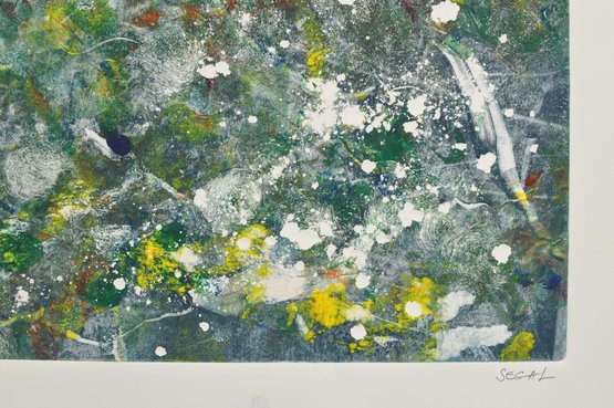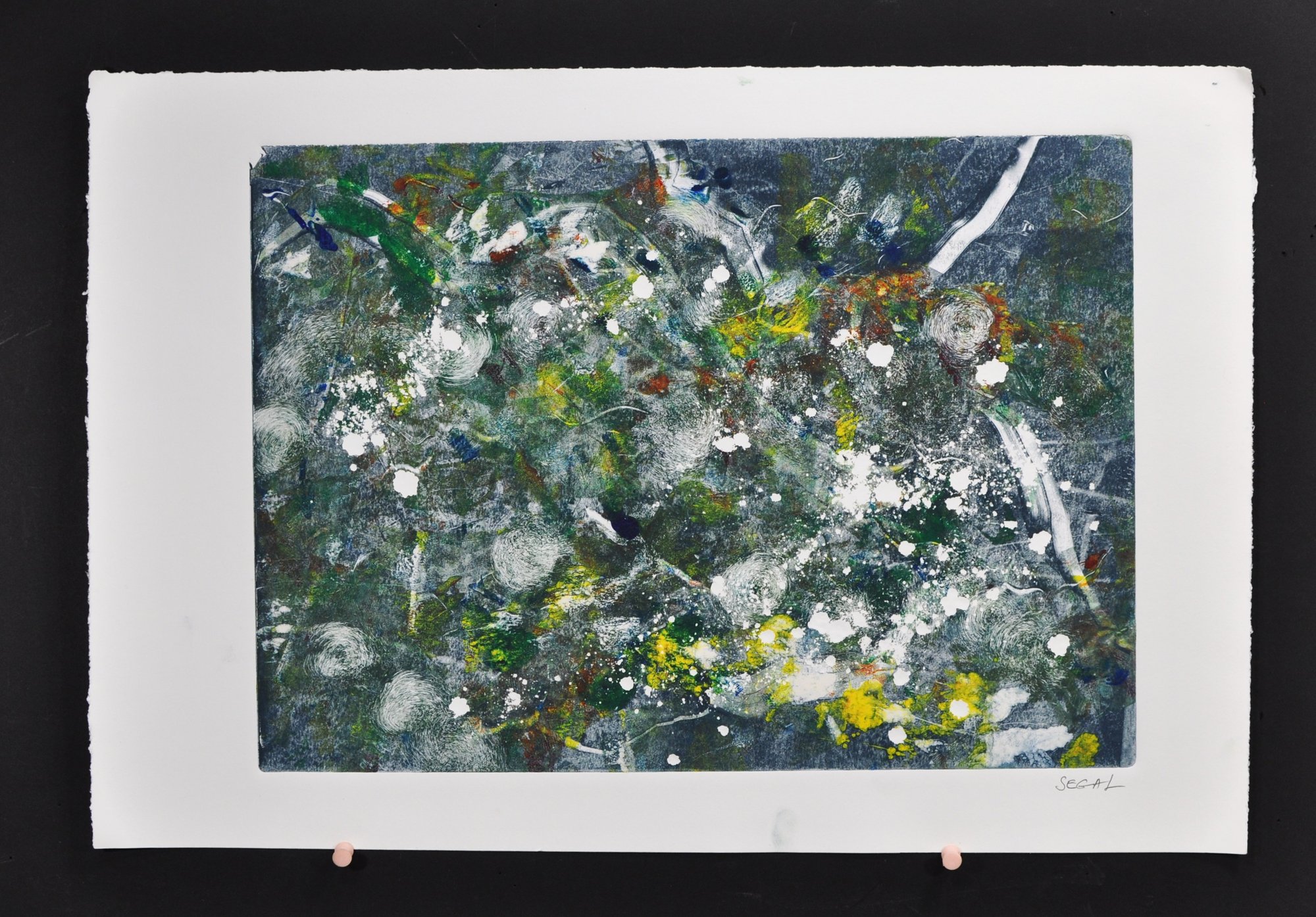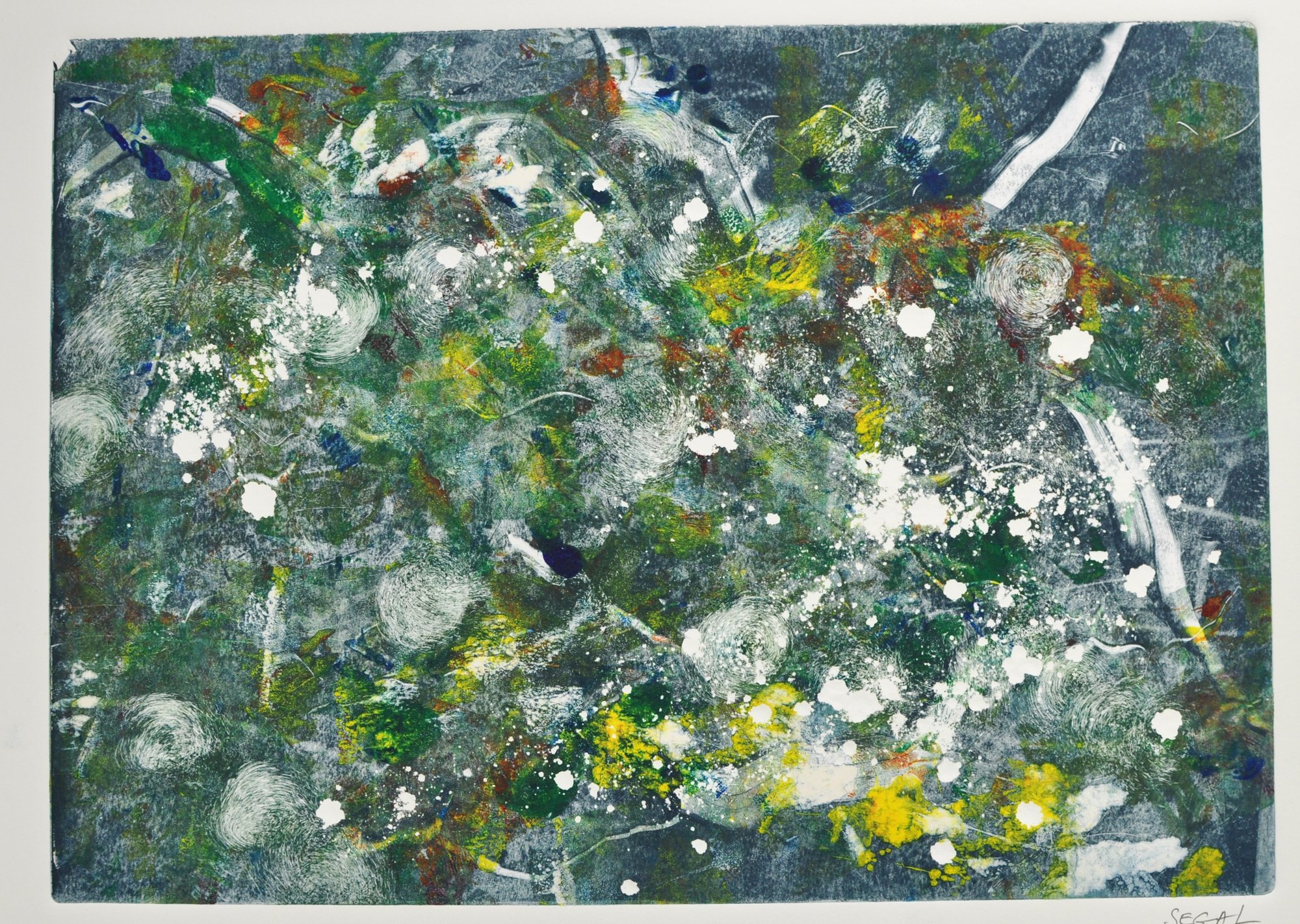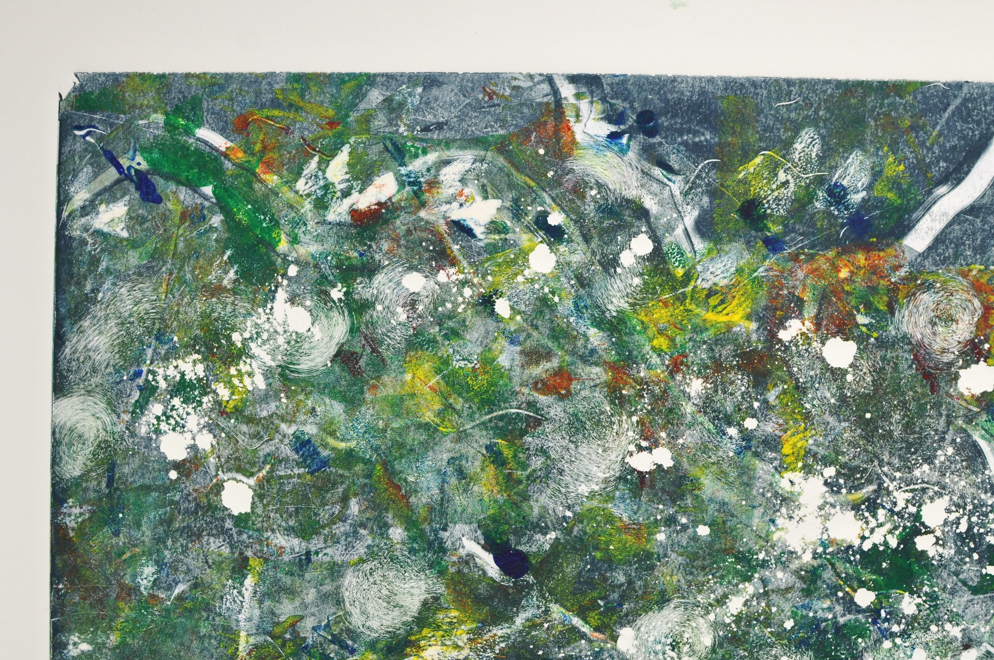 Expressive abstract mixed media monoprint by Roberta Segal, featuring a richly layered composition in green, gray, yellow, and white with energetic splatter, swirling textures, and gestural marks. The work has a dynamic, atmospheric quality reminiscent of abstract expressionist techniques.