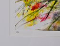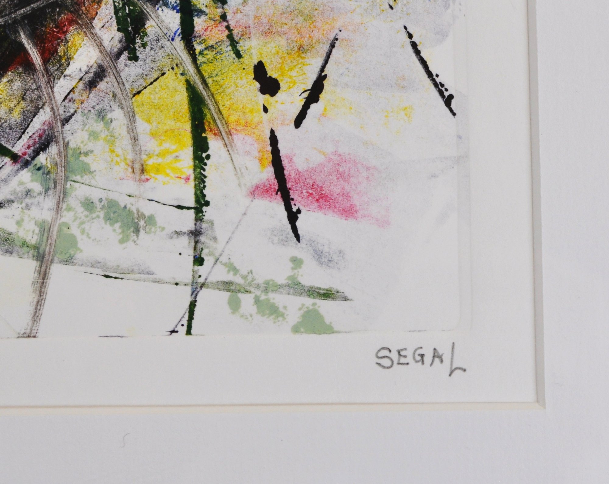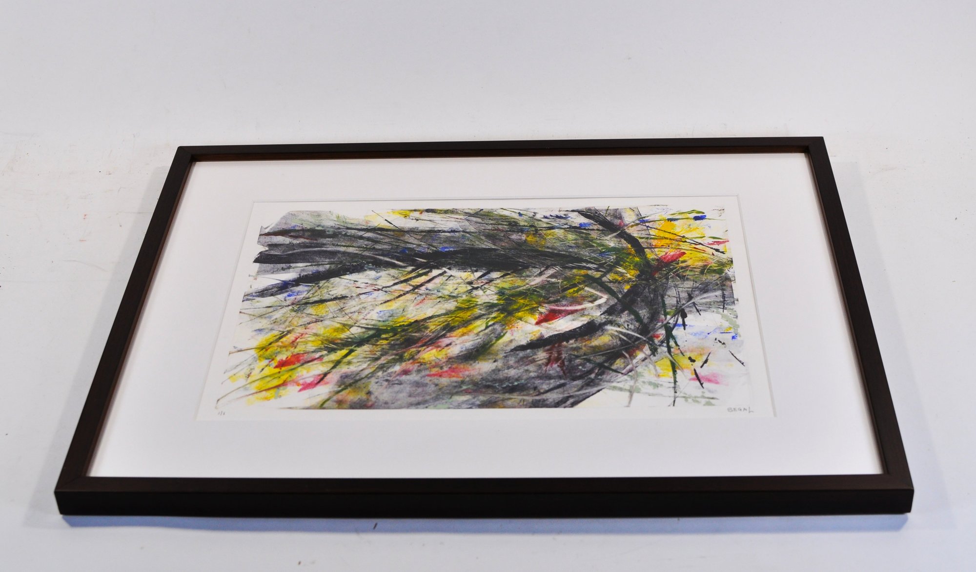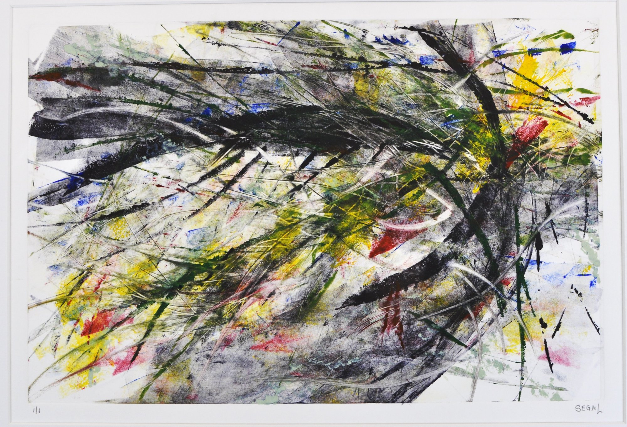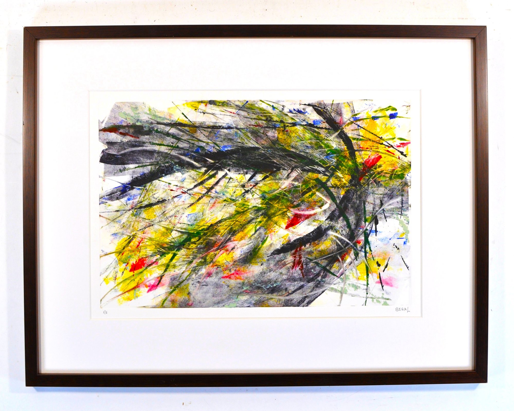 Dated 2016, featuring dynamic gestural marks and layered color fields in black, yellow, red, green, and blue. Signed lower right and numbered 1/1. Presented in a modern dark wood frame with wide white matting and glazing.