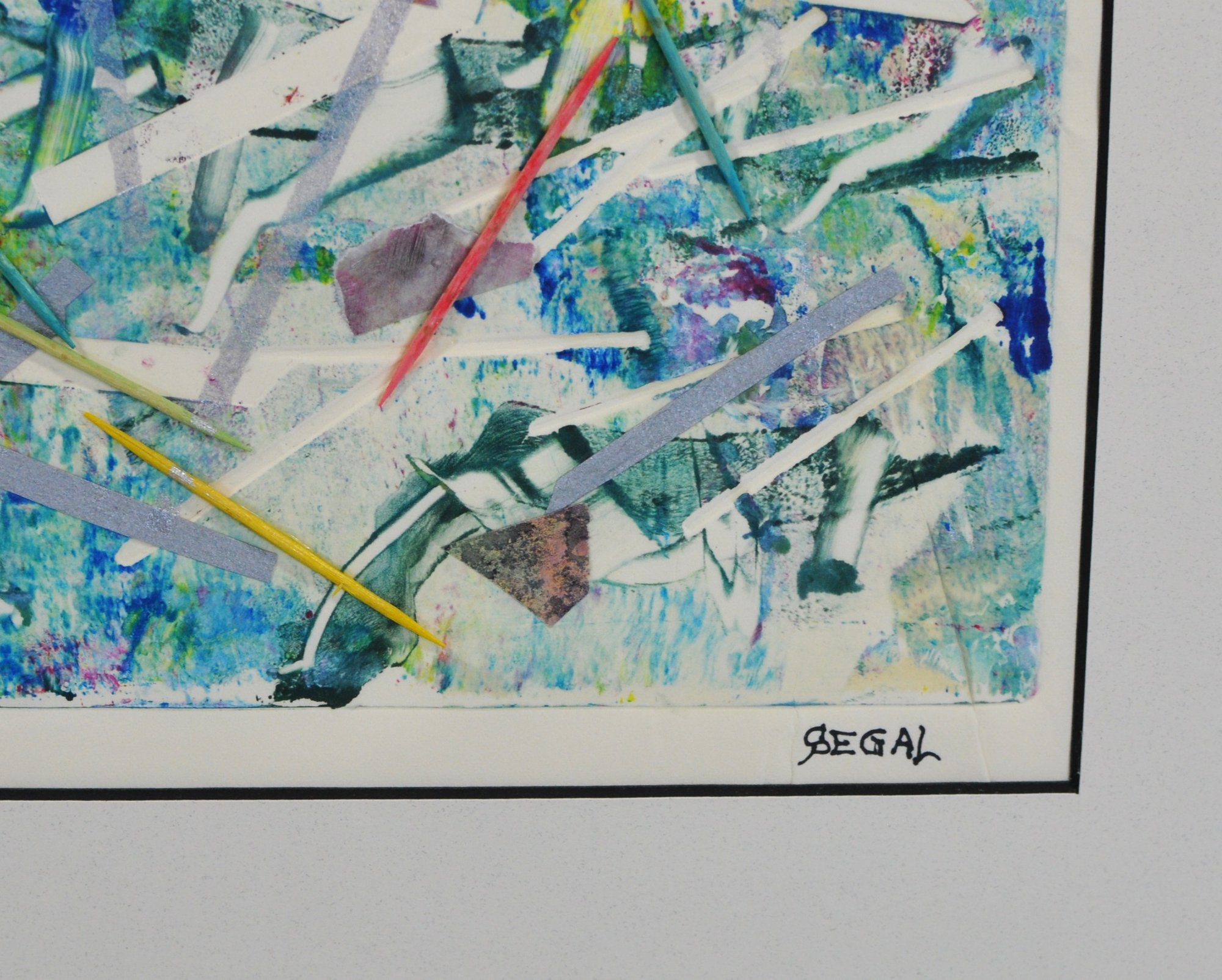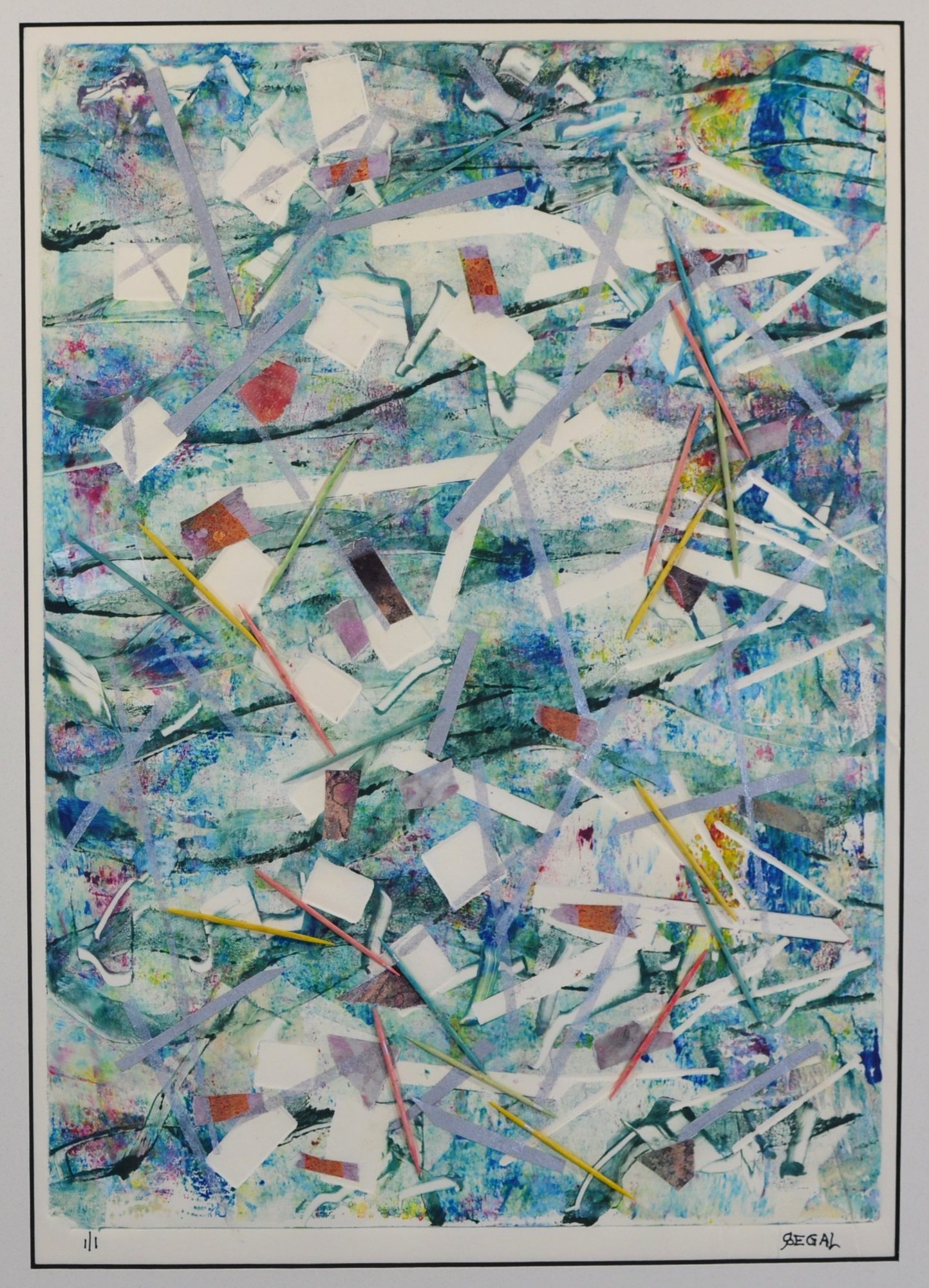 Executed as a monotype—produced as a unique, one-of-a-kind print—this work combines printmaking techniques with mixed media elements. Signed “Segal” in the lower right. Presented in a contemporary frame with gray matting and glazed.