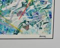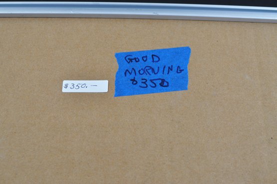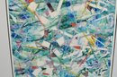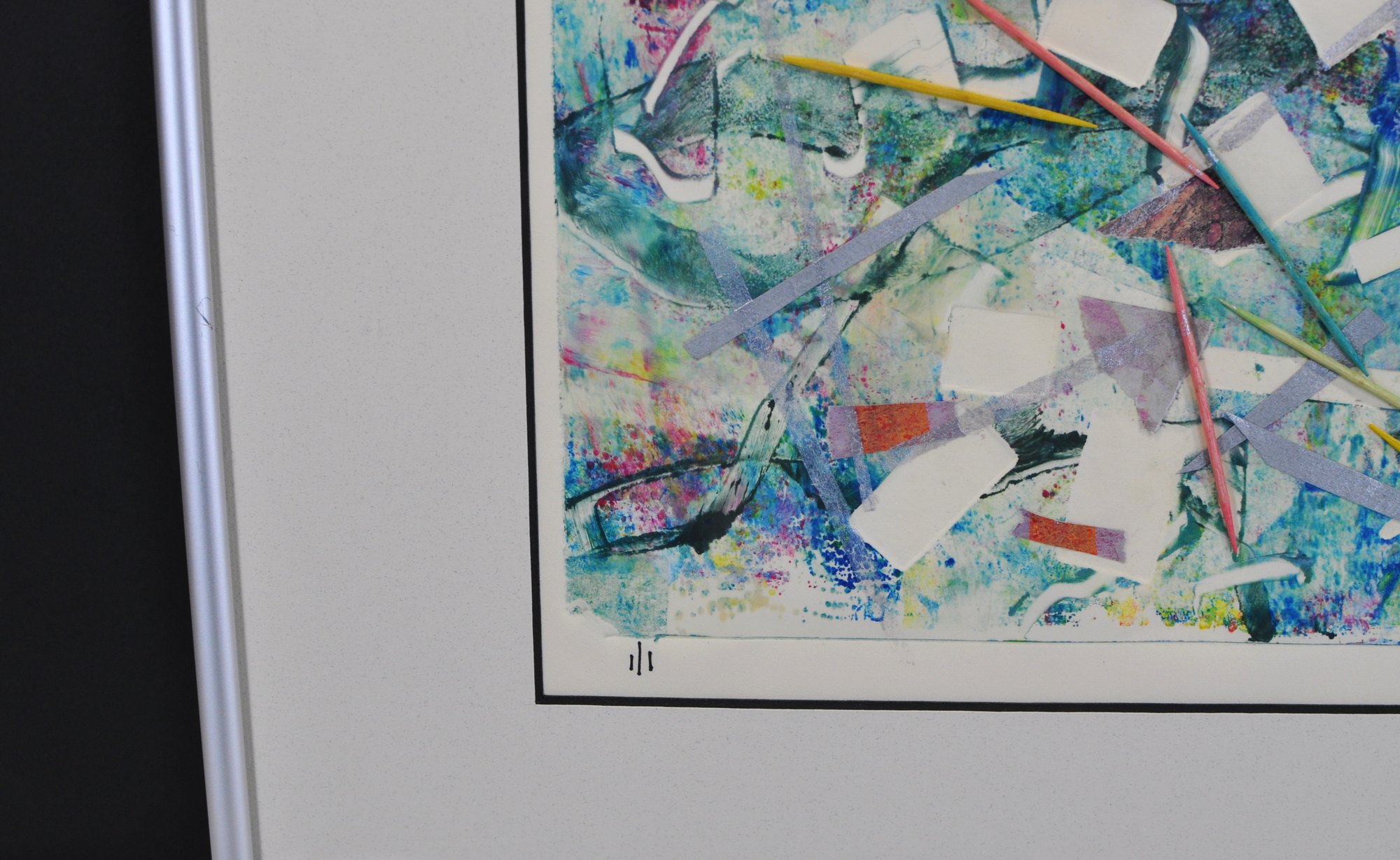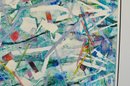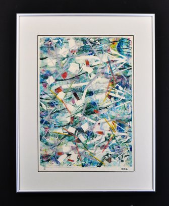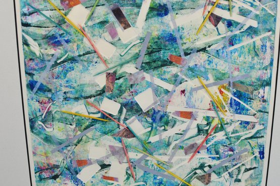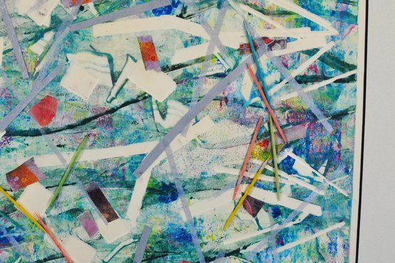 Original abstract monotype by Roberta Segal, titled “Good Morning.” Artist’s proof, 1/1, featuring layered color fields, linear gestures, and collage-like elements. Signed lower right and presented in a modern silver-tone frame with light grey matting and glazing.