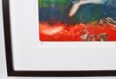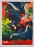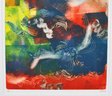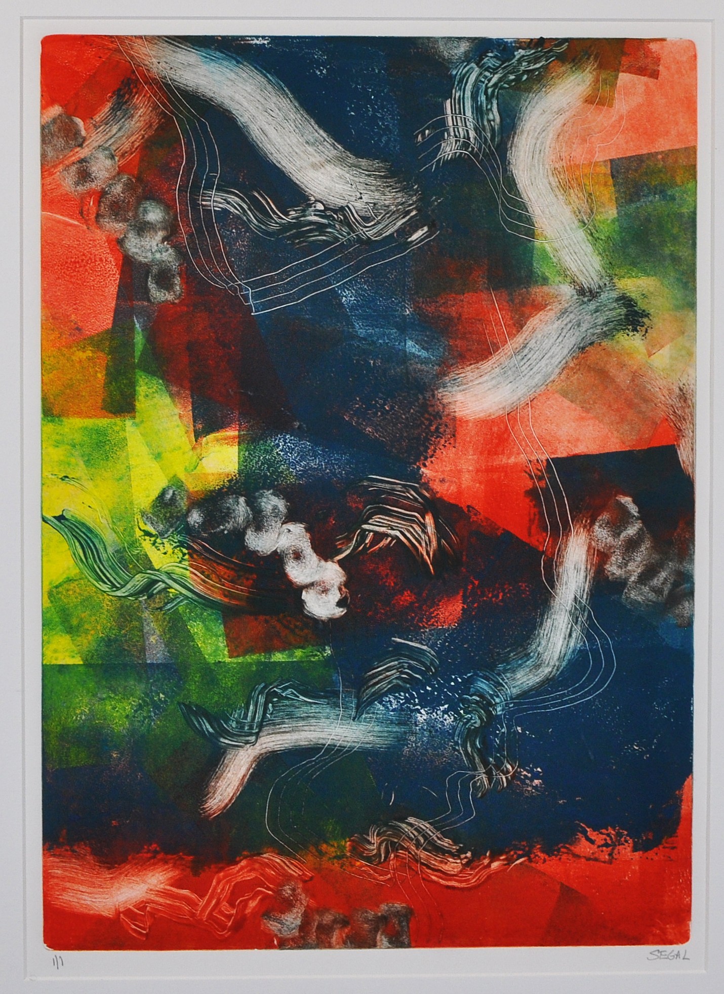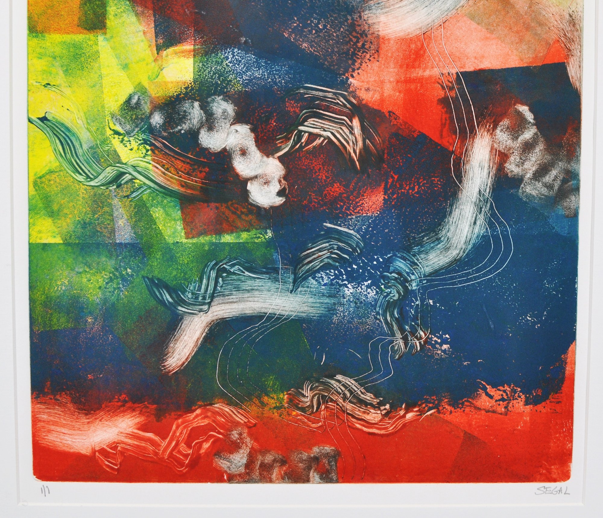 A vibrant abstract composition in bold reds, blues, greens, and white gestural forms, characteristic of Segal’s expressive mixed-media style. Pencil signed “Segal” lower right and numbered 1/1 lower left.