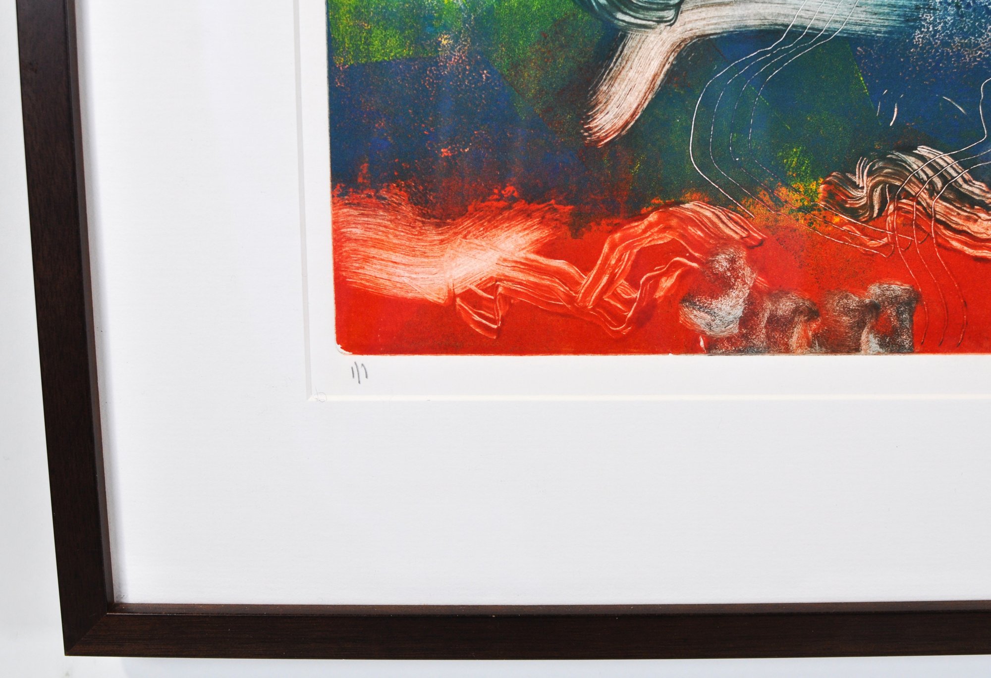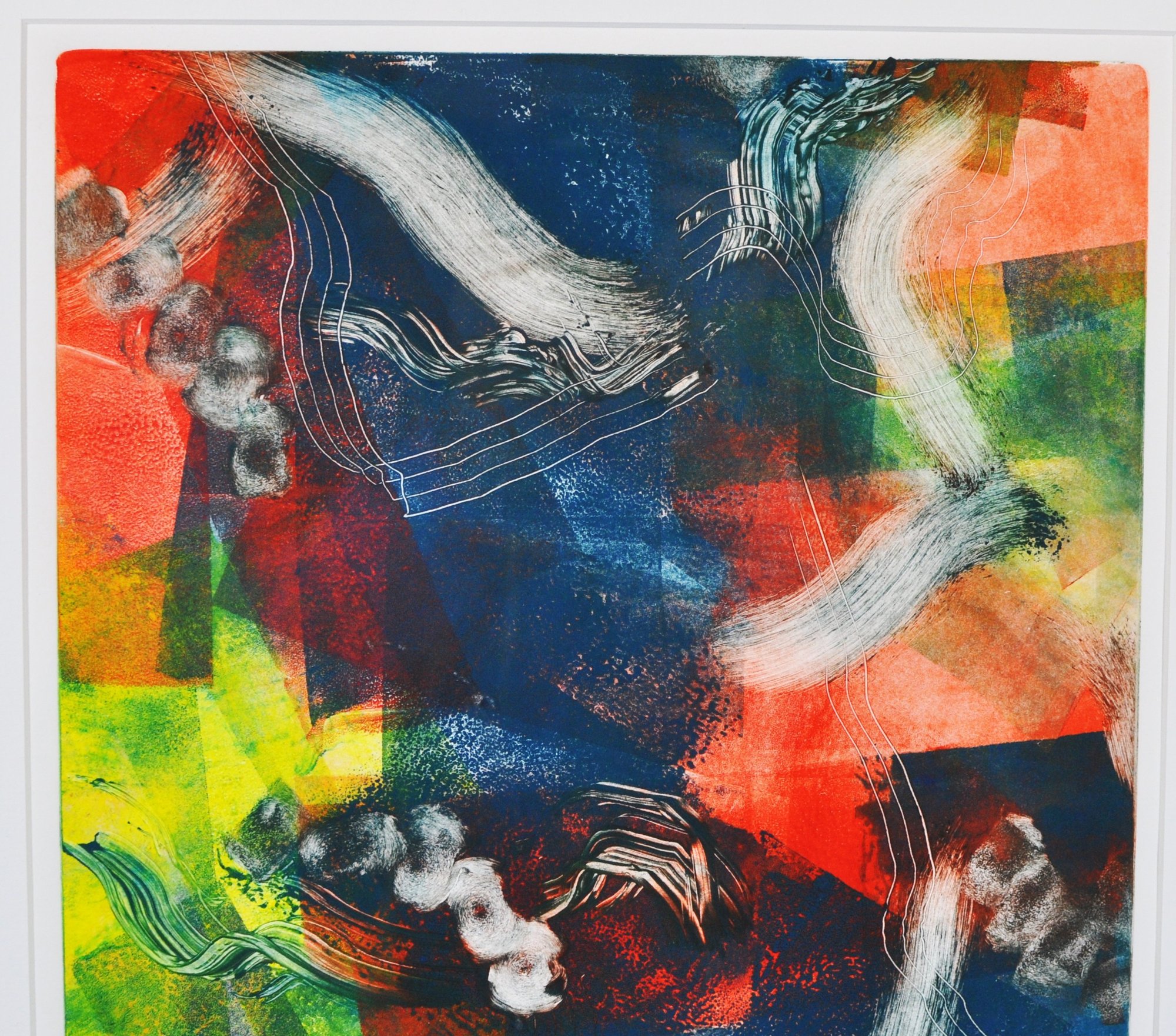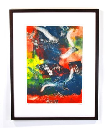 Executed as a monotype—produced as a unique, one-of-a-kind print—this work combines printmaking techniques with mixed media elements. Presented in a contemporary frame with white matting and glazed.