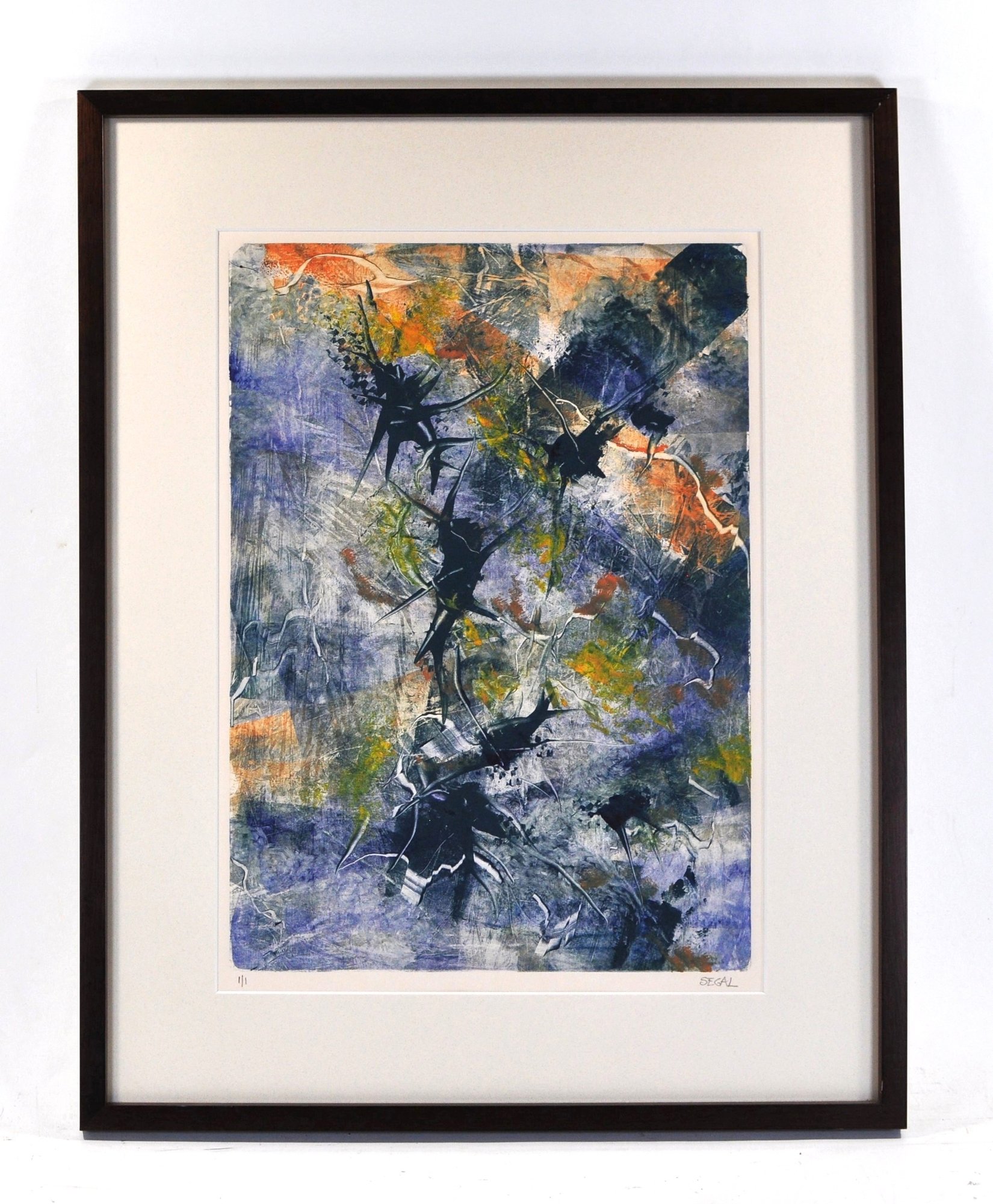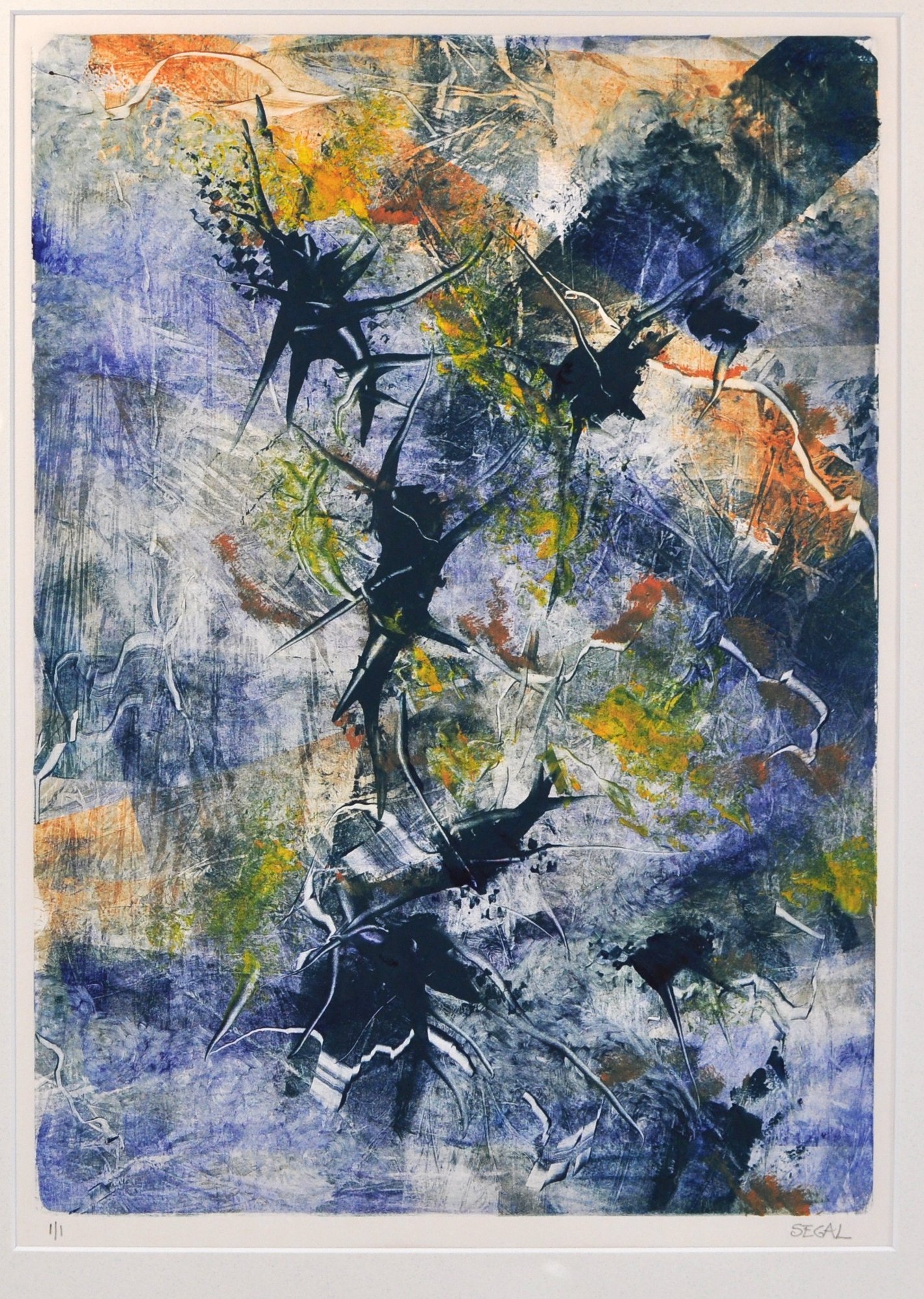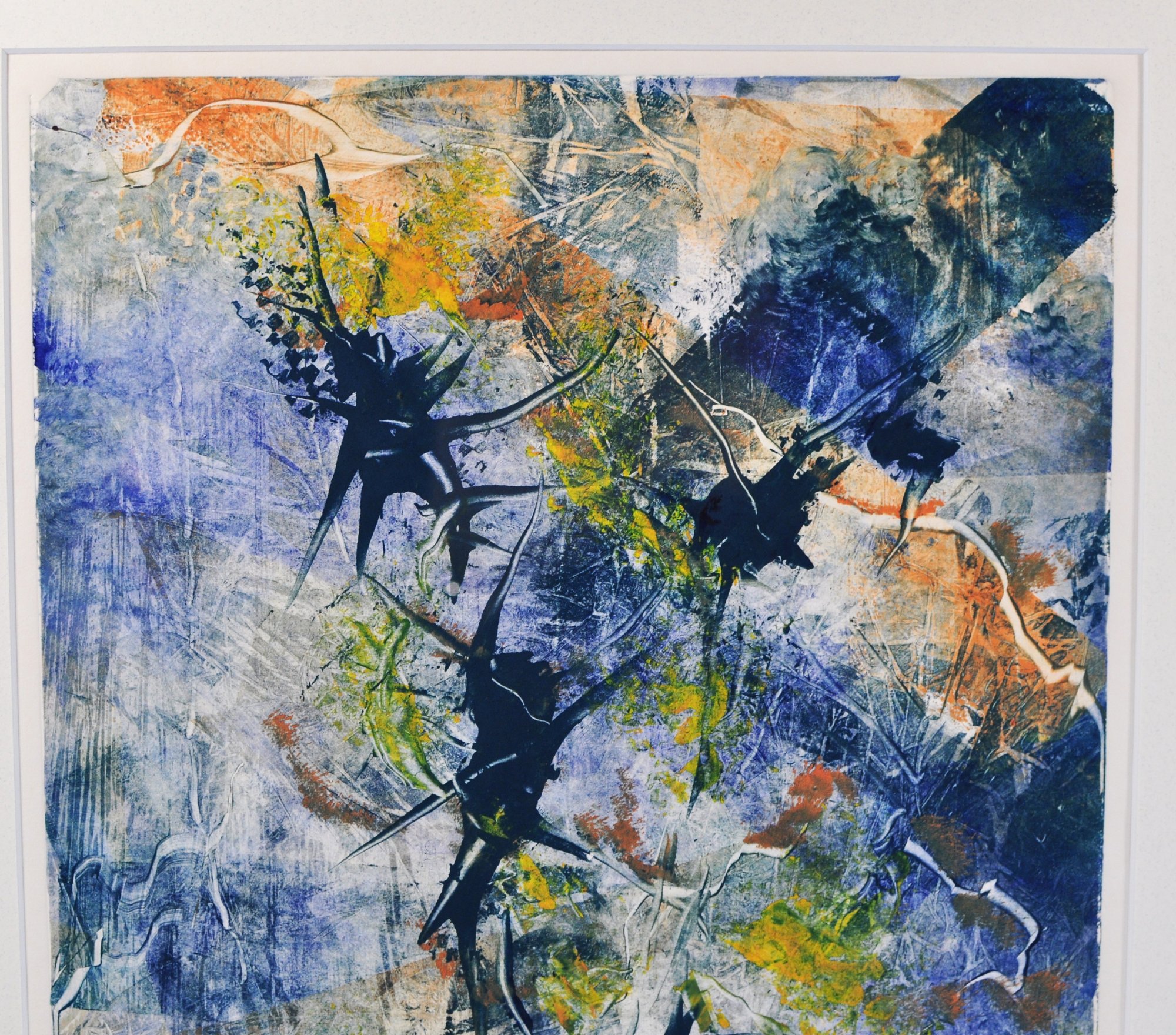 Original abstract monotype by Roberta Segal titled “Tension / Release.” Unique 1/1 work featuring expressive gestural forms and layered color fields in blue, gray, black, yellow, and orange. Signed lower right and numbered 1/1. Presented in a dark wood frame with wide white matting and glazing.