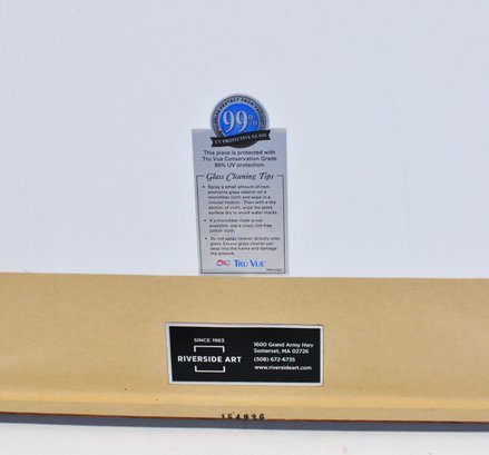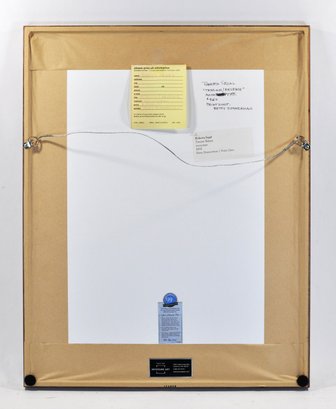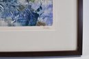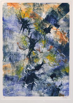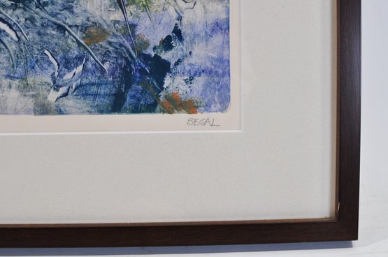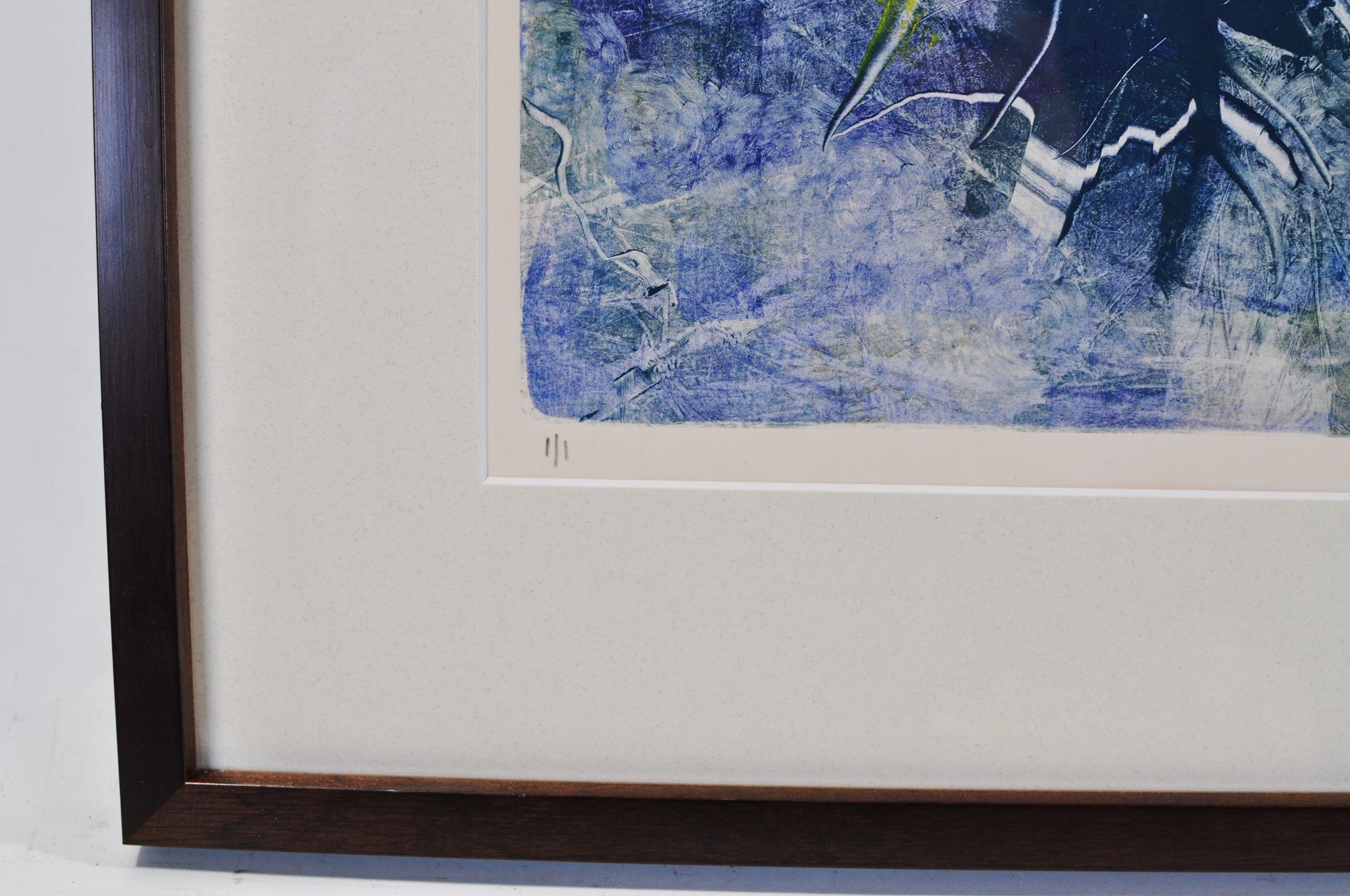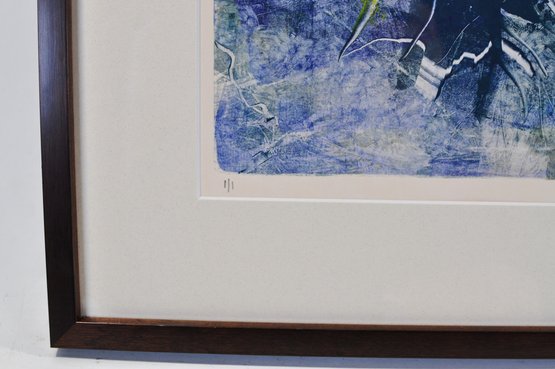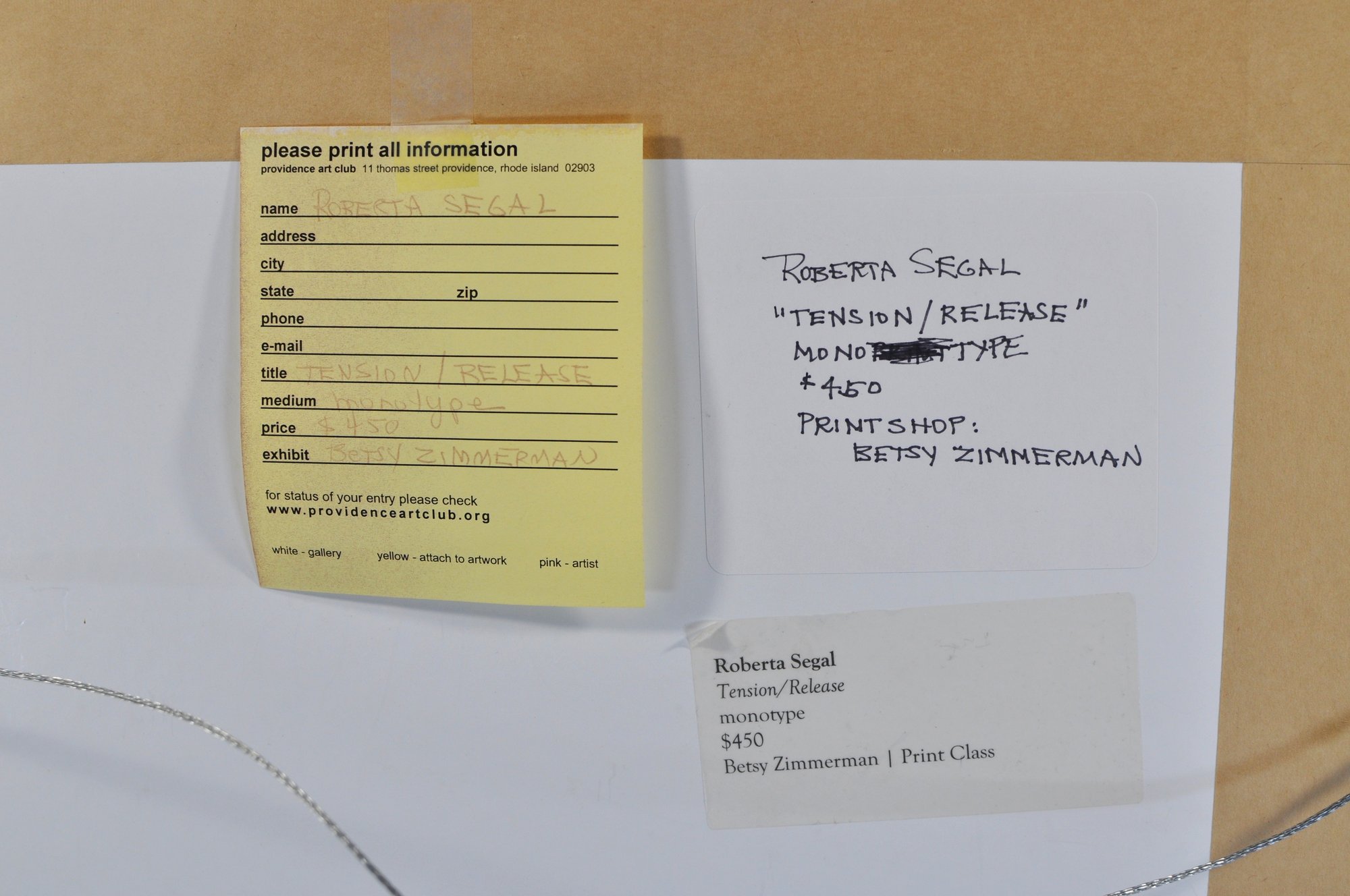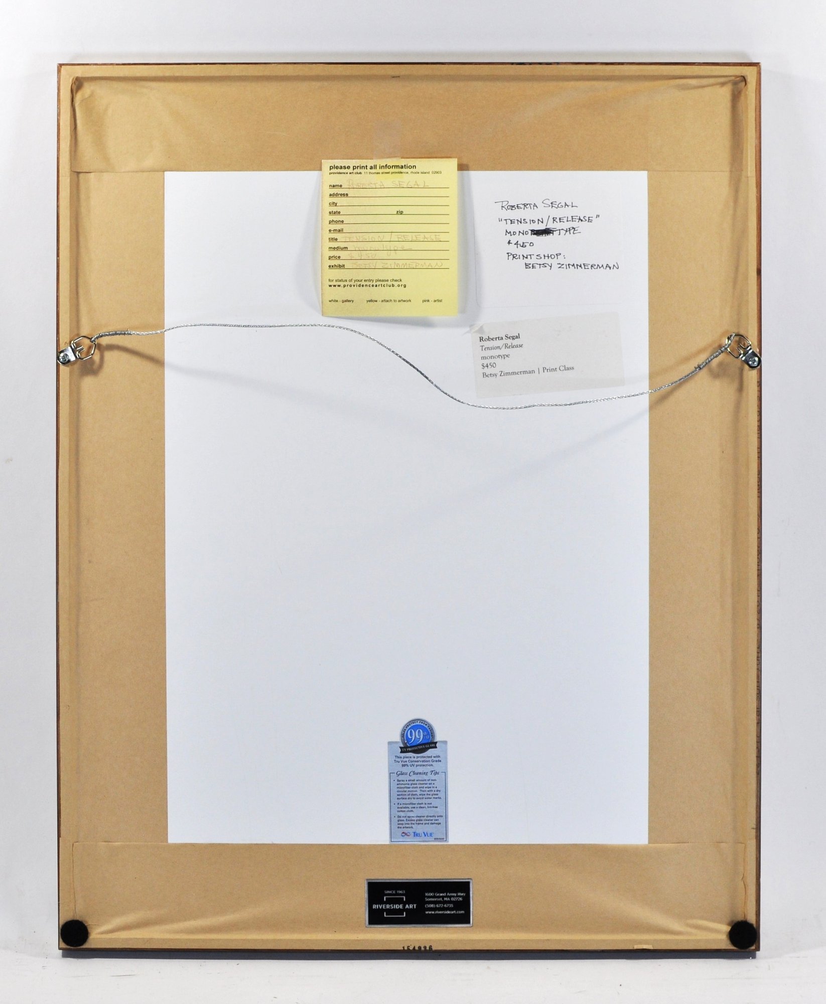 Original abstract monotype by Roberta Segal titled “Tension / Release.” Unique 1/1 work featuring expressive gestural forms and layered color fields in blue, gray, black, yellow, and orange. Signed lower right and numbered 1/1. Presented in a dark wood frame with wide white matting and glazing.
