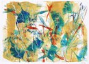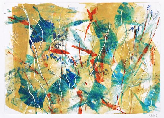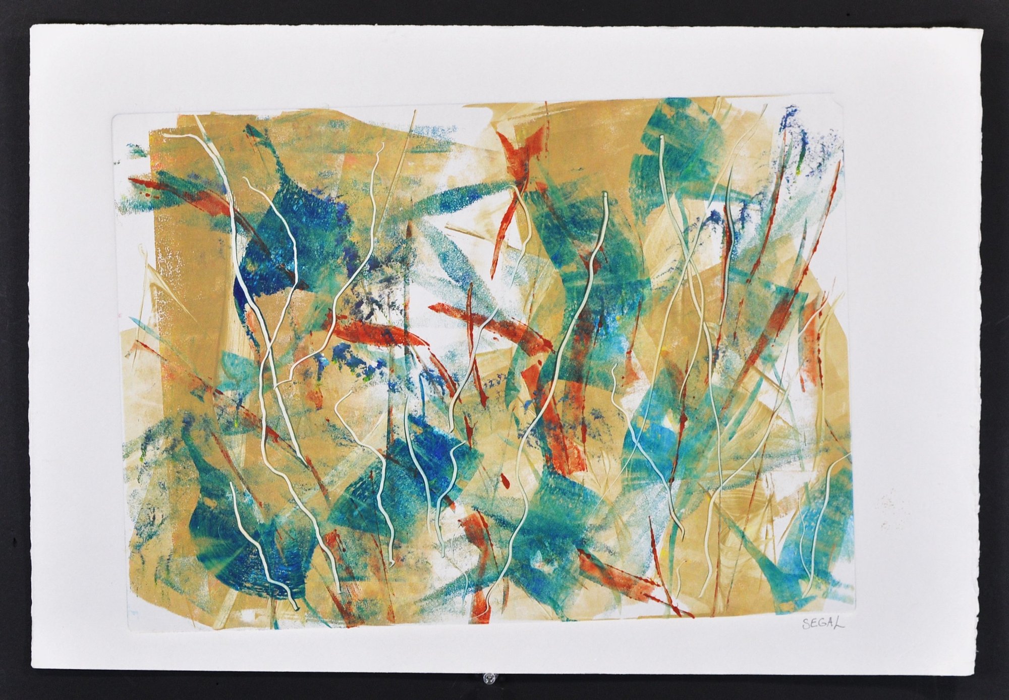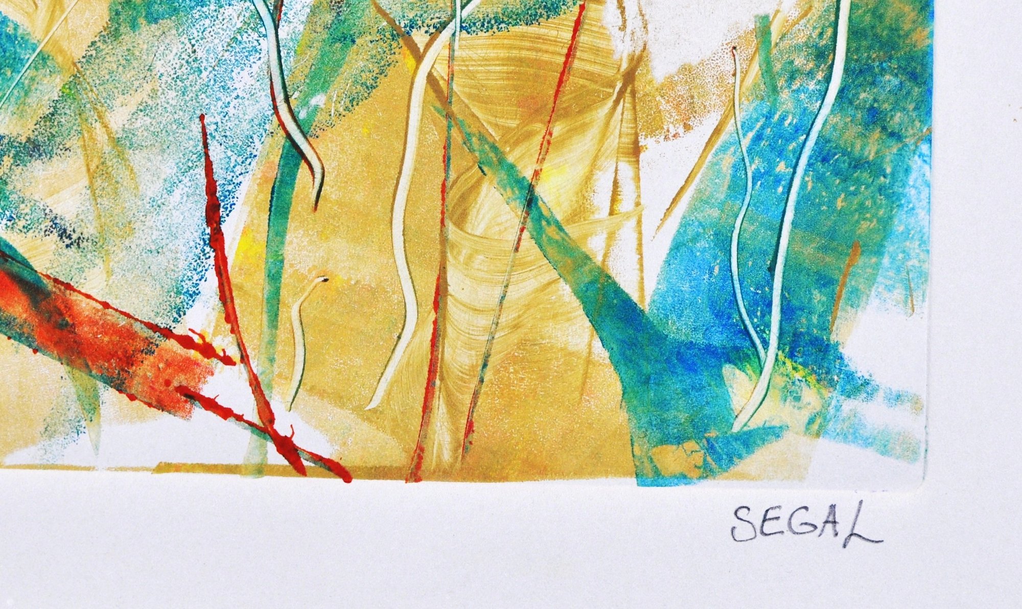 A lively horizontal composition in layered teal, blue, ochre, and red with white linear accents, showing Segal’s characteristic expressive mark-making. Pencil signed “Segal” lower right. Printed on handmade deckled-edge paper and presented unframed.