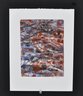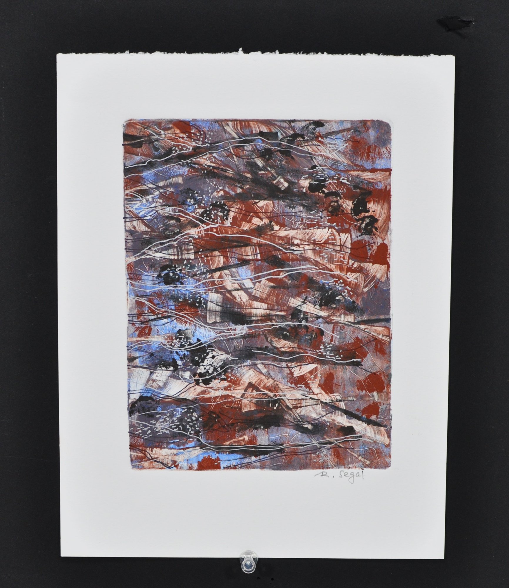 Original abstract monotype by Roberta Segal, signed “R. Segal” in pencil lower right. This richly layered composition features gestural black and white lines over textured planes of deep red, rust, slate blue, and soft lavender. Printed on heavyweight deckle-edged paper with plate impression visible.
