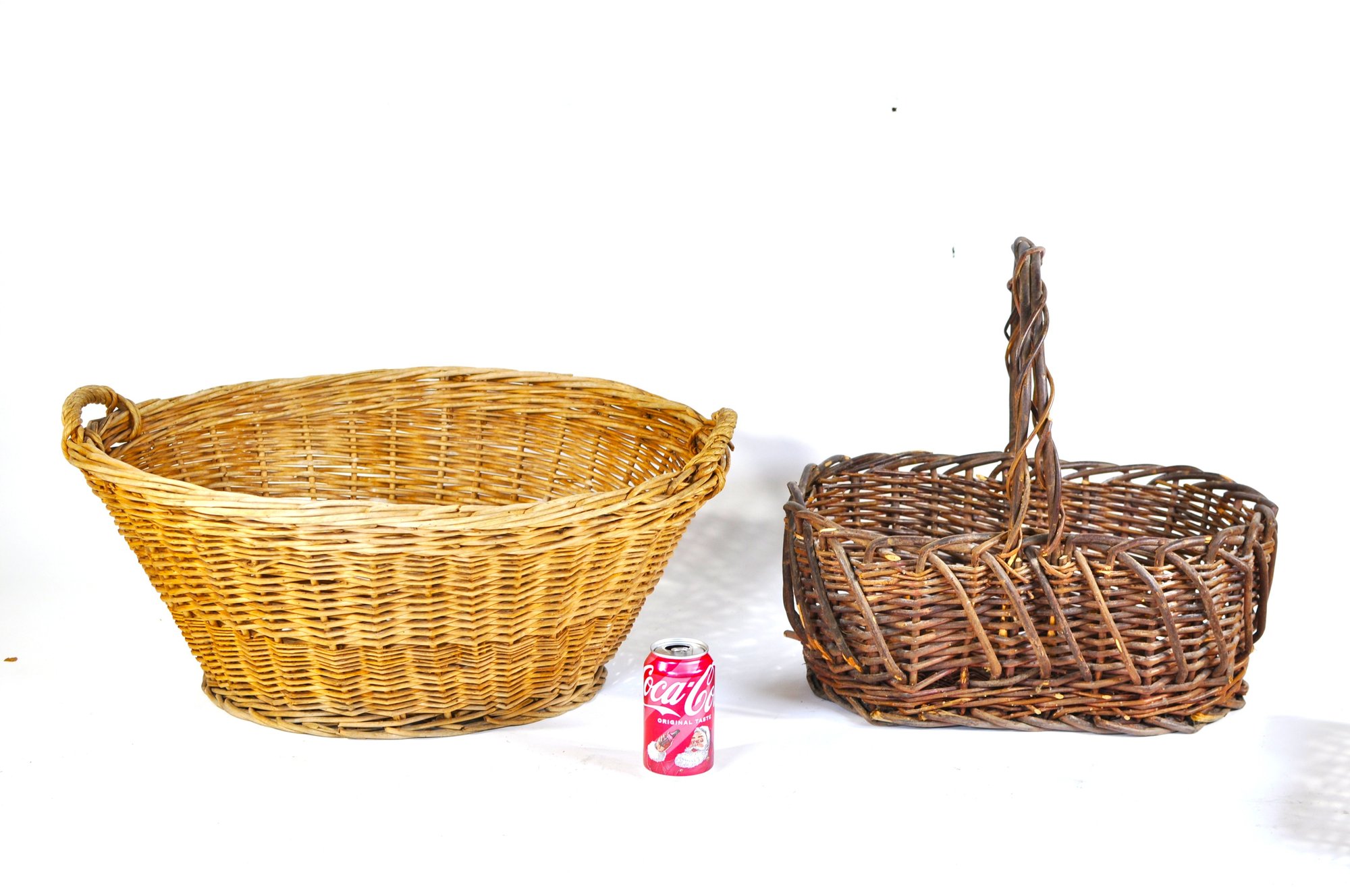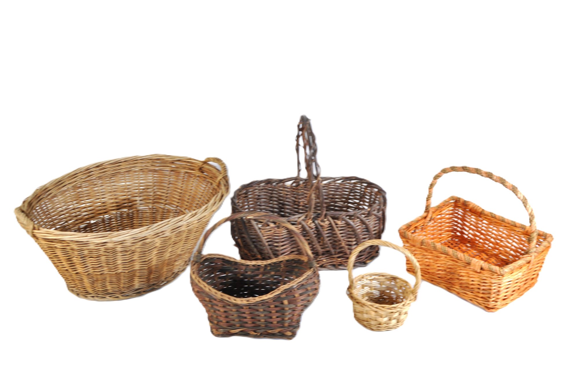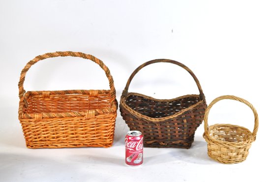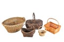 Nice assortment of five vintage woven baskets in various sizes, shapes, and weave patterns. Includes two larger utility baskets, one handled gathering basket, and two smaller decorative baskets. Made of wicker, rattan, and similar natural materials.