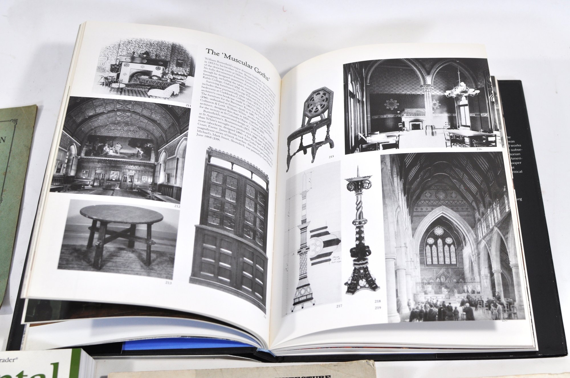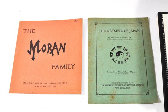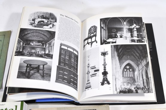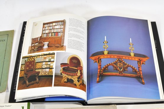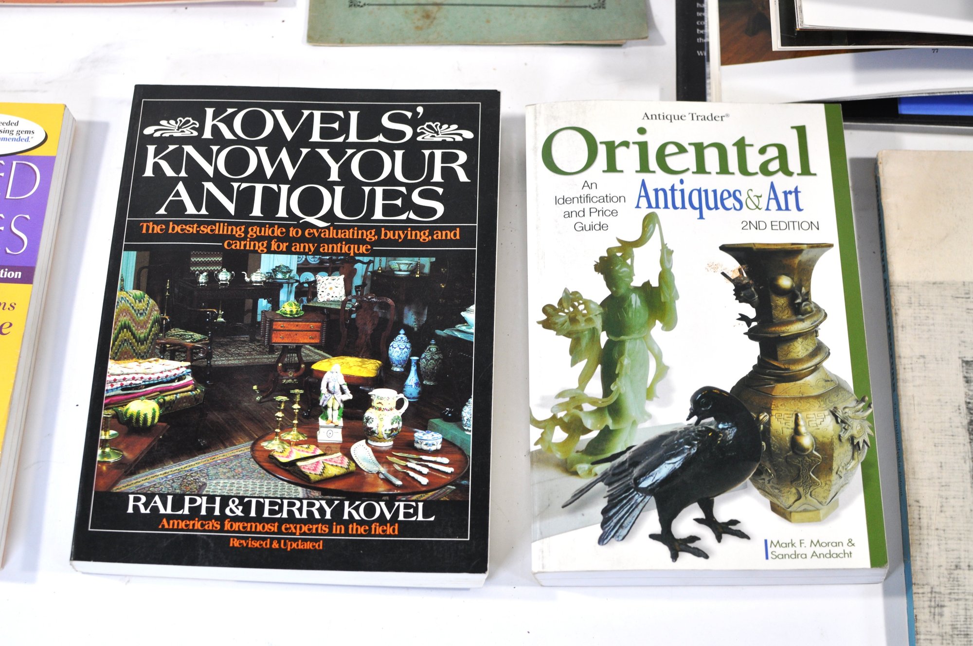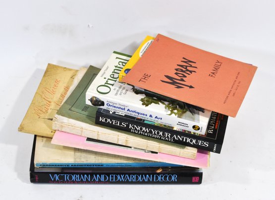 Collection of antique and decorative arts reference books and exhibition catalogues, including titles on Japanese netsuke, Oriental antiques, Victorian and Edwardian décor, gemstones, early lighting, and American art and architecture.