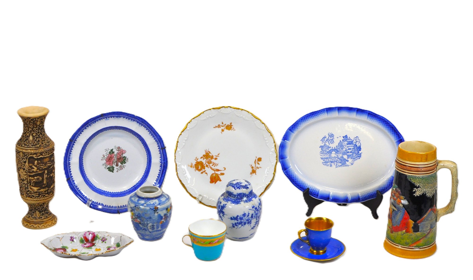 Assorted vintage and antique ceramics including two blue and white ginger jars (one marked with Asian characters), a carved resin Italian “Sasa” vase, Adams English blue transferware plate, Limoges France floral plate, colorful demitasse cups and saucers, and a German-style beer stein marked 300. A charming mixed lot of collectible decorative pieces from Europe and Asia. Good overall condition with light age wear.