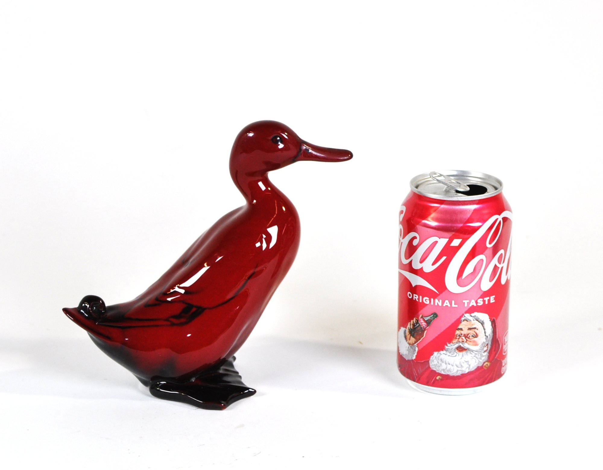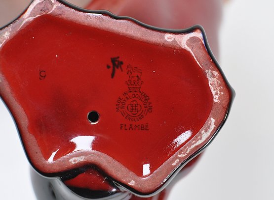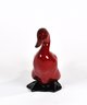 A flambe glazed figurine depicting a standing mallard drake, shown with upward curving tail and stylized webbed feet. The figurine is crafted in the deep crimson flambe finish with subtle black accenting. Modeled in a naturalistic pose with the head slightly turned and detailed facial features including defined eyes and a prominent beak. The body features incised feather details along the back. This figural piece is presented in a rich red glaze with high-gloss finish and graduated black accents at the base and tail. Royal Doulton backstamp.