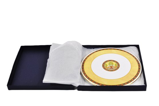 Royal Worcester “Versailles” fine bone china plate, made in England, dated 1996. Features a rich gold border and a colorful classical motif with gilt accents.