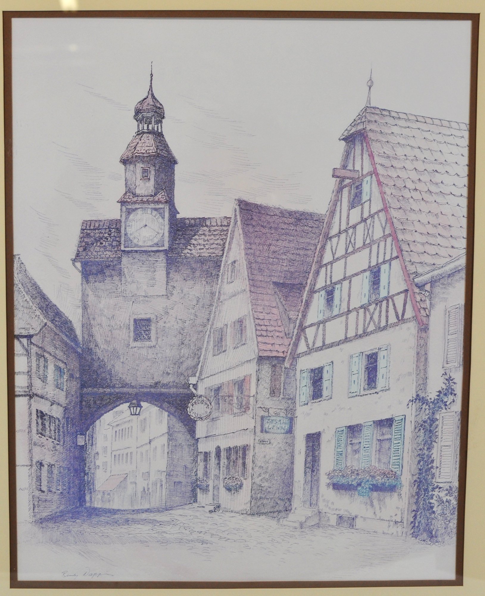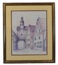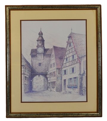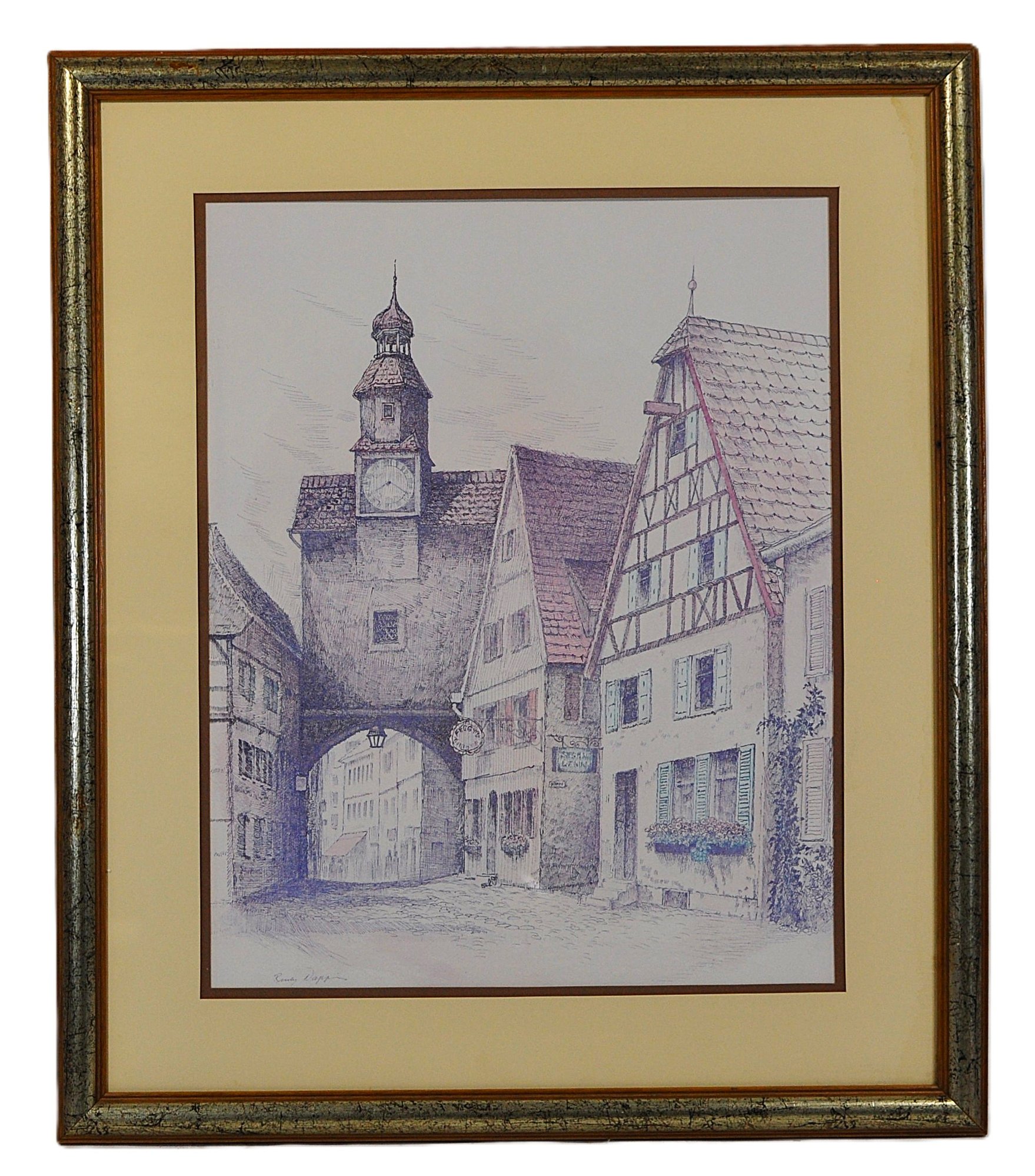 Decorative print depicting a charming old European village street with timber-frame houses and a clock tower archway leading into the town. The scene is rendered in fine linework with subtle color accents, capturing the character of historic architecture and cobblestone streets.