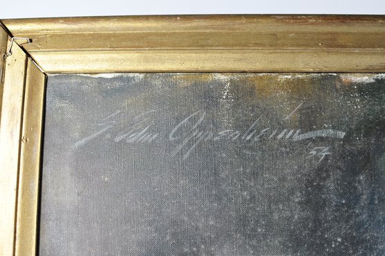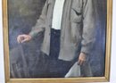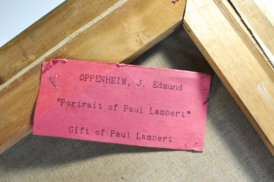 Large vintage oil-on-canvas portrait of a gentleman, identified on reverse as “Portrait of Paul Lambert” by America Belorussian artist Edmund Oppenheim. Traditional three-quarter length composition showing sitter with umbrella and coat. Retains old frame and paper label on verso noting “Gift of Paul Lambert.”