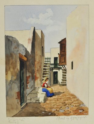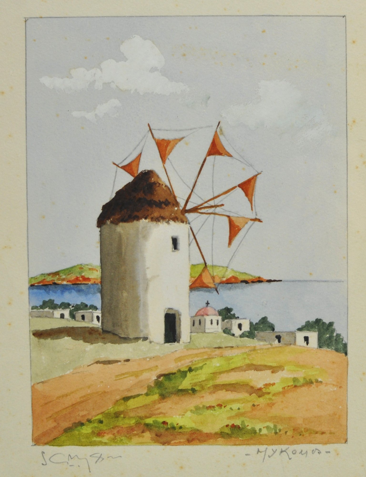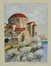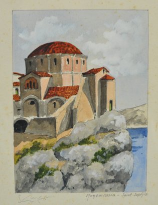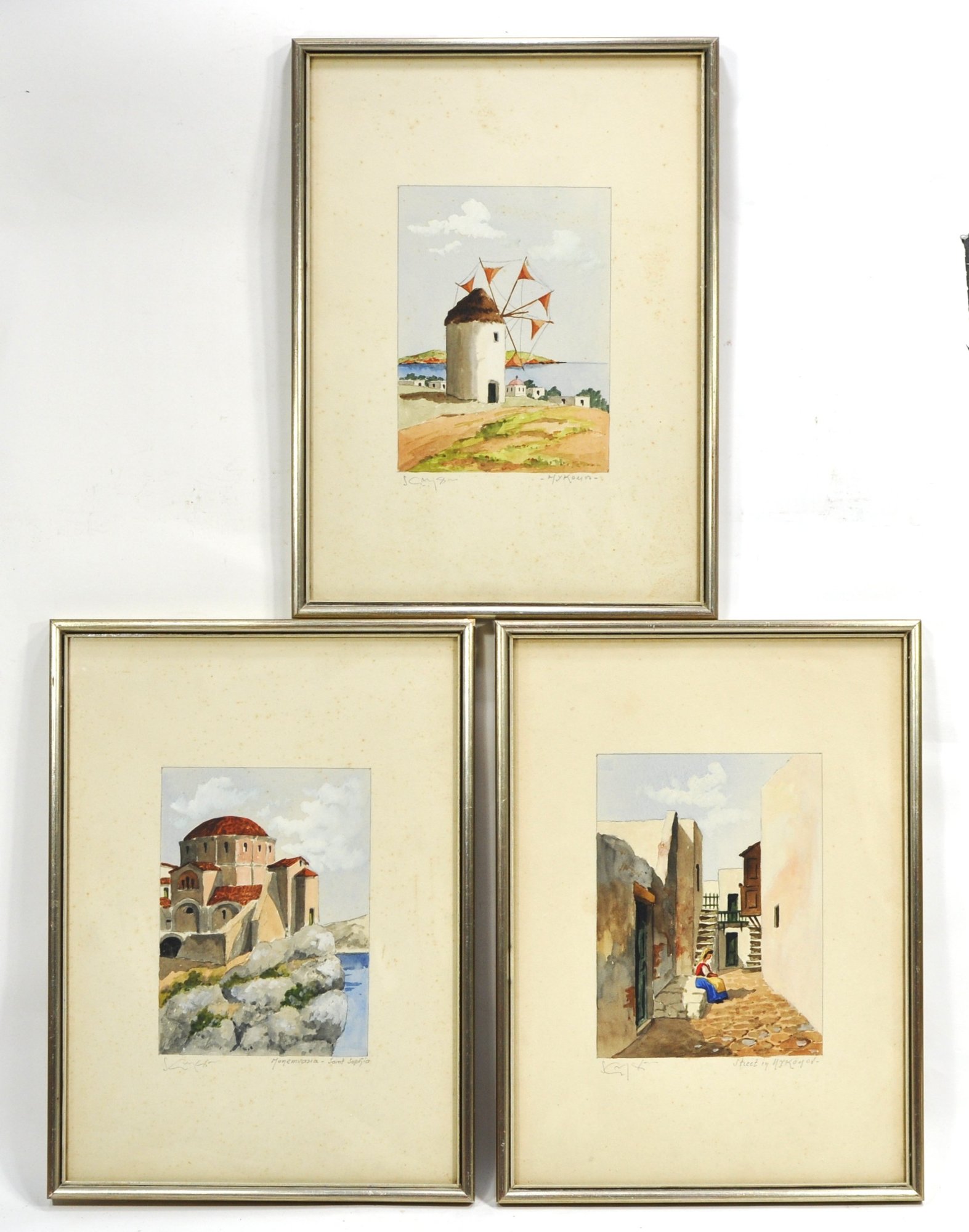 Attractive set of three watercolor paintings depicting Mediterranean/Greek coastal scenes, including a windmill landscape, a domed church identified as Monemvasia – Saint Sophia, and a village street scene with seated figure. Each is delicately painted in a soft, sunlit palette with fine architectural detail.