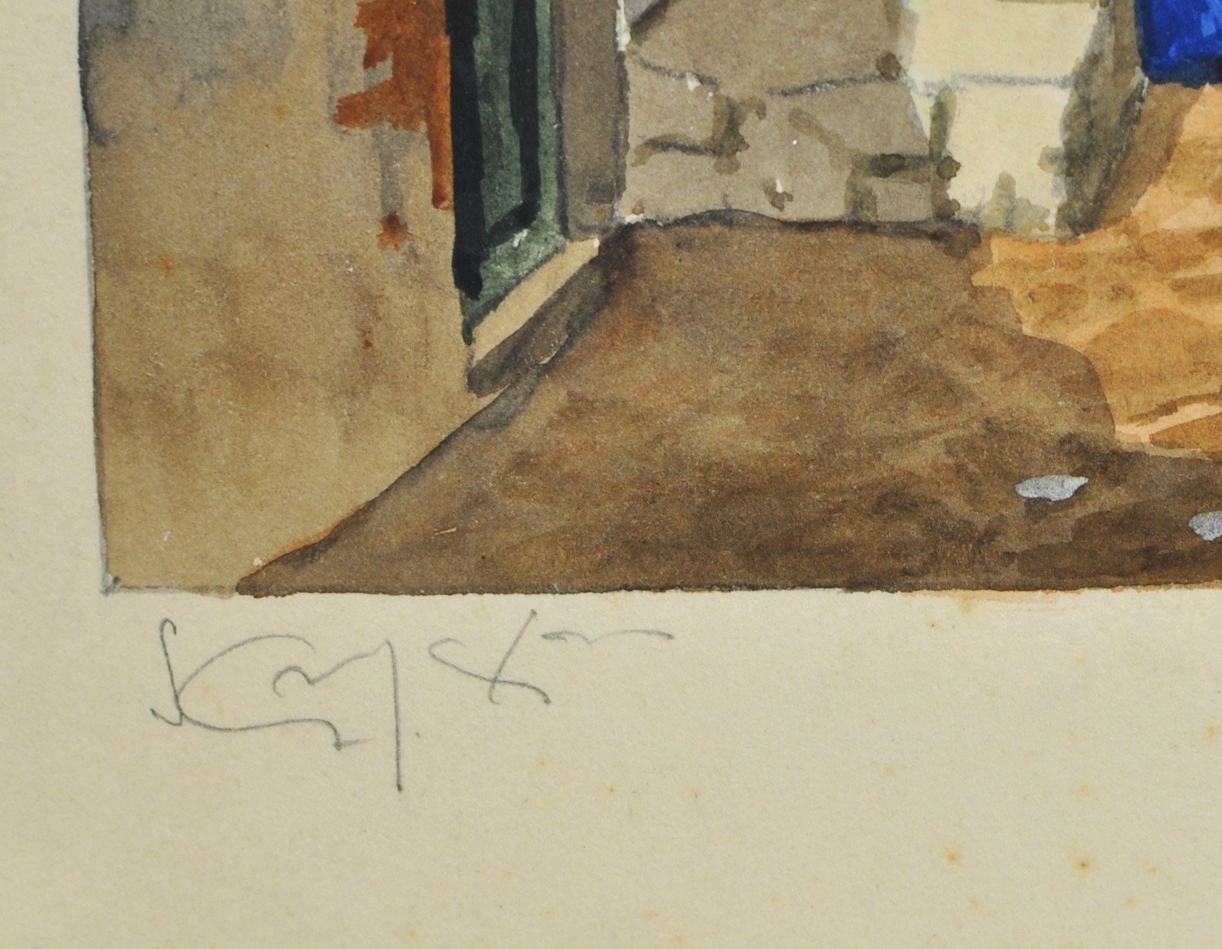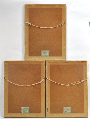 All three works are illegibly signed in pencil and titled along the lower margins. Executed on paper and presented under glass and mat in matching vintage frames. One frame has a chip.