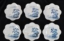 Charming set of six small blue-and-white porcelain dishes, each featuring a delicate hand-painted landscape scene with tree and rock motifs, along with calligraphic script. The lobed, flower-shaped rims give the set an elegant, decorative appeal.