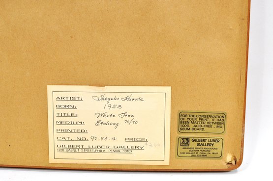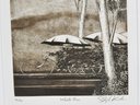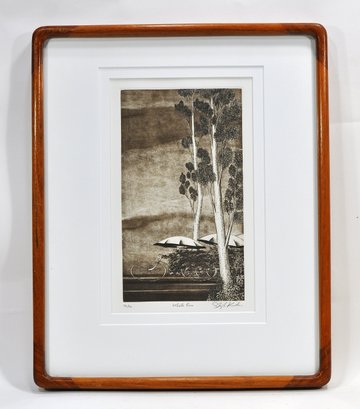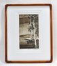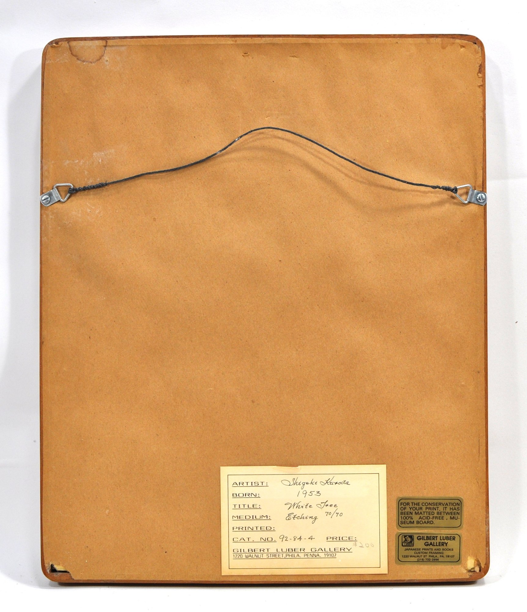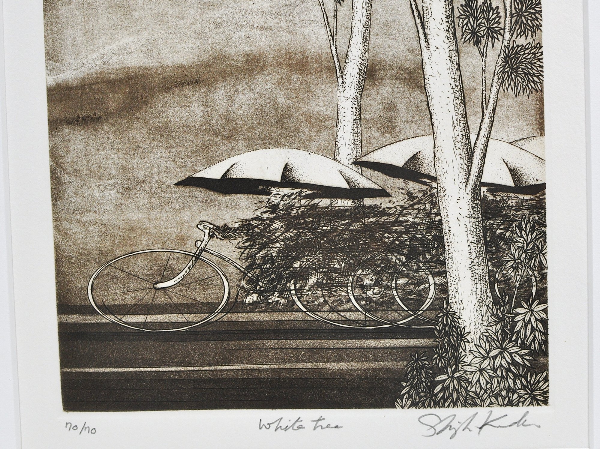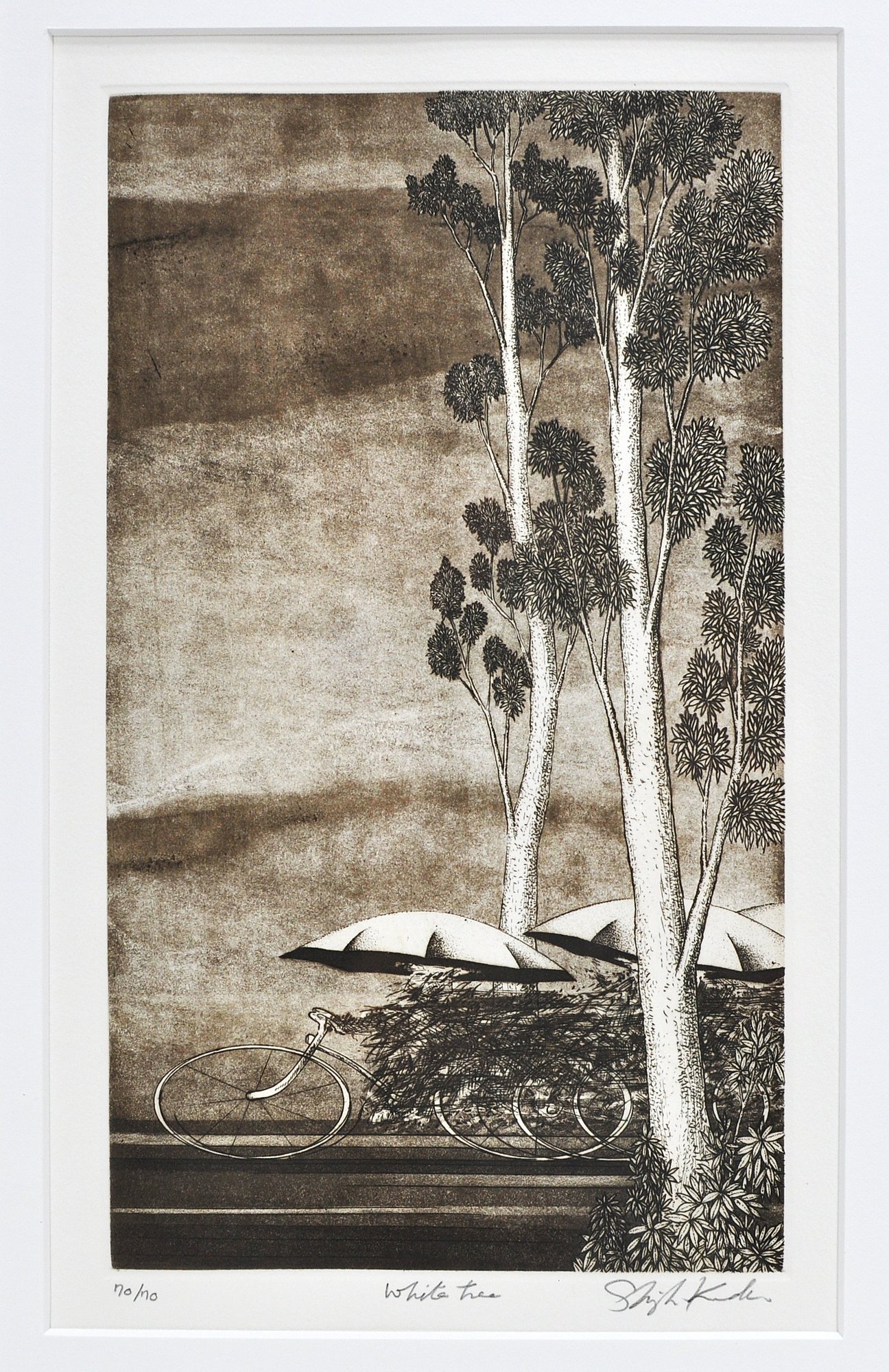 Original etching titled “White Tree” by Japanese artist Shigeki Kuroda (b. 1953). This finely detailed monochrome composition depicts stylized trees in the foreground with a bicycle and parasol forms set against a softly tonal landscape, executed with delicate linework and atmospheric shading.