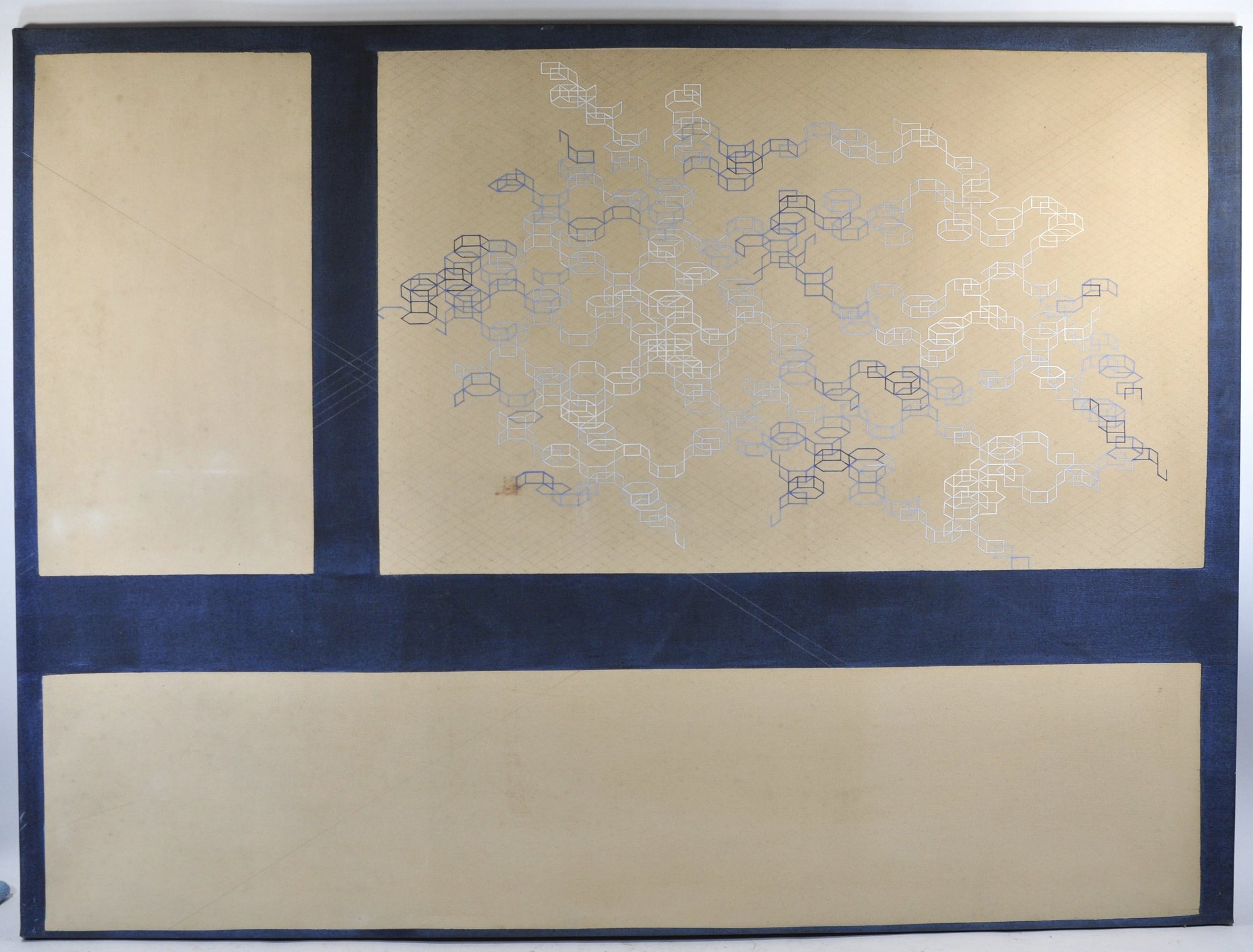 Intersecting cubic line forms on a gridded field, with indigo structural bands.