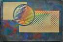 Features vivid overlapping grids, circular and rectangular forms, and a dynamic color field rendered in a pointillist technique. A striking mid-century modern composition blending structure and motion.