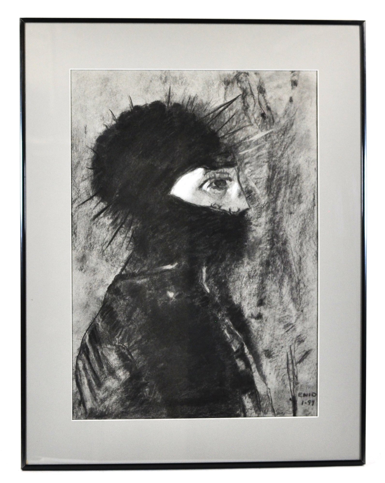Original expressive charcoal portrait of a hooded or armored figure in profile, signed Enid and dated 1-97 lower right. The brooding, introspective tone and dramatic chiaroscuro evoke the Symbolist style of Odilon Redon’s 1891 Armor, with its haunting psychological presence and dreamlike abstraction.