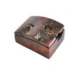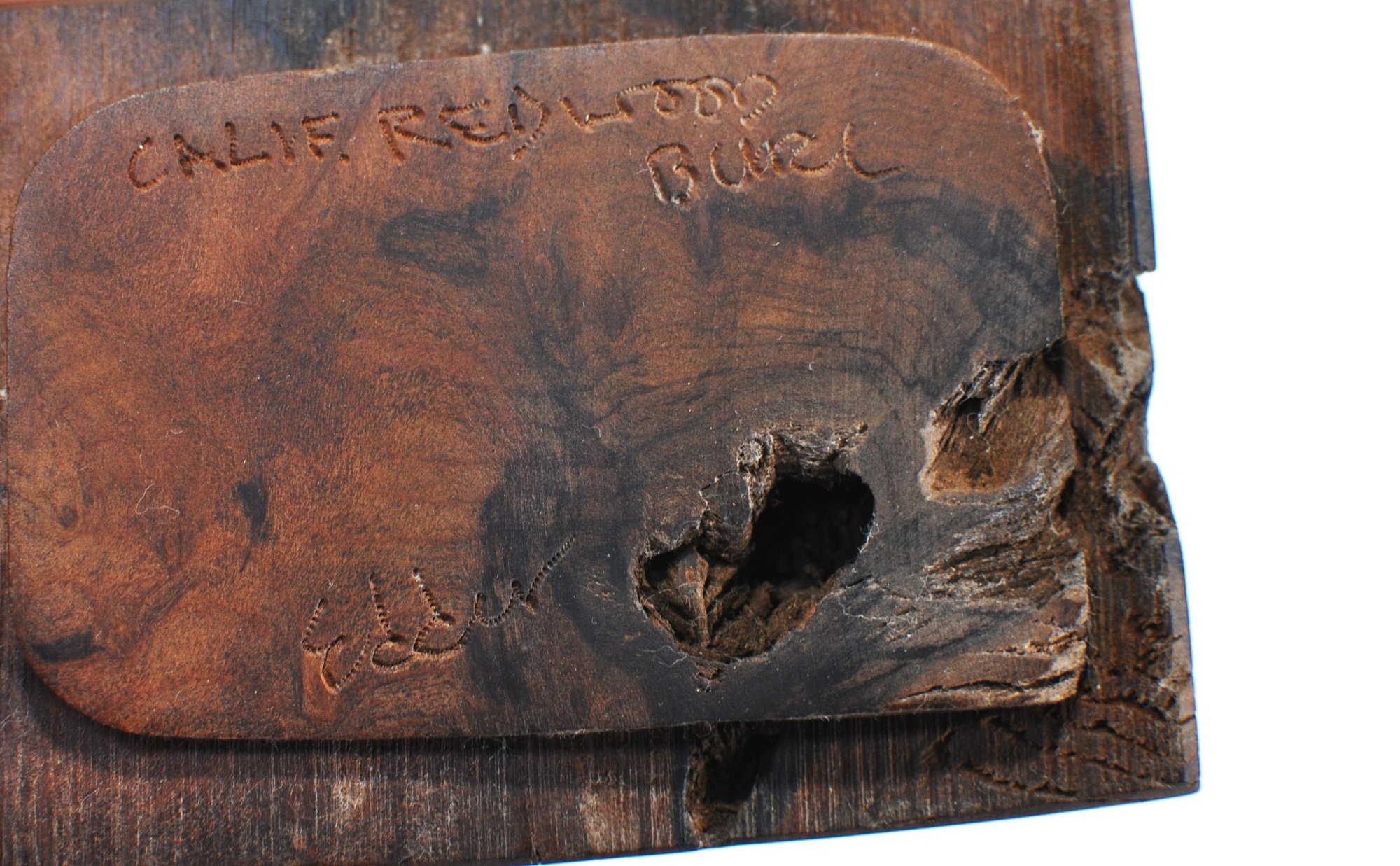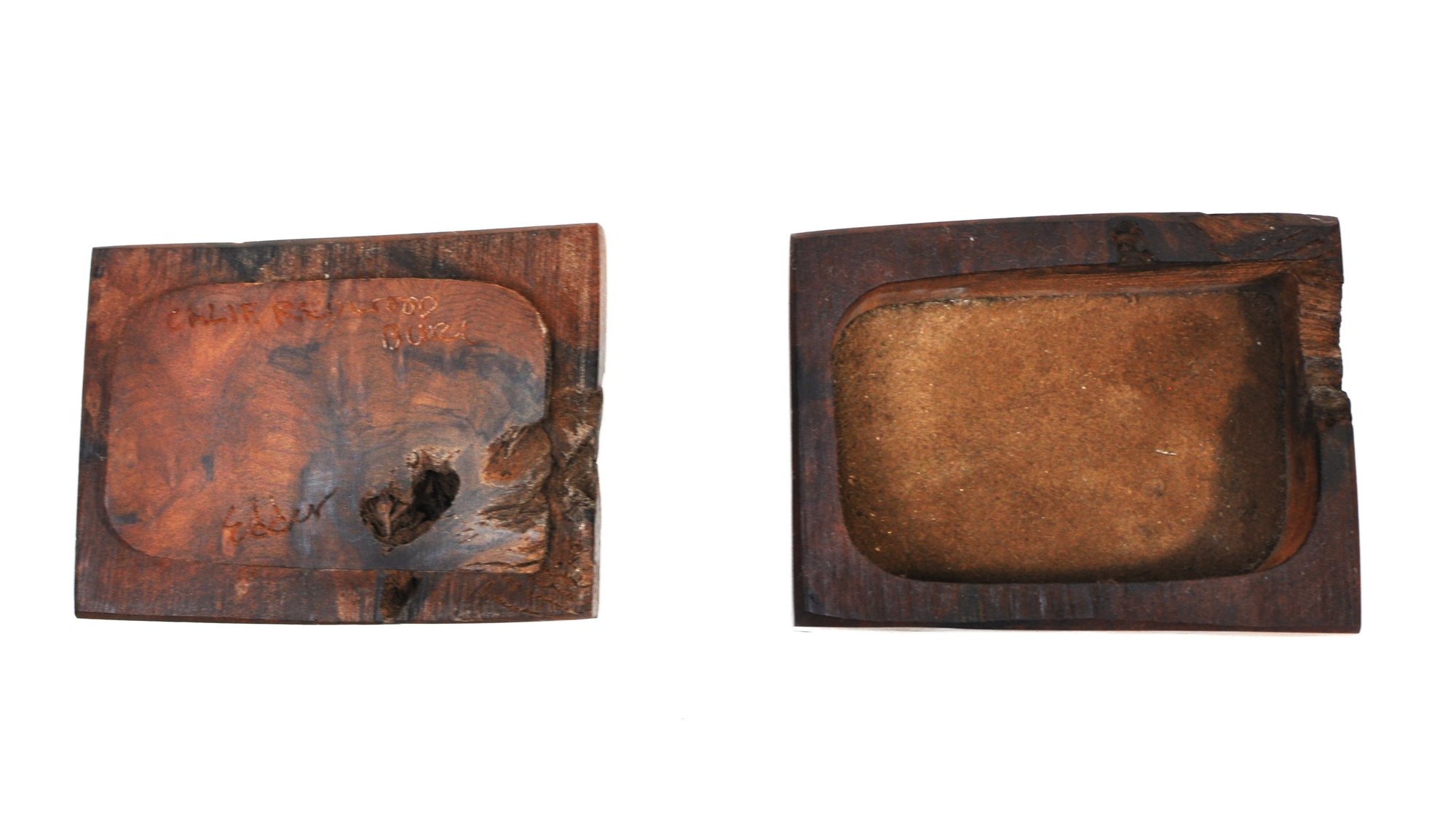 The interior is lined with suede, providing a soft, finished surface suitable for jewelry, keepsakes, or desk use. The underside of the lid is carved and marked “Calif. Redwood Burl / Edder,” identifying the artisan and material.