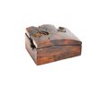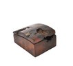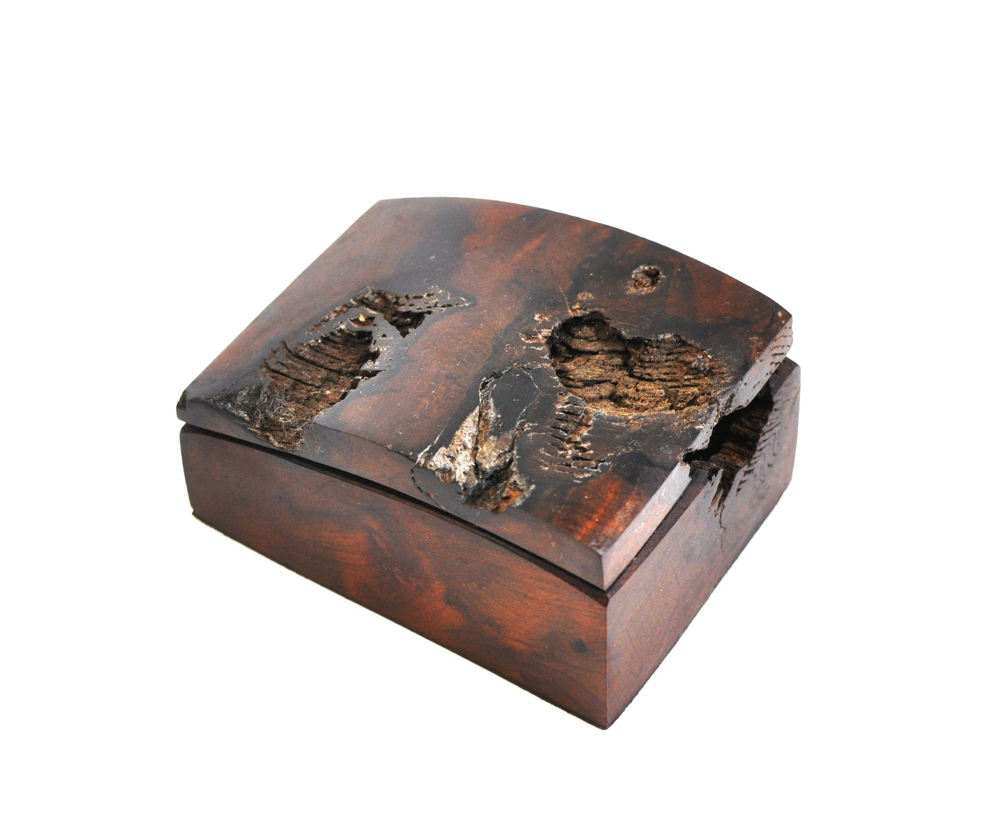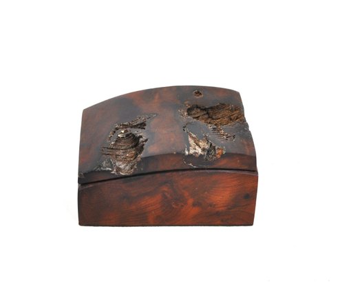 Handcrafted lidded box carved from richly figured California redwood burl, showcasing dramatic natural grain, knots, voids, and organic inclusions characteristic of burlwood. The box features a gently curved lid and a warm, polished finish that enhances the depth and movement of the wood.