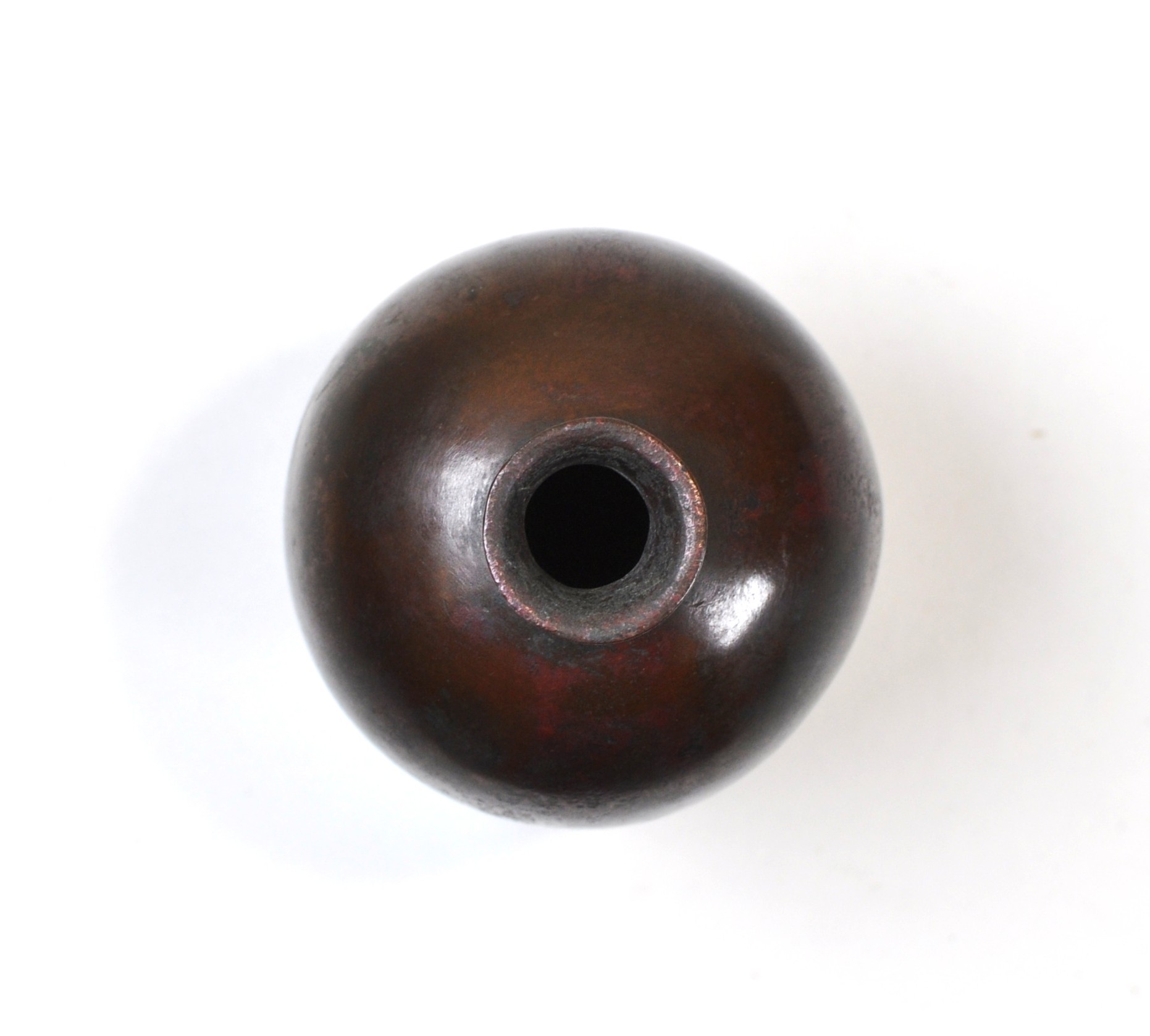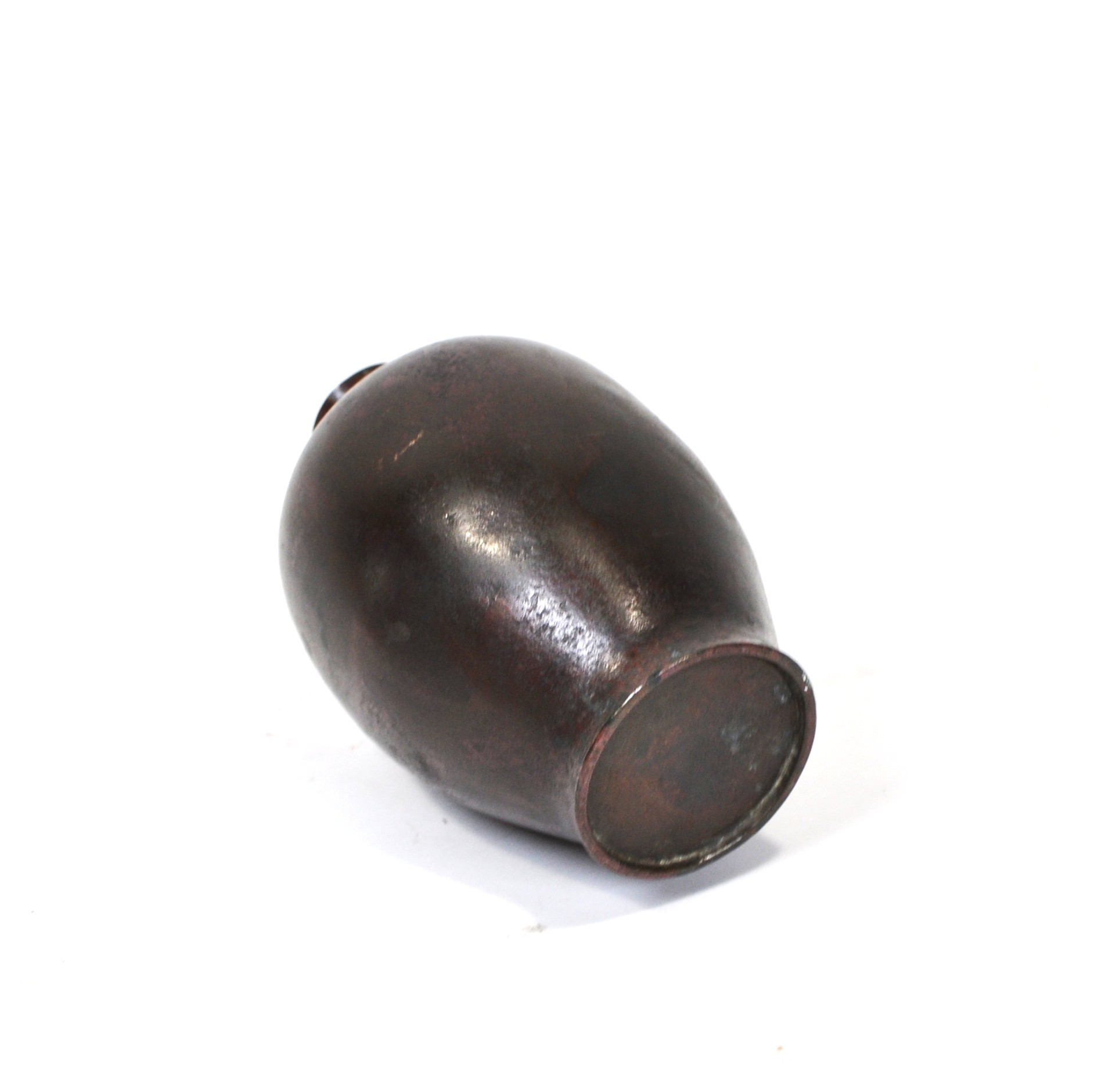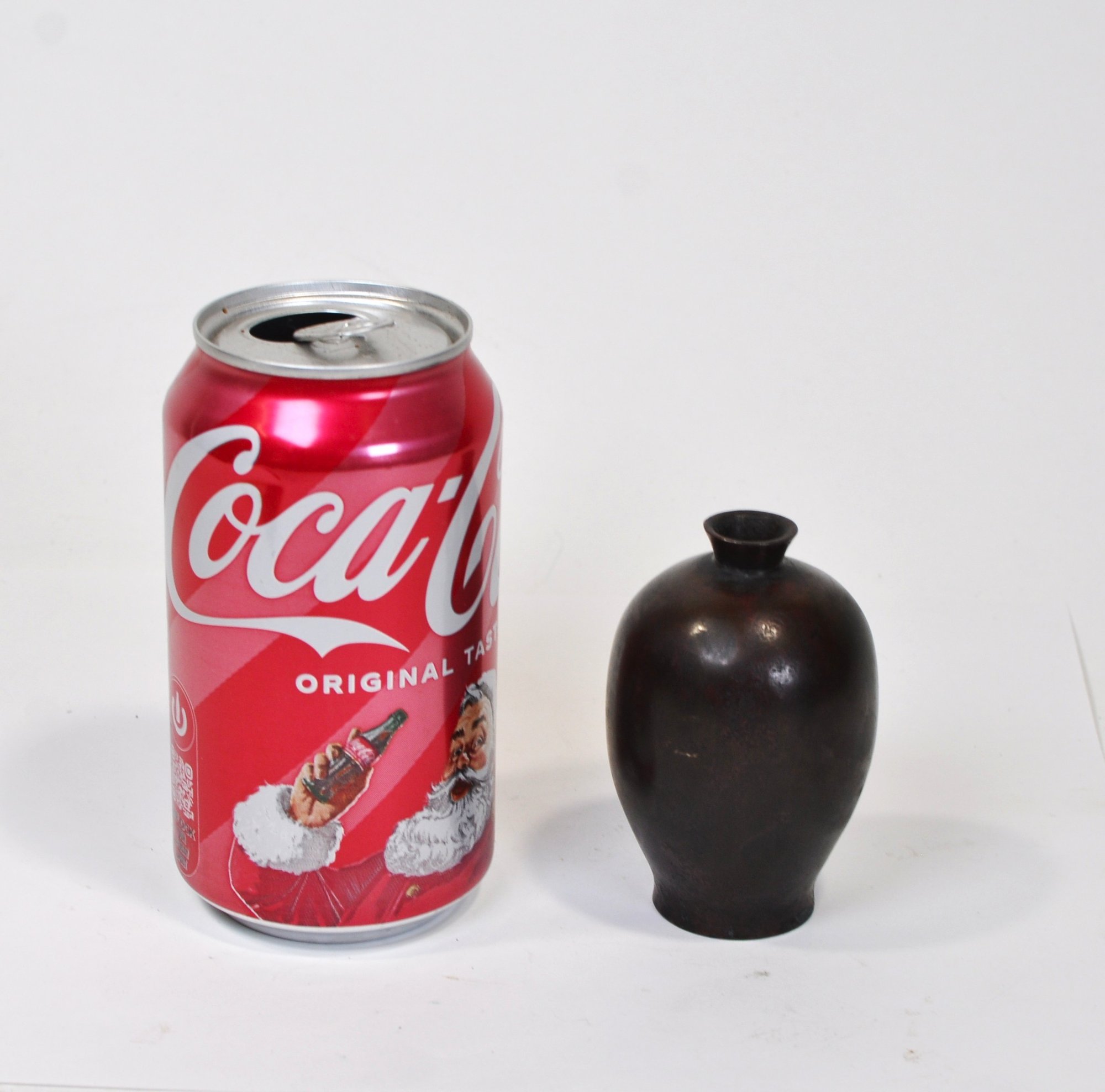 Small 19th century Japanese bronze vase, formed in a classical baluster-shaped vessel with rounded shoulders, short neck, and subtly flared rim. The vase is cast in bronze and finished with a rich, dark patina, displaying natural variations in tone with areas of reddish-brown and subtle green oxidation developed over time.