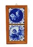 Charming framed Delft Blue ceramic tile artwork featuring two hand-painted scenes in traditional cobalt blue. Framed in wood with hanging loop and original “Delft Blue – Hand Painted Holland” label on back.