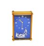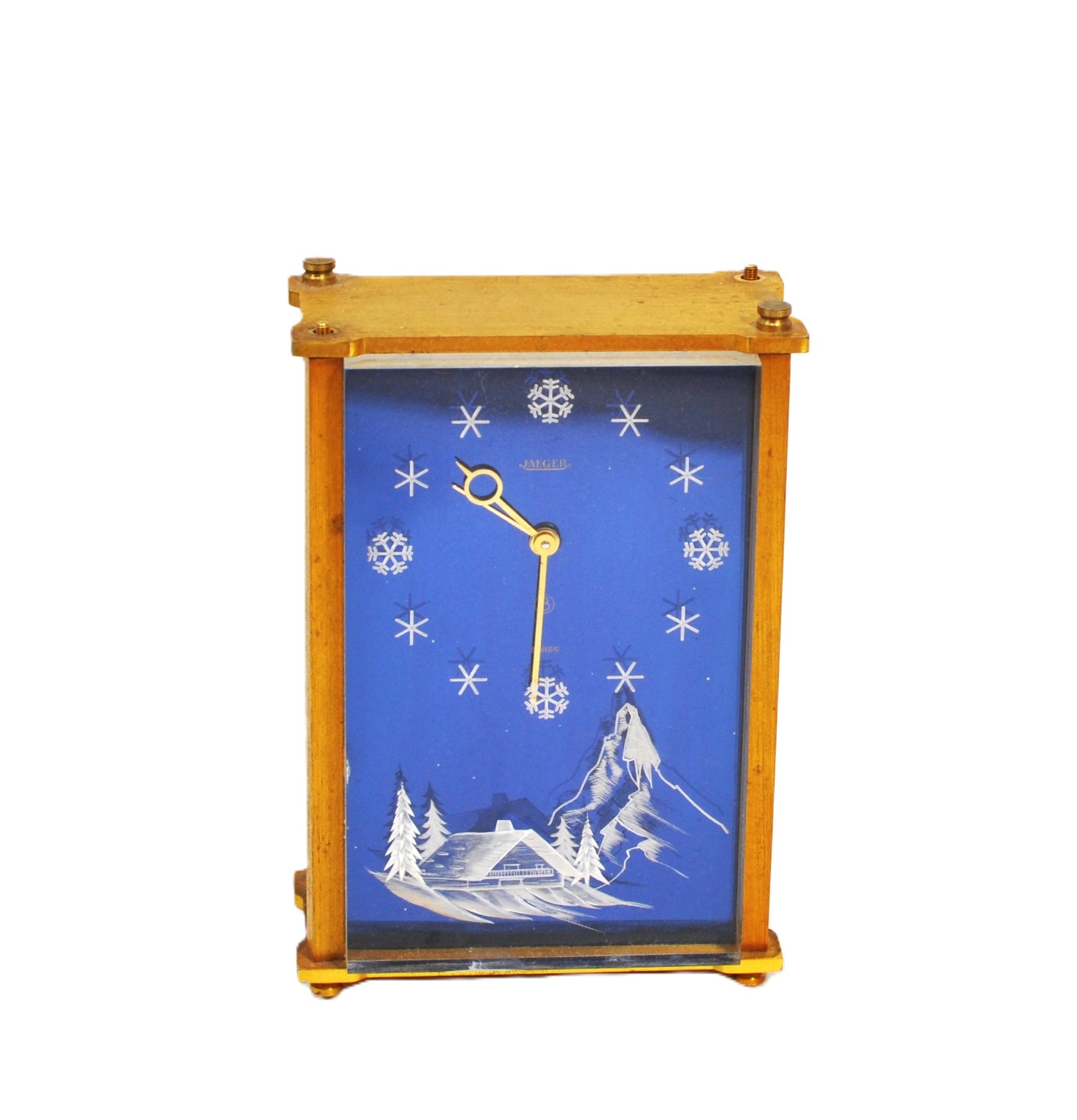Mid-century modern desk or shelf clock by Jaeger, featuring a vibrant blue dial etched with a snowy Alpine chalet scene, snowflakes, and star motifs. The gold-tone case encloses a mechanical 8-day movement, with controls marked for movement and alarm settings on the rear panel. The piece is signed "Jaeger" on the dial and "Swiss Made" at the base.