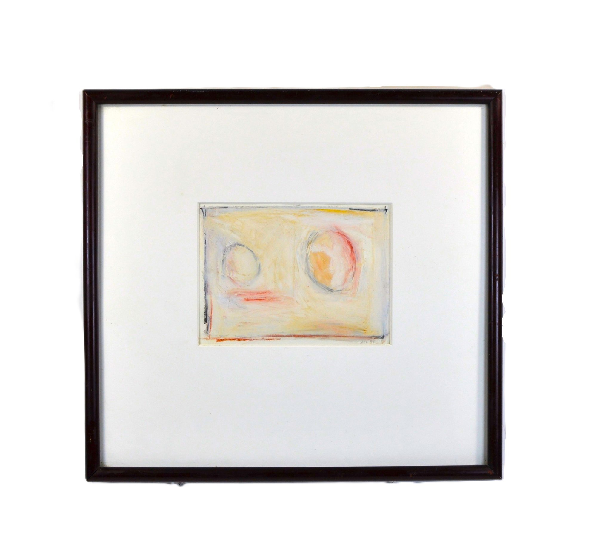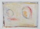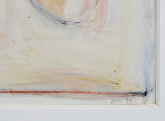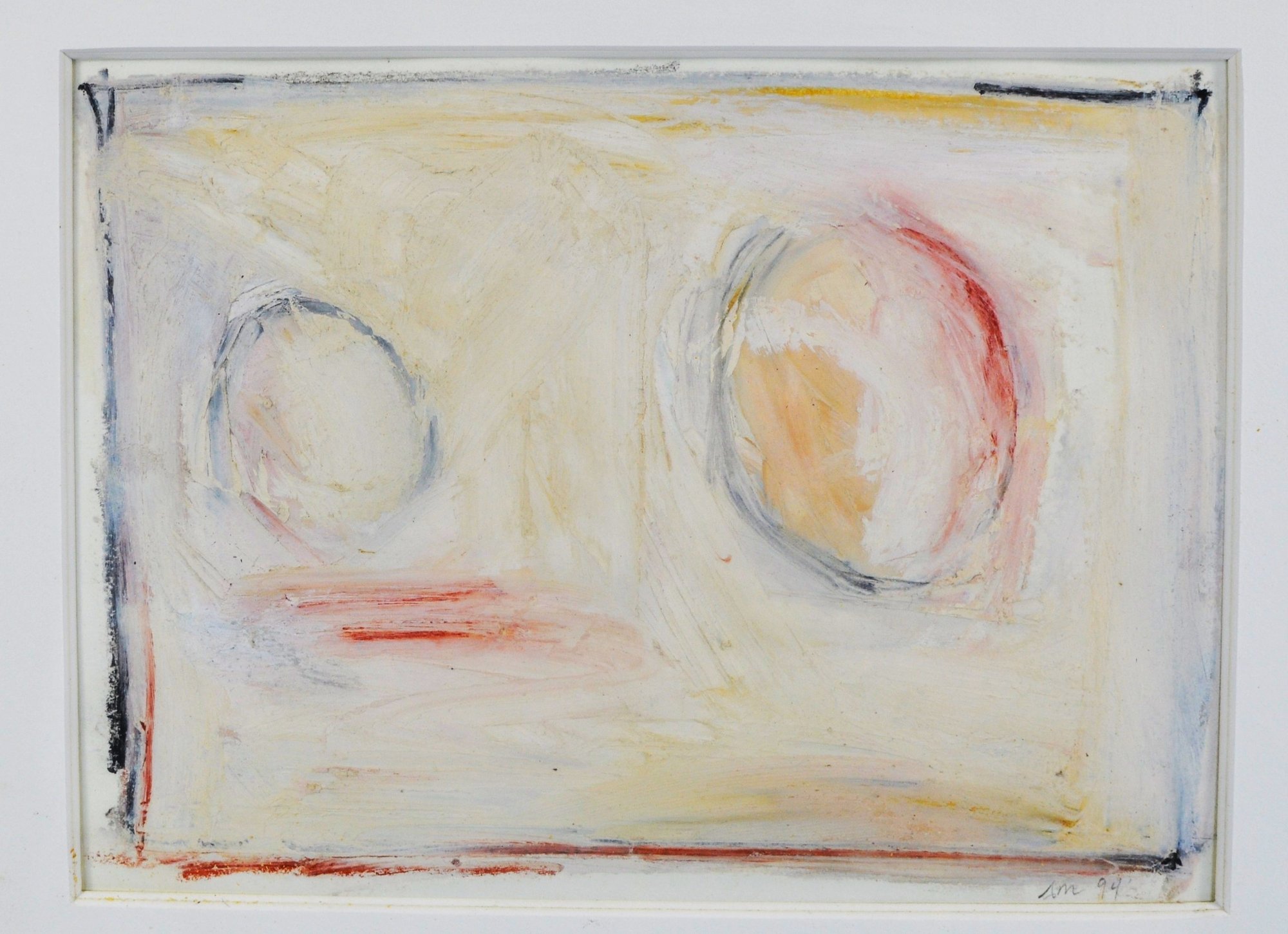Minimalist abstract composition with soft circular forms and layered pastel tones of cream, blue, and muted red. Executed in acrylic or oil. Signed and dated “AM ’94” lower right.